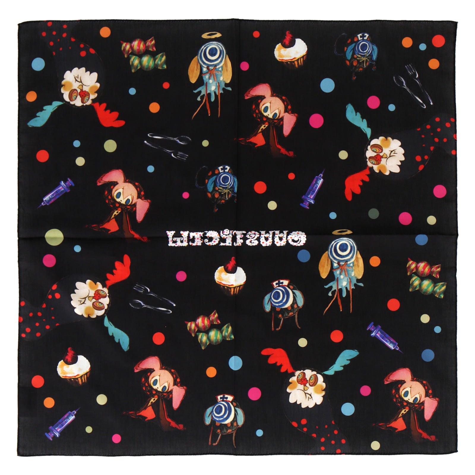 お菓子の魔女のプリントハンカチ。ダークでかわいい雰囲気が魅力的な一枚です。 ハンカチとしてはもちろん、ファッションアイテムとしてバッグや髪につけたりお部屋に飾ったりと、様々な使い方を楽しめる一枚です。
