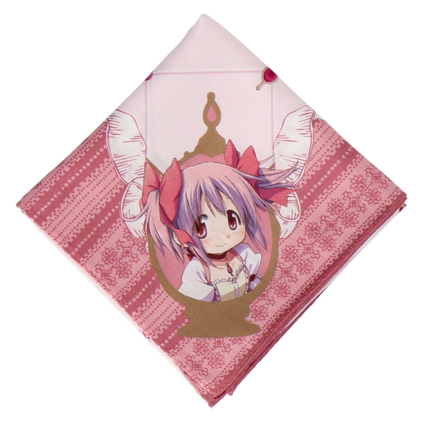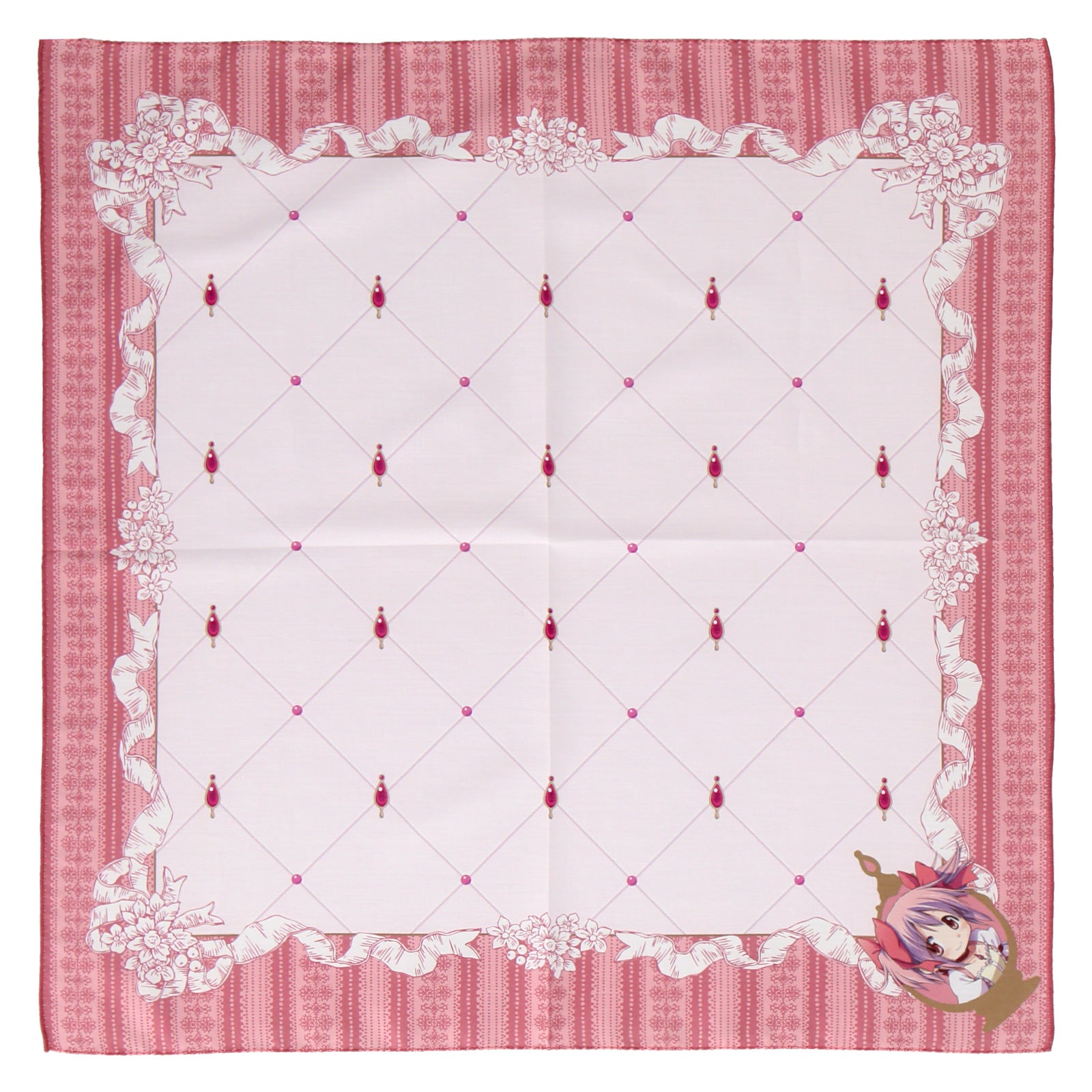 まどかのソウルジェムを格子状にデザインしたプリントハンカチ。リボンやお花の装飾が上品でかわいらしいデザインです。 ハンカチとしてはもちろん、ファッションアイテムとしてバッグや髪につけたりお部屋に飾ったりと、様々な使い方を楽しめます。