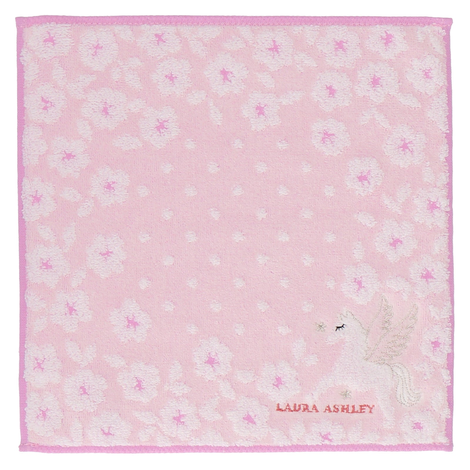 2026年の干支である午のタオルハンカチ。花柄にキラキラとした刺繍が施されたペガサスの組み合わせがロマンティックなデザインです。 新年の贈り物としても最適です。
