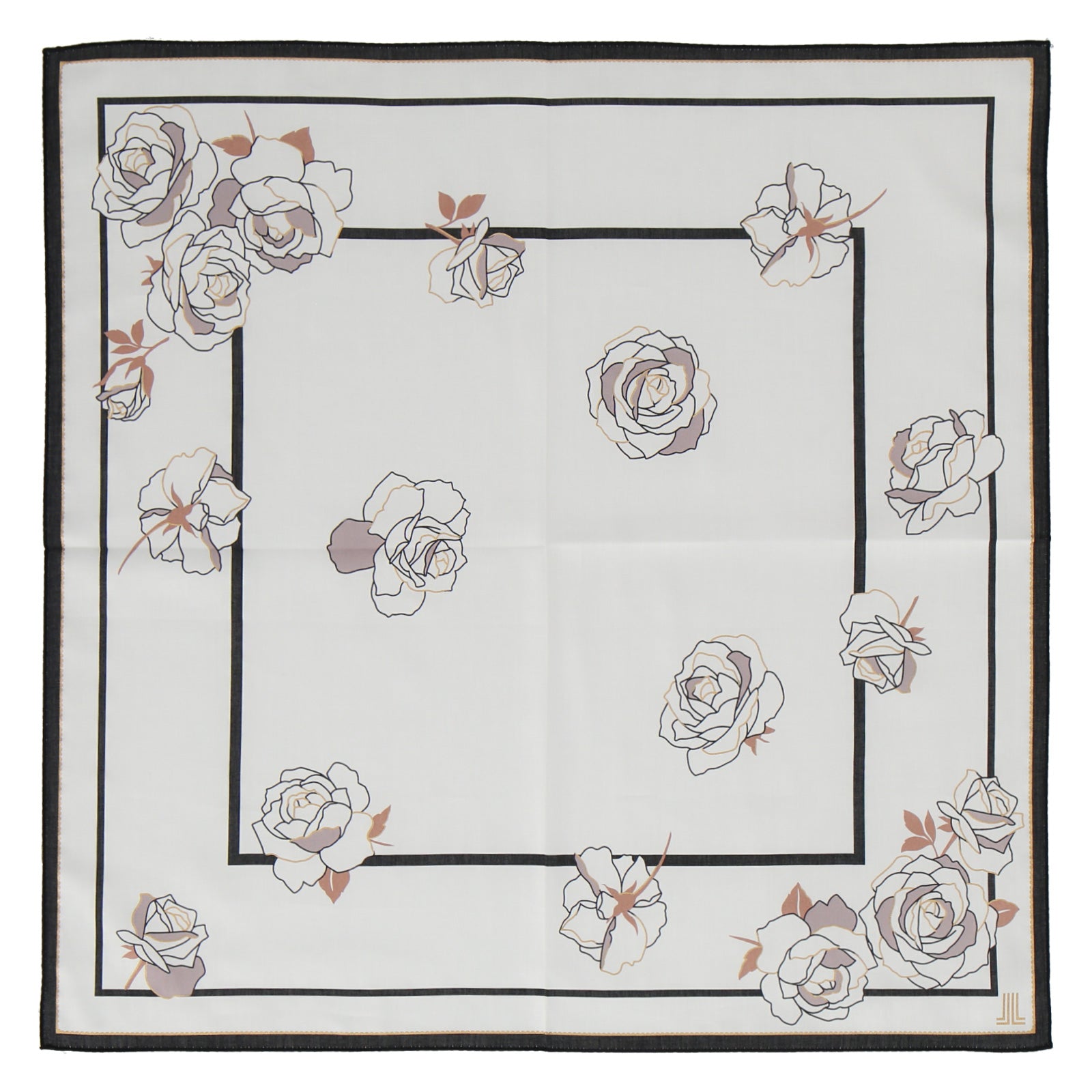 バラモチーフが全面にちりばめられたスタイリッシュなハンカチ。 58cmの大判サイズハンカチになります。 使いやすいサイズ感のハンカチは自分用にもギフトとしてもおすすめです。