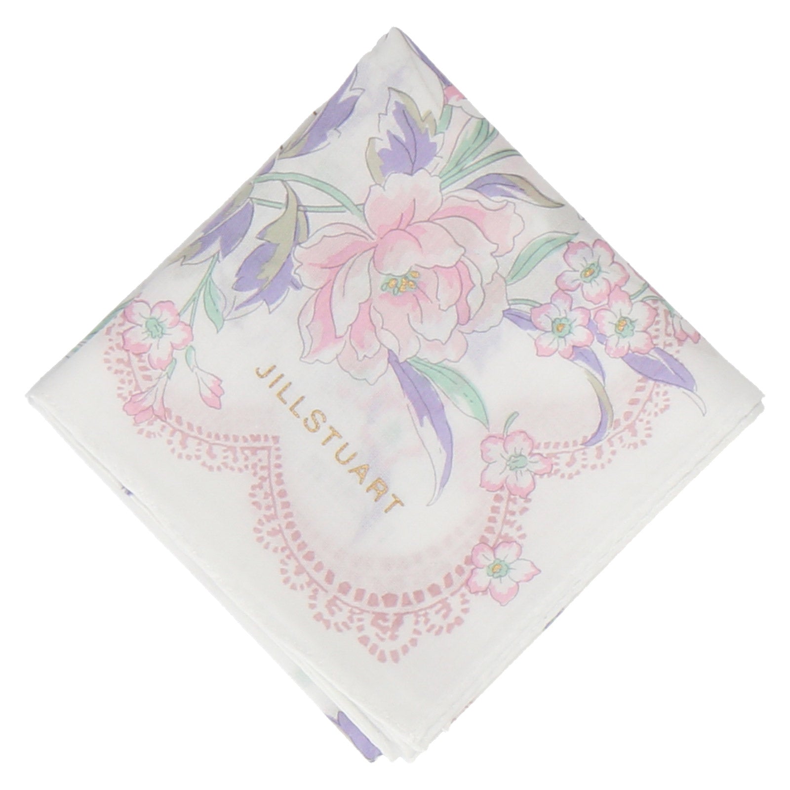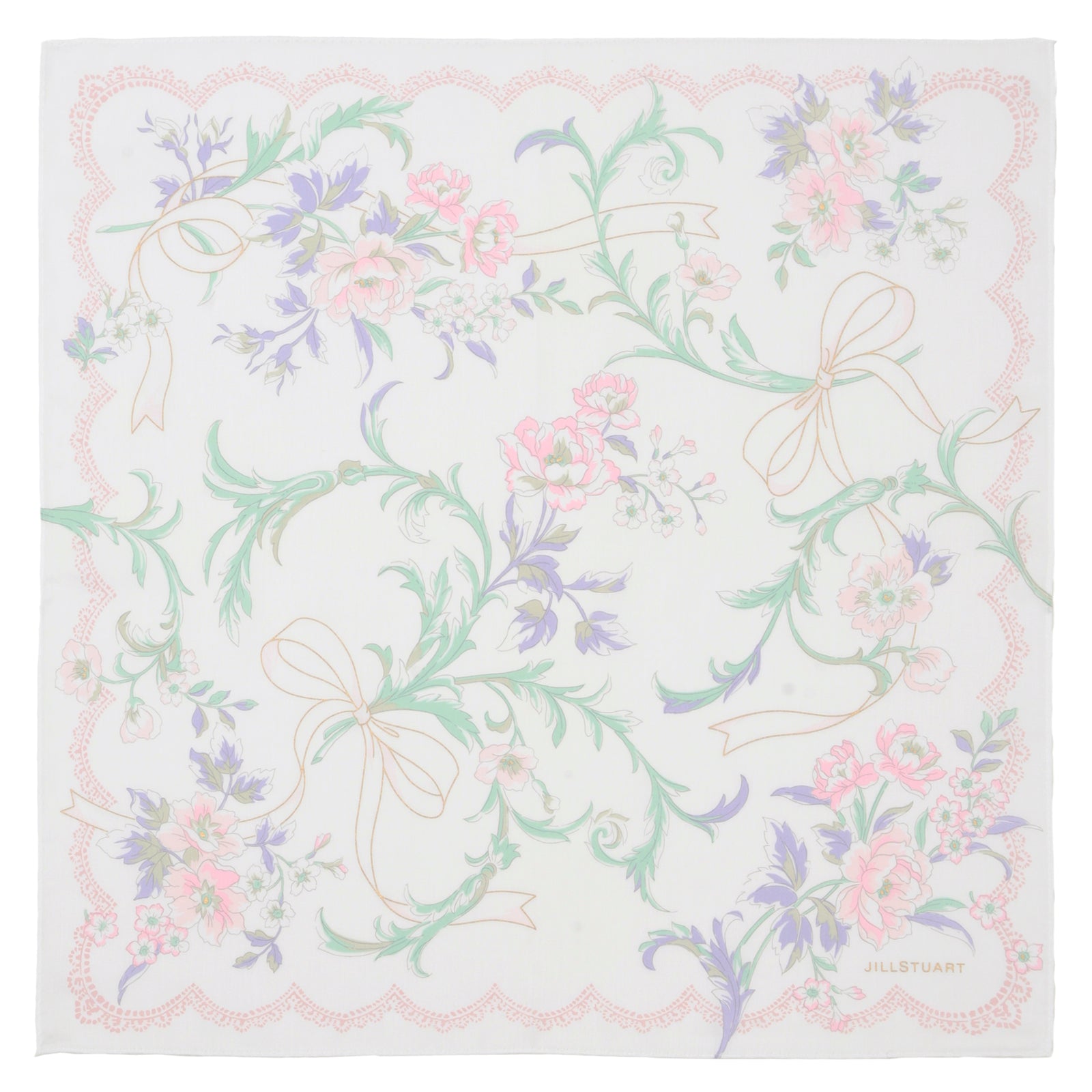 優しいカラーと繊細な糸目タッチで描かれた花とリボンの組み合わせが素敵なプリントハンカチ。プレゼントにもお勧めな一枚です。