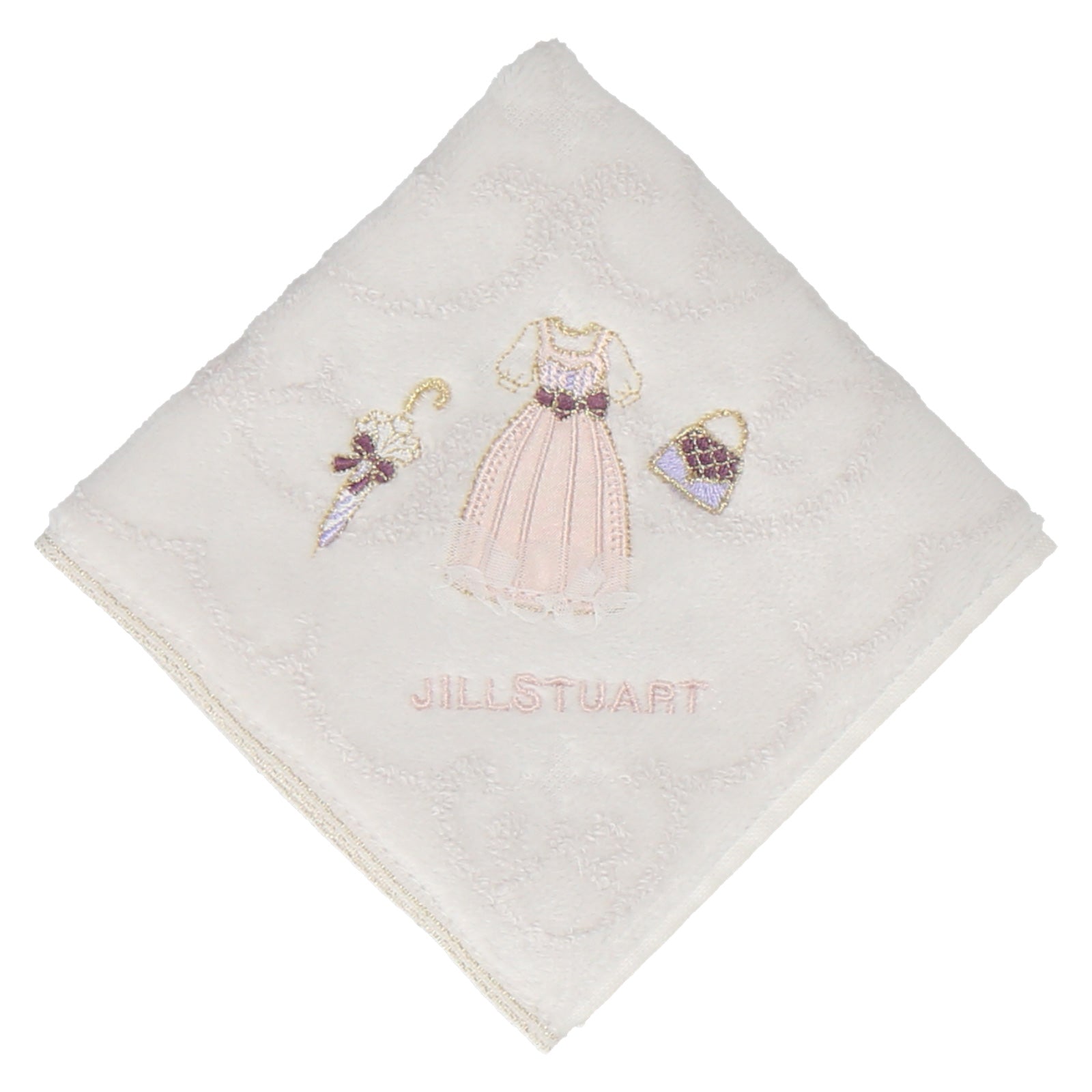 サテンやチュール生地を使ってアップリケ刺繍をしたドレスモチーフが素敵なタオルハンカチ。プレゼントにもおすすめなです。
