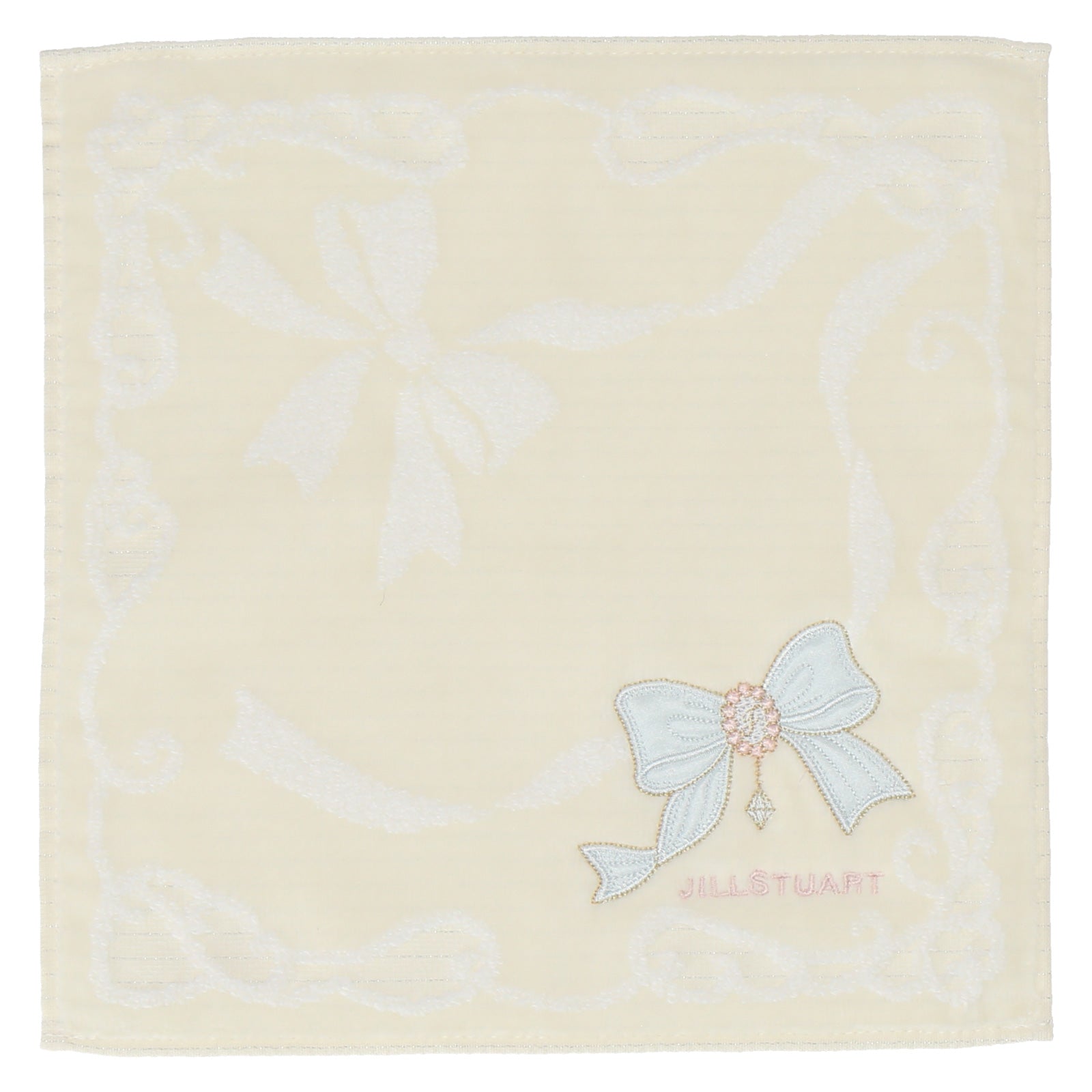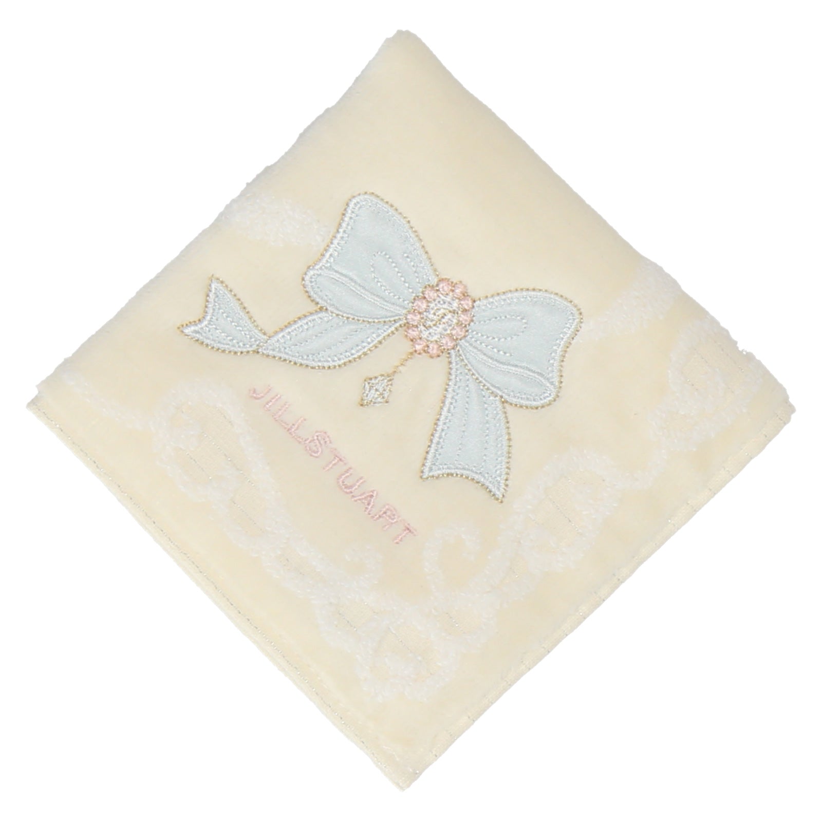 大きなリボンのアップリケ刺繍が華やかなデザインのタオルハンカチ。プレゼントにもおすすめです。
