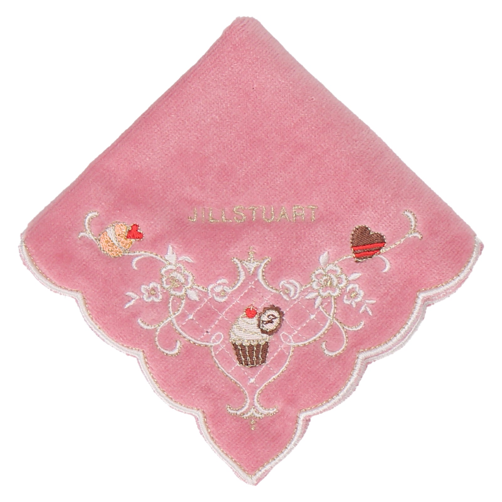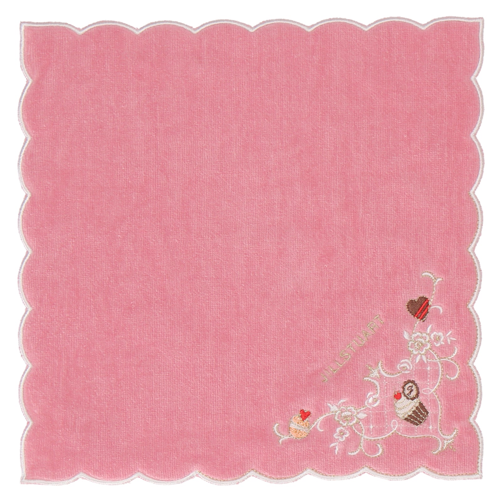 豪華なスカラップ刺繍と上品で大人かわいい甘さが魅力のスイーツ柄のタオルハンカチです。プレゼントにもおすすめです。