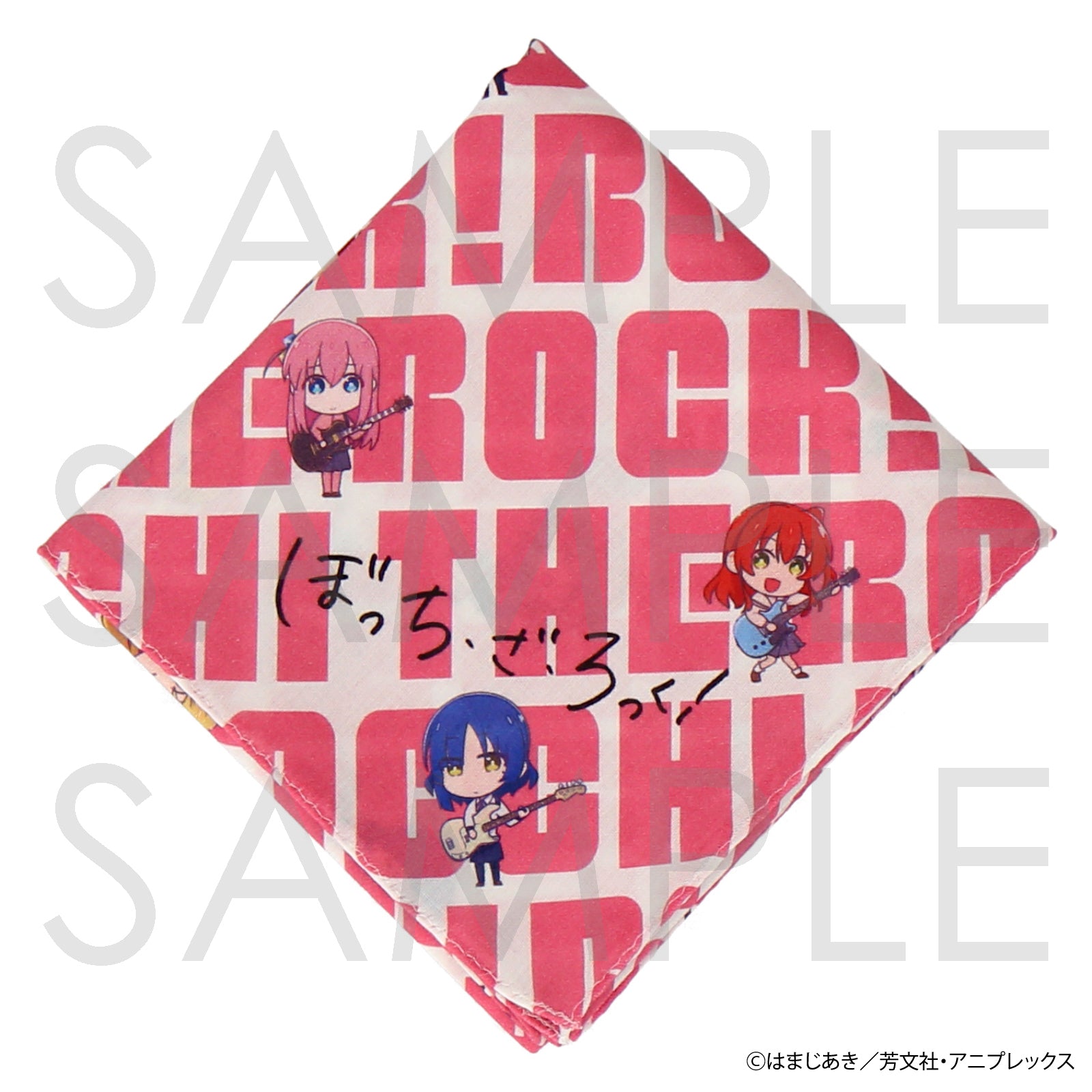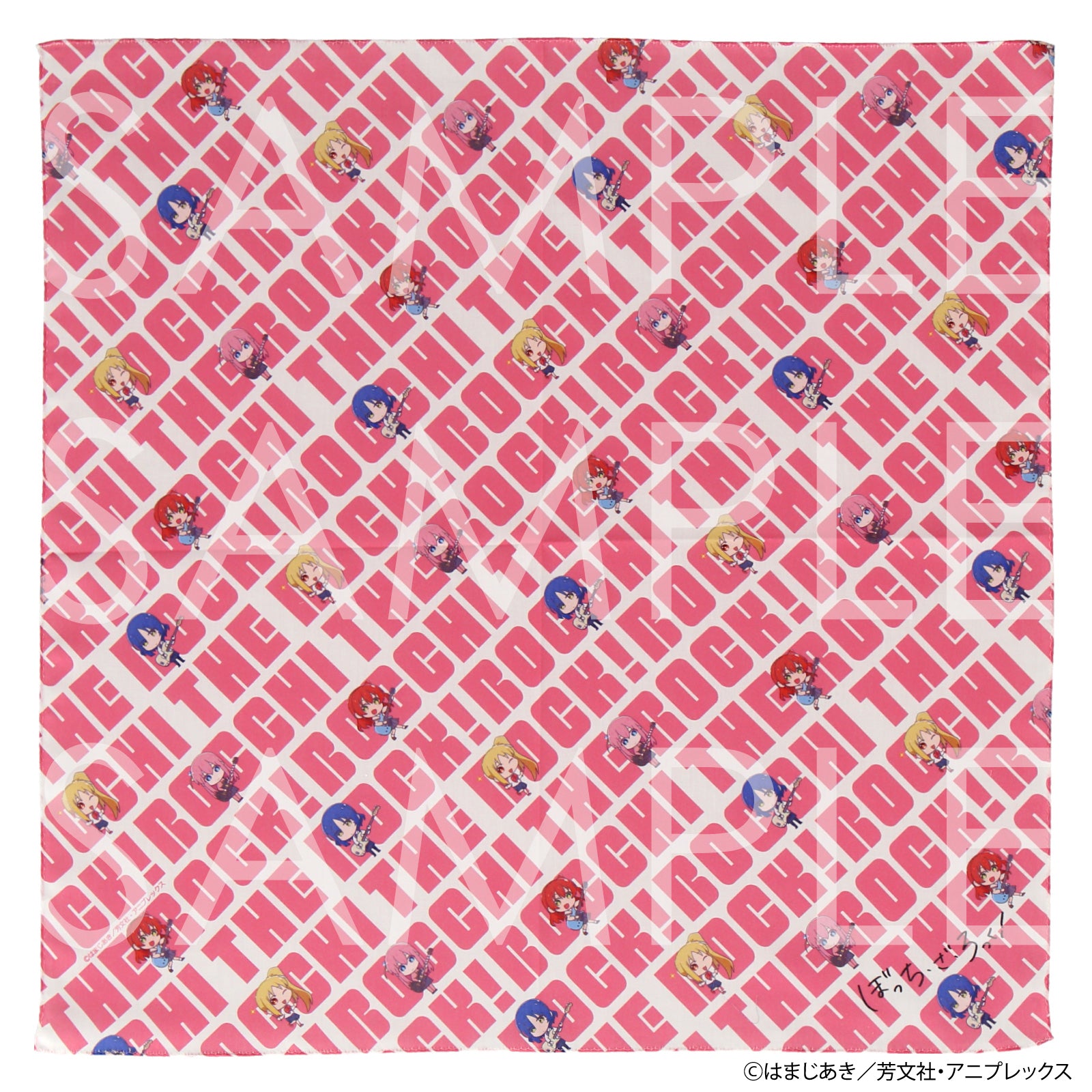 結束バンドのメンバー4人のデフォルメイラストと BOCCHI THE ROCK!のロゴ総柄がかわいいプリントハンカチ。 ハンカチとしてはもちろん、バッグにつけたりお部屋に飾ったりと、様々な使い方を楽しめる一枚です。