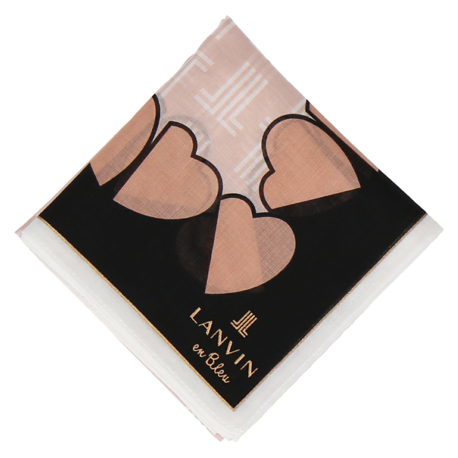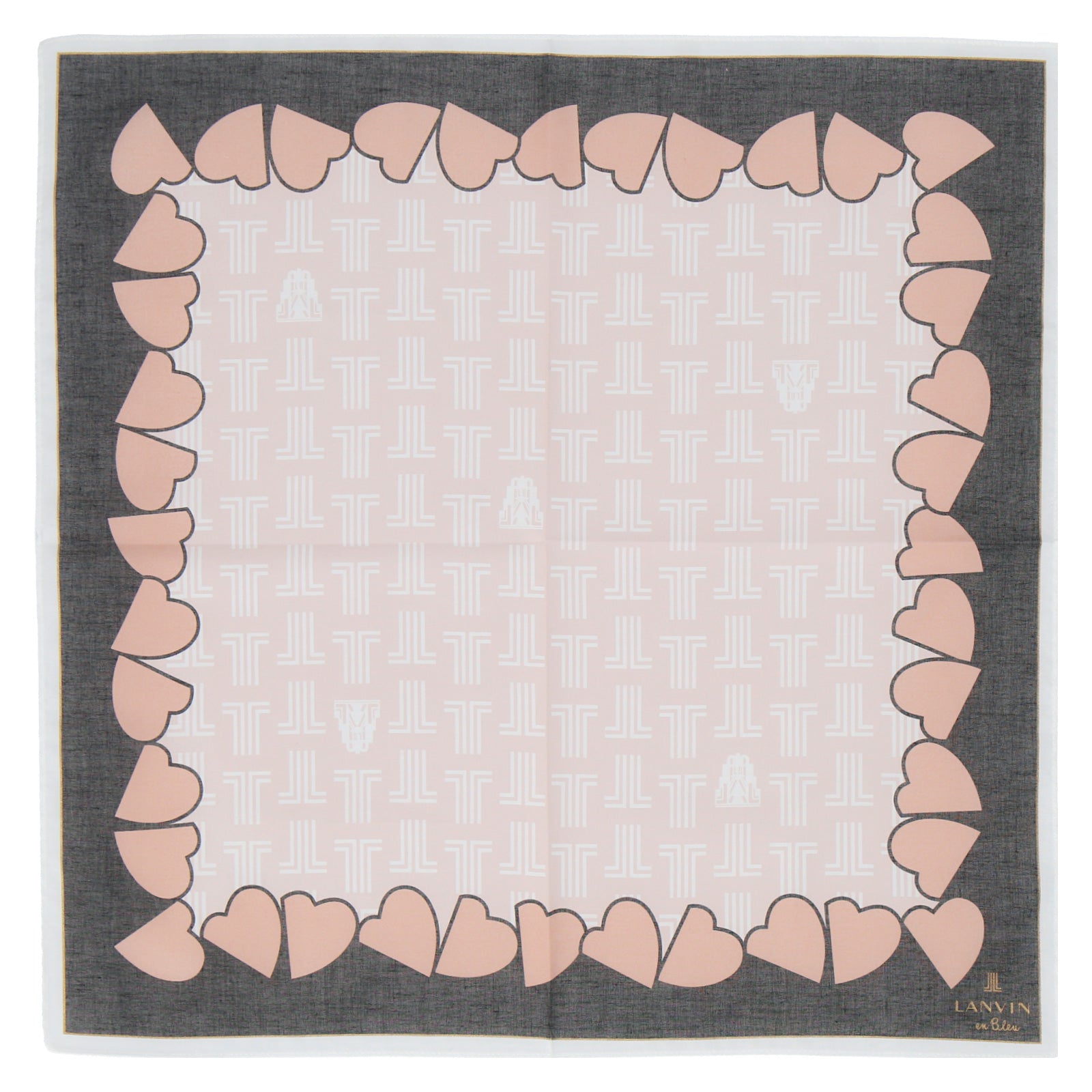 フレーム上に並んだカッティングハートの中に「ダブルJLマーク」の総柄がデザインされたプリントハンカチ。 総柄の中には、アールデコ建築からイメージされたモチーフを取り入れています。