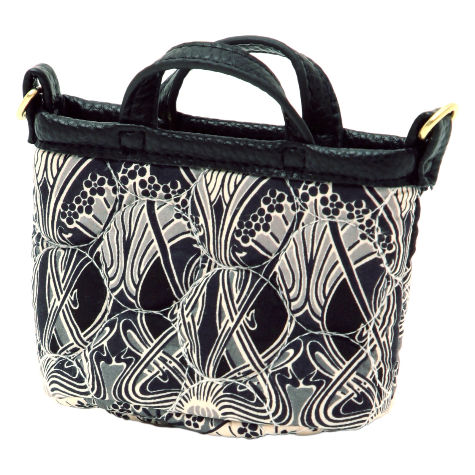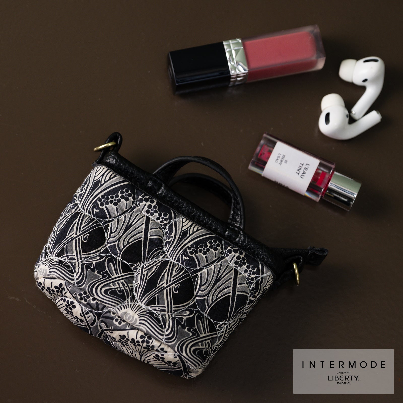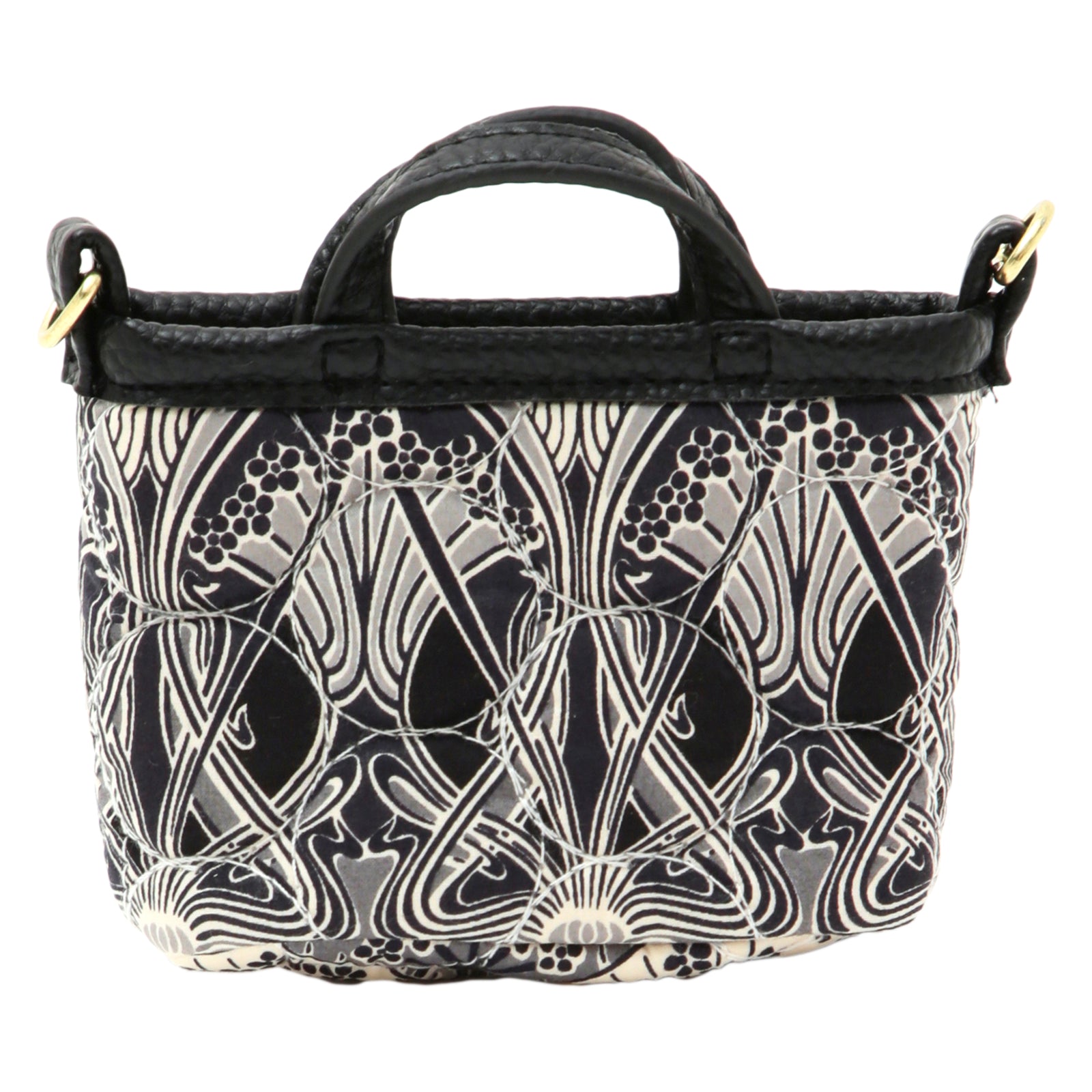 リバティプリントのタナローン生地を使用した、ミニバッグ型チャームポーチです。アクセントとして、バッグ開口部の縁取りとハンドルにシックな合皮を付けました。 小銭、イヤホンケース、リップ、鍵、目薬、常備薬など小さなものをすぐ取り出すのに便利です。また、ICカードもそのまま収納できるので、バッグに付けたままスマートにご使用いただけます。