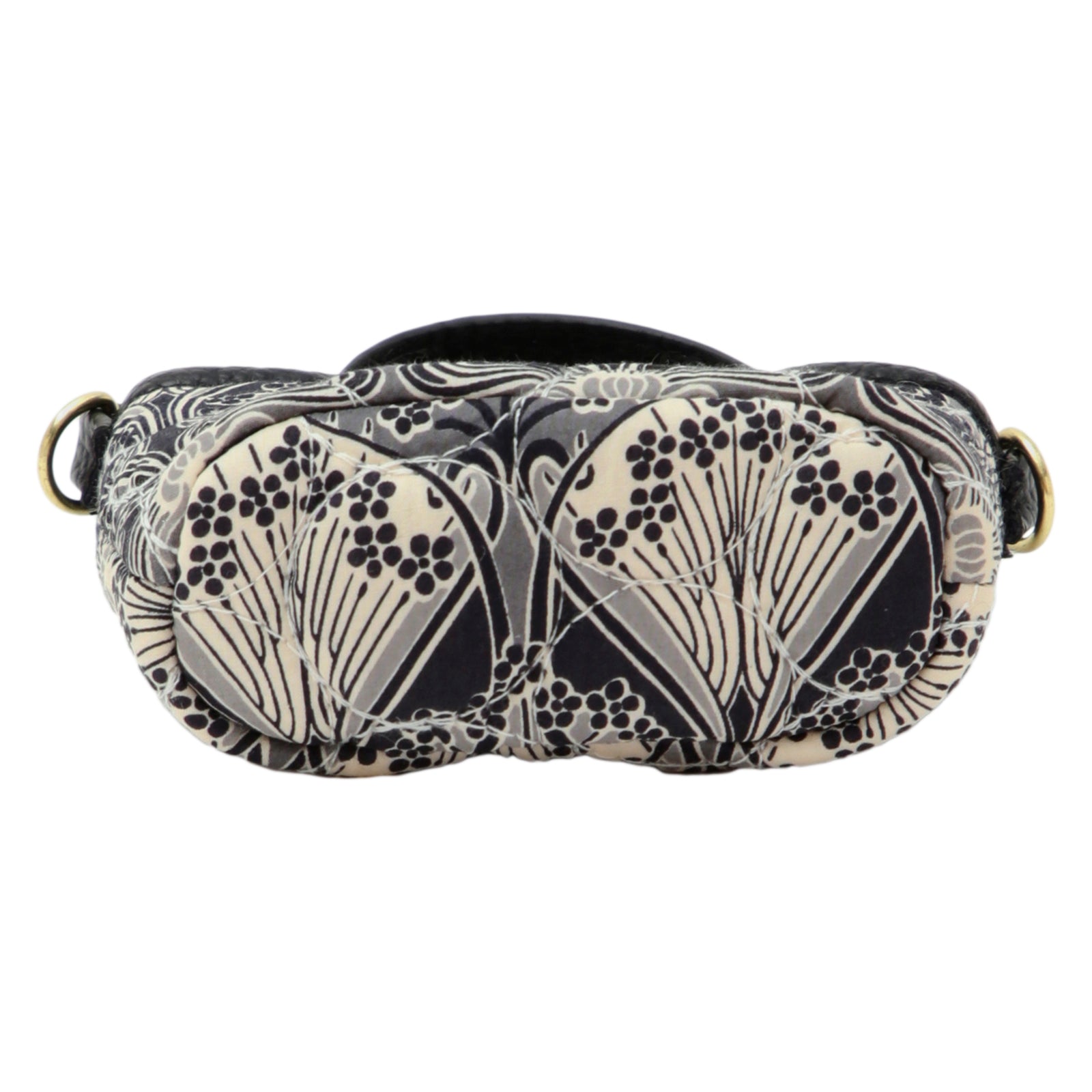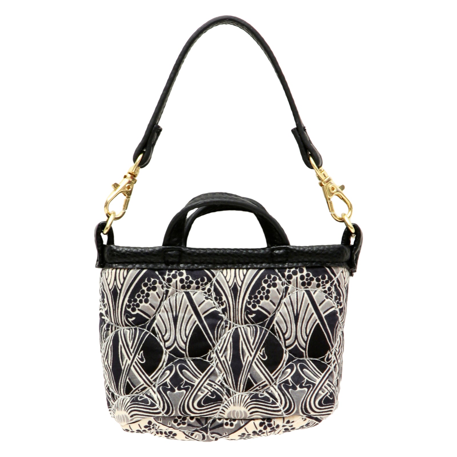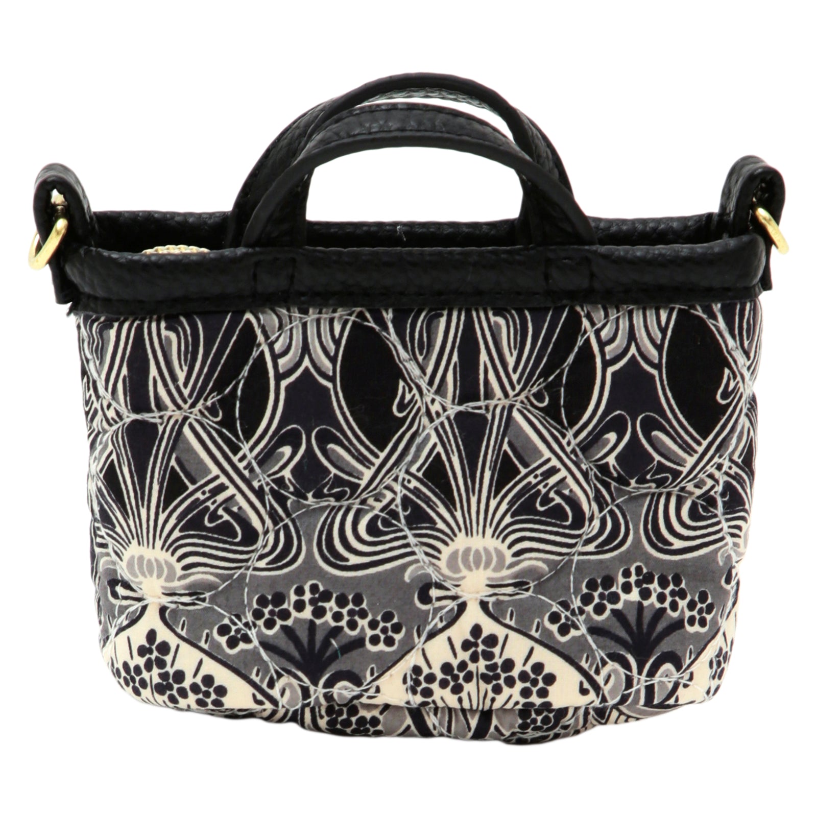 リバティプリントのタナローン生地を使用した、ミニバッグ型チャームポーチです。アクセントとして、バッグ開口部の縁取りとハンドルにシックな合皮を付けました。 小銭、イヤホンケース、リップ、鍵、目薬、常備薬など小さなものをすぐ取り出すのに便利です。また、ICカードもそのまま収納できるので、バッグに付けたままスマートにご使用いただけます。
