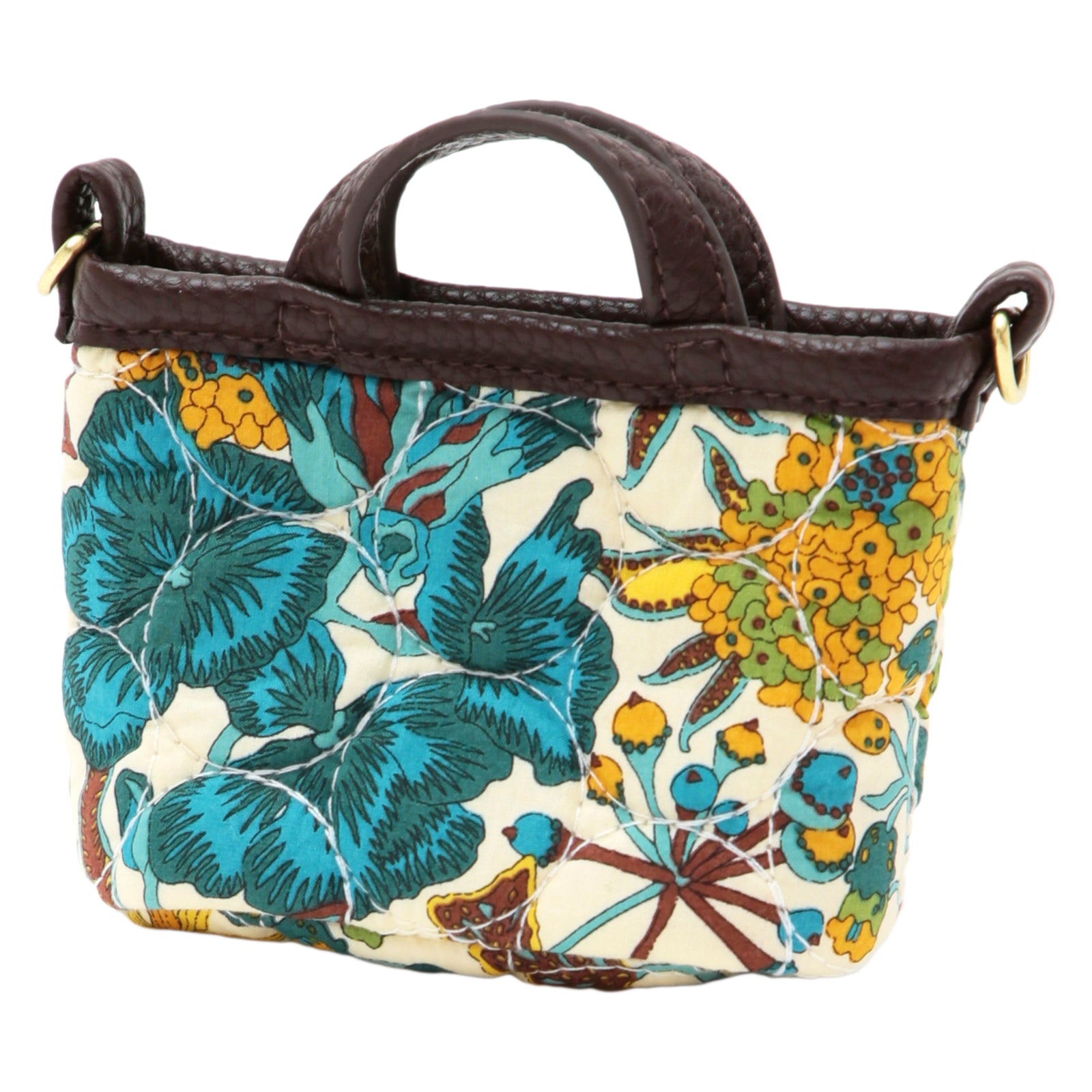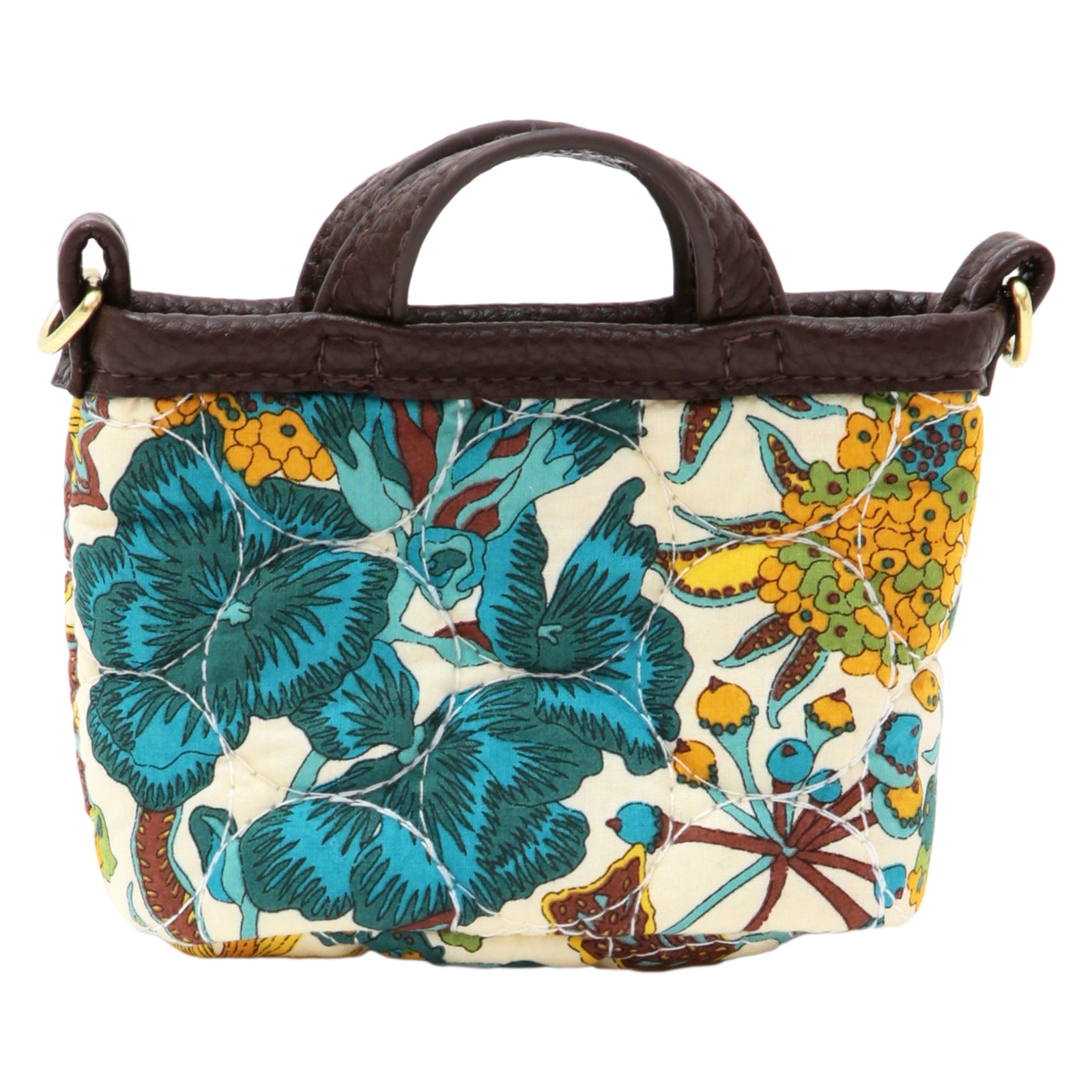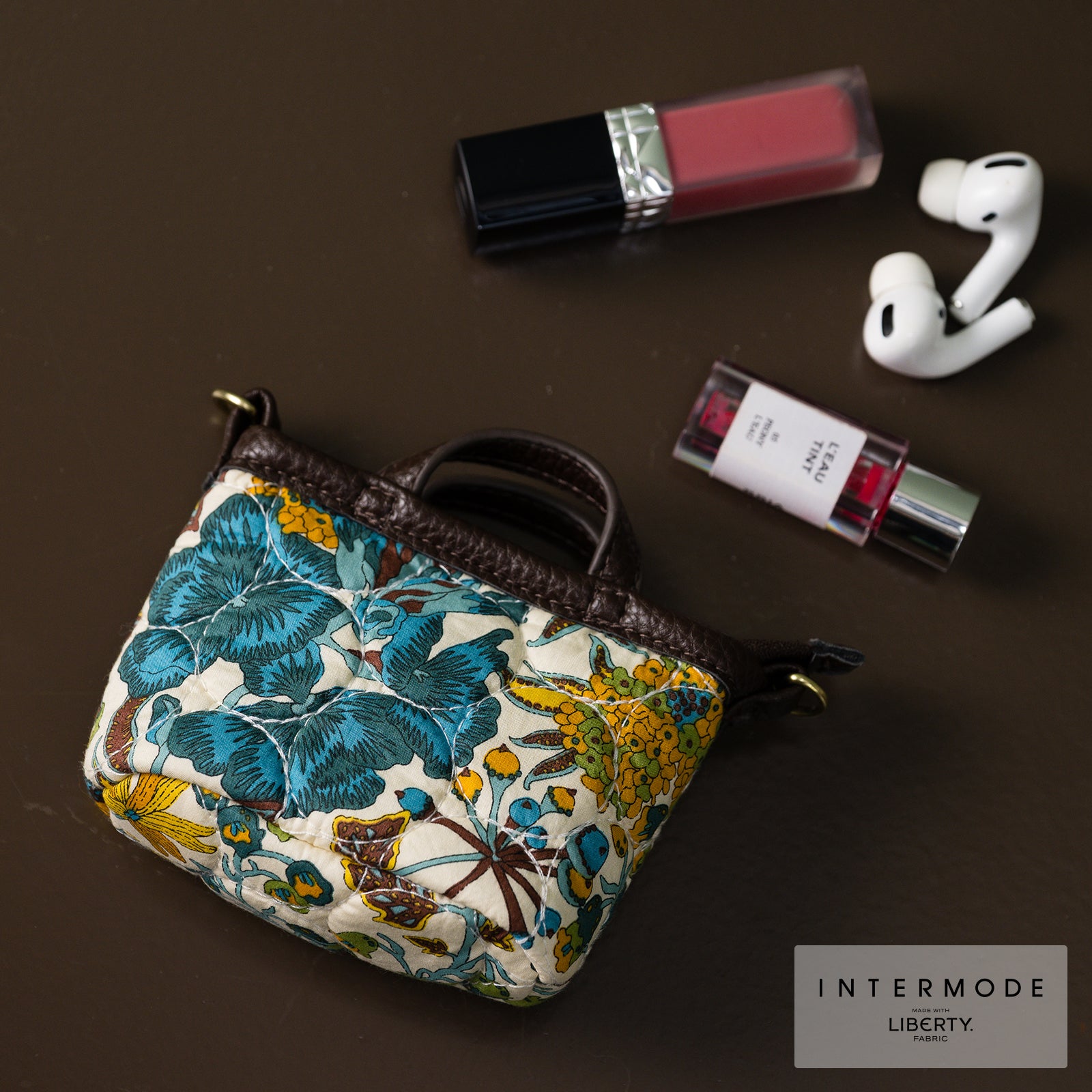 リバティプリントのタナローン生地を使用した、ミニバッグ型チャームポーチです。アクセントとして、バッグ開口部の縁取りとハンドルにシックな合皮を付けました。 小銭、イヤホンケース、リップ、鍵、目薬、常備薬など小さなものをすぐ取り出すのに便利です。また、ICカードもそのまま収納できるので、バッグに付けたままスマートにご使用いただけます。