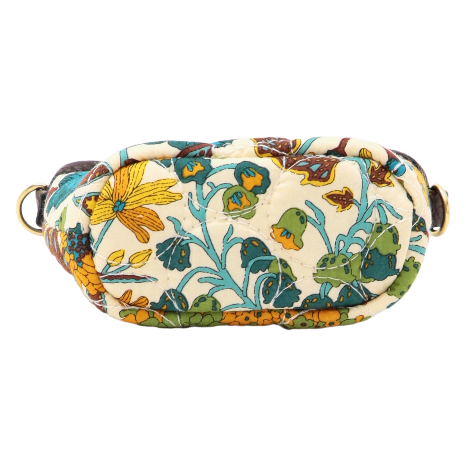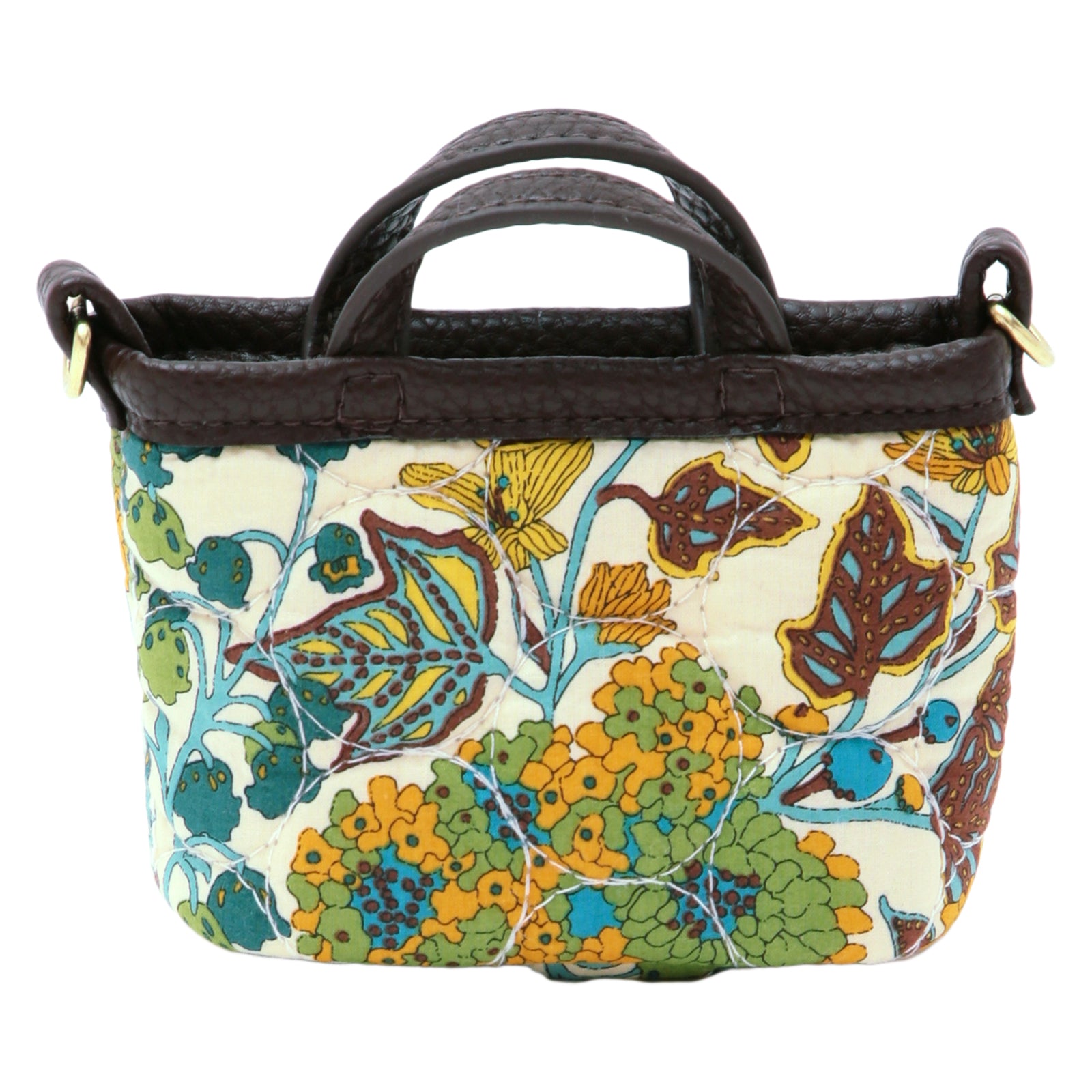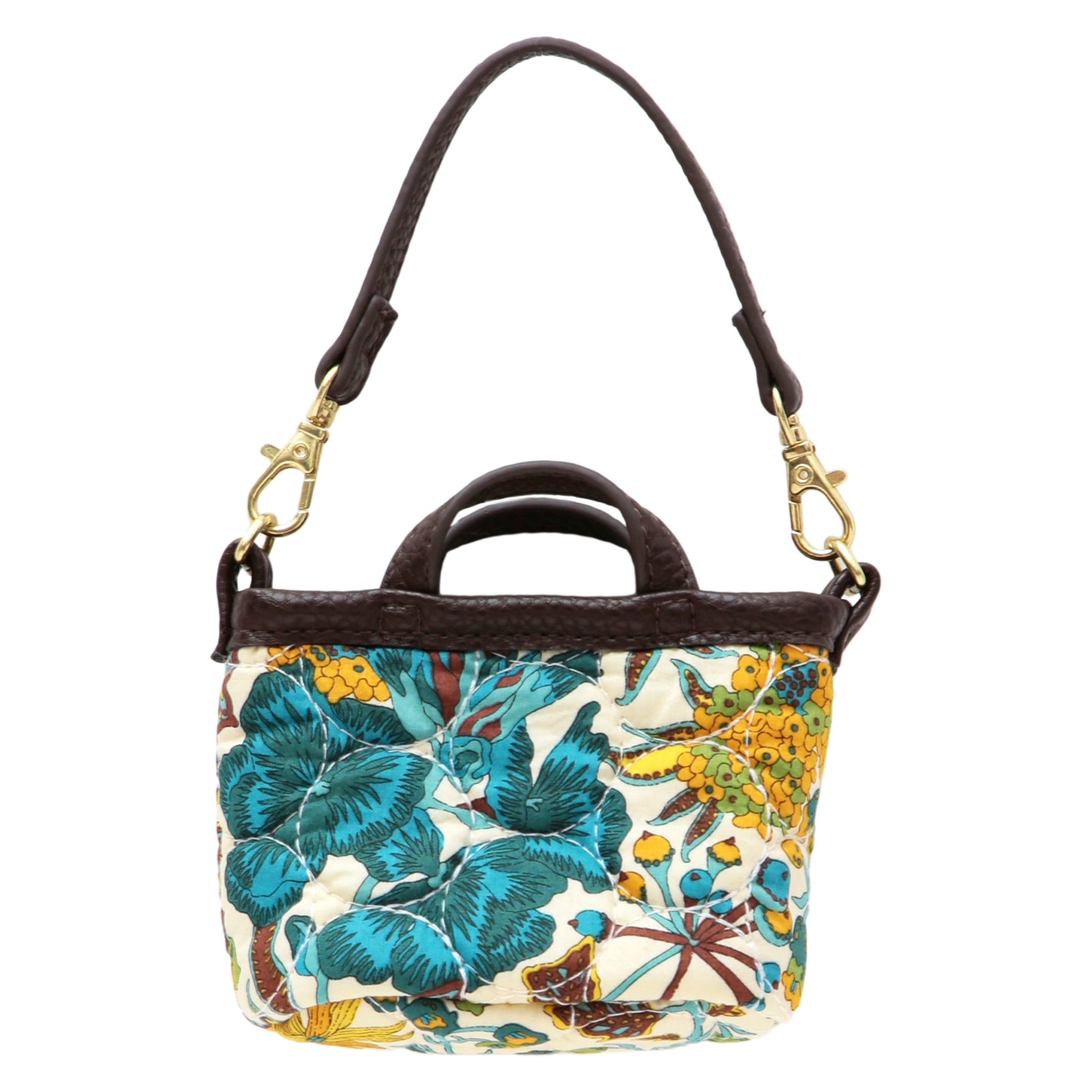 リバティプリントのタナローン生地を使用した、ミニバッグ型チャームポーチです。アクセントとして、バッグ開口部の縁取りとハンドルにシックな合皮を付けました。 小銭、イヤホンケース、リップ、鍵、目薬、常備薬など小さなものをすぐ取り出すのに便利です。また、ICカードもそのまま収納できるので、バッグに付けたままスマートにご使用いただけます。