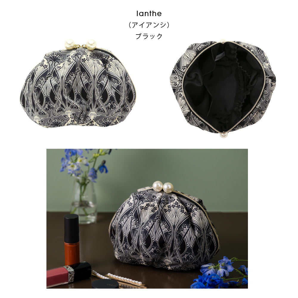 リバティプリントのタナローン生地を使用した、ファスナーのパールが大ぶりでかわいいデザインのポーチ。見た目以上の容量と、大きく使いやすい形状がポイントです。4つのオープンポケットを備えており、細かいアイテムの収納に便利です。
