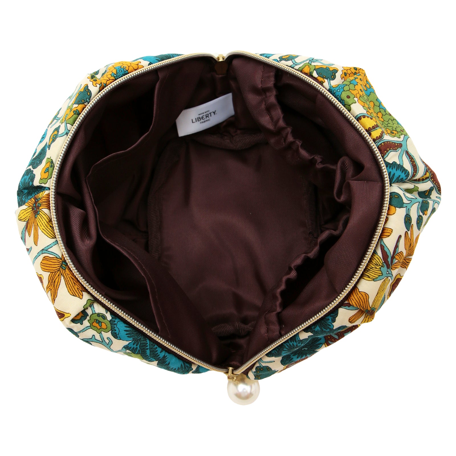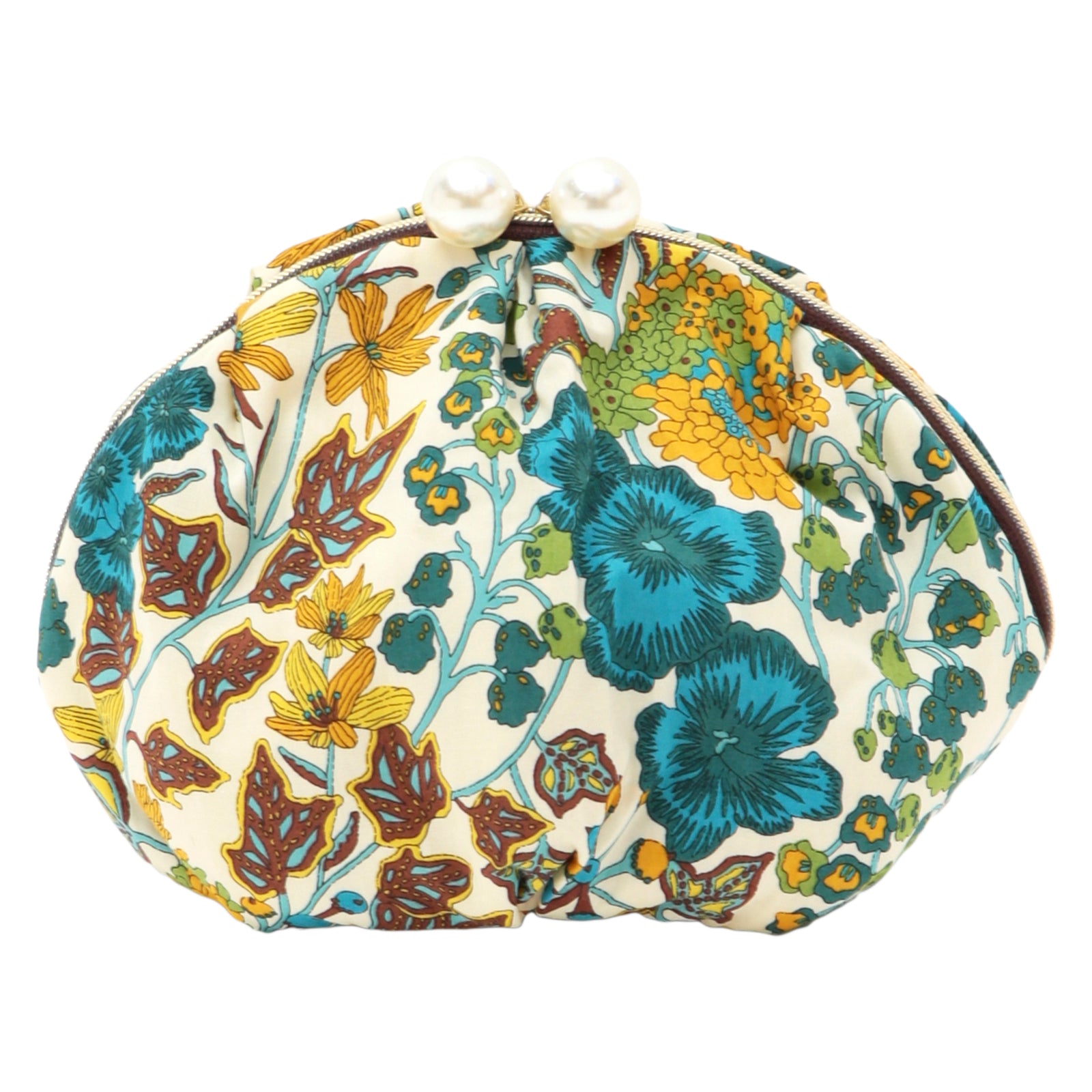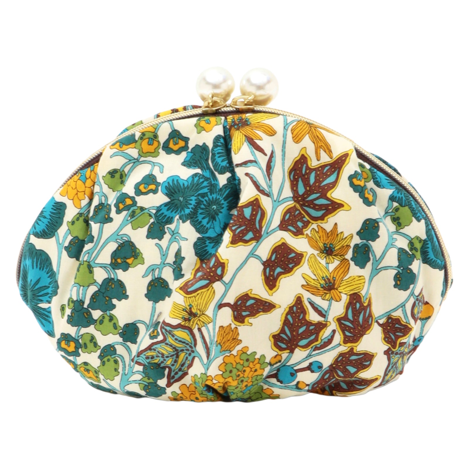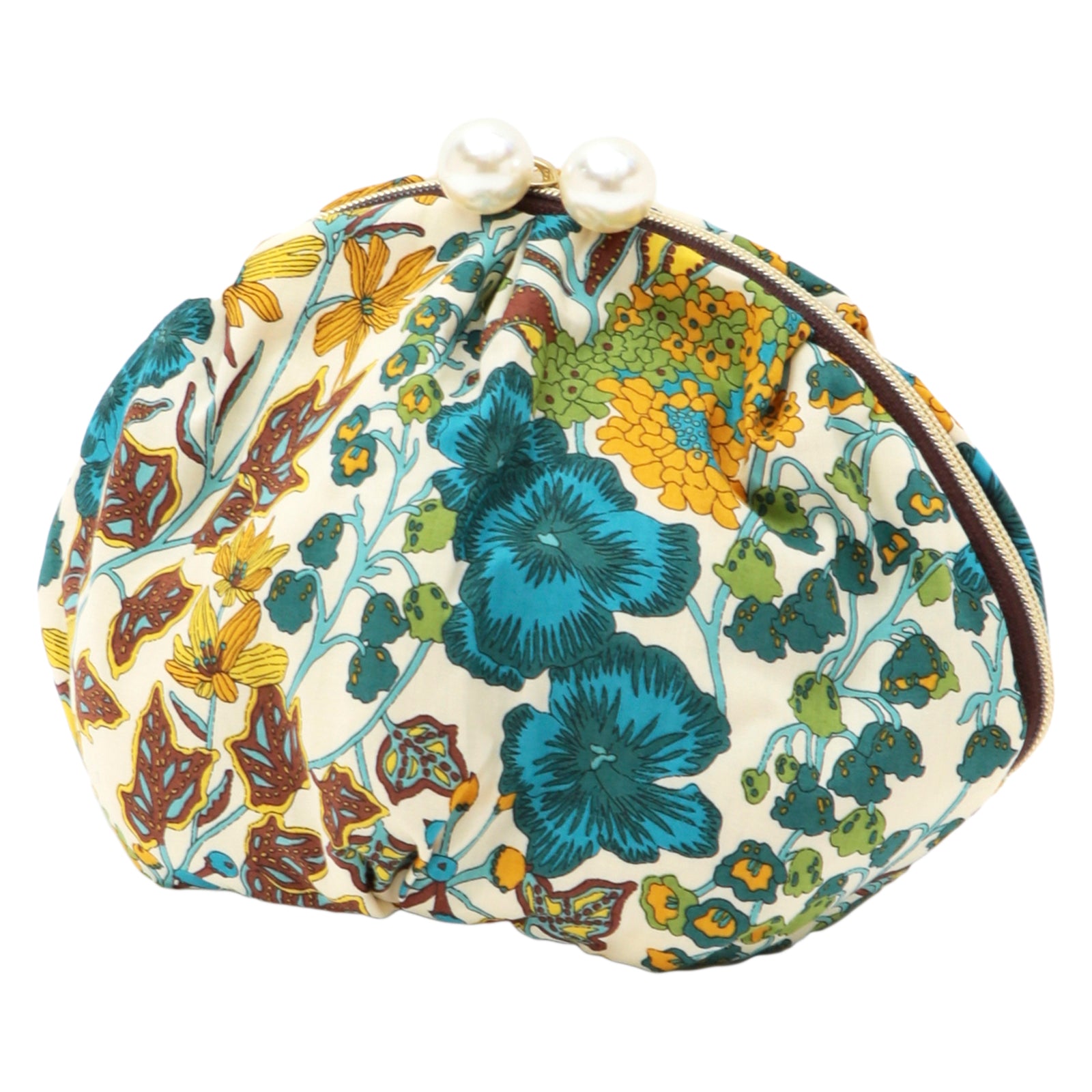 リバティプリントのタナローン生地を使用した、ファスナーのパールが大ぶりでかわいいデザインのポーチ。見た目以上の容量と、大きく使いやすい形状がポイントです。4つのオープンポケットを備えており、細かいアイテムの収納に便利です。