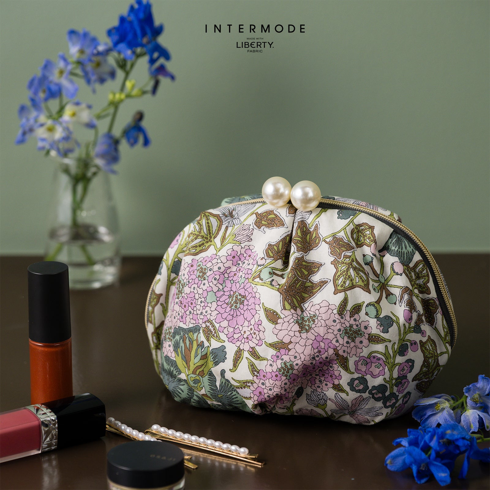 リバティプリントのタナローン生地を使用した、ファスナーのパールが大ぶりでかわいいデザインのポーチ。見た目以上の容量と、大きく使いやすい形状がポイントです。4つのオープンポケットを備えており、細かいアイテムの収納に便利です。