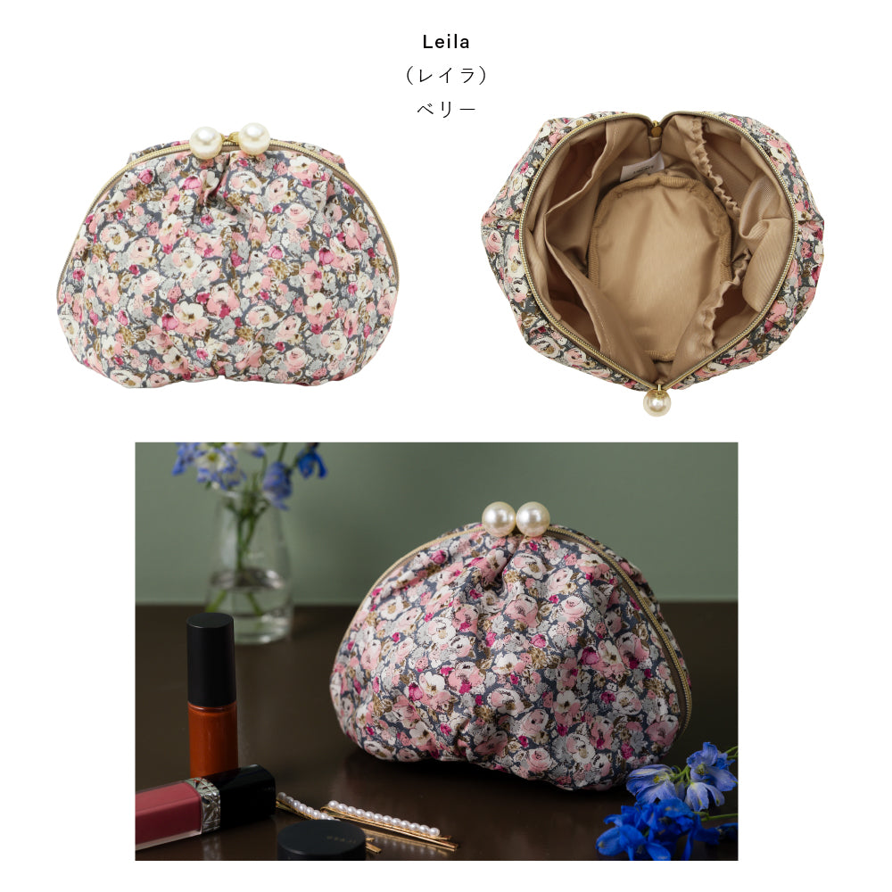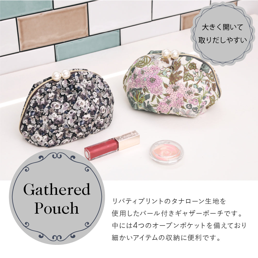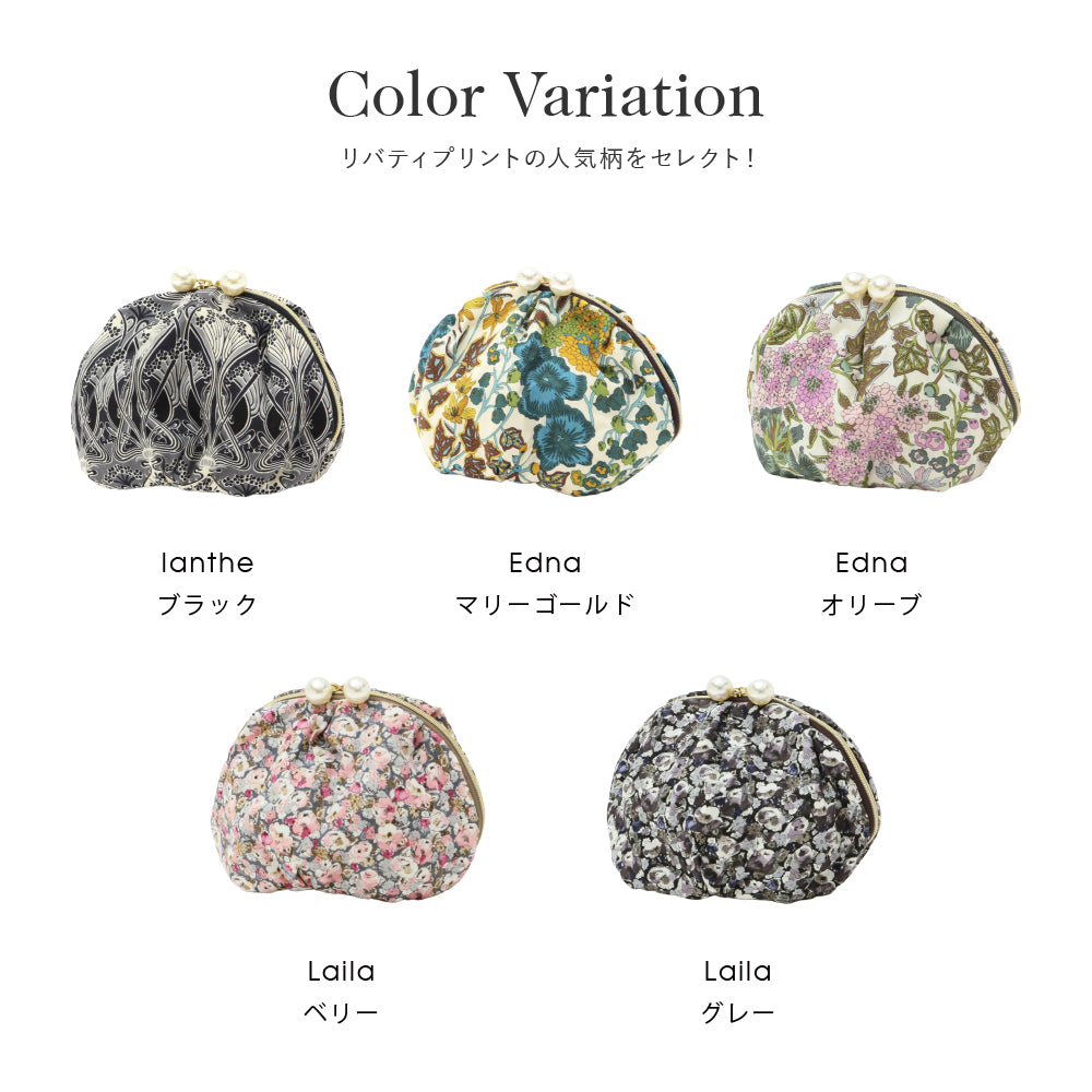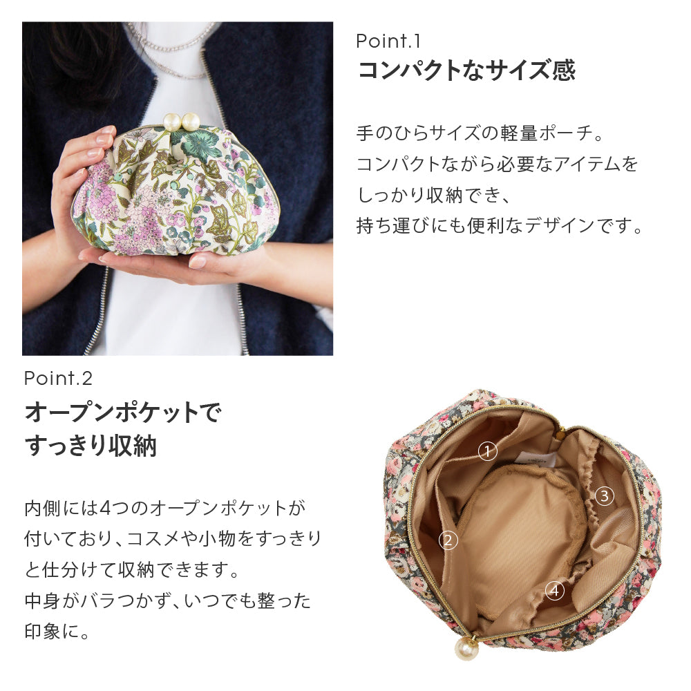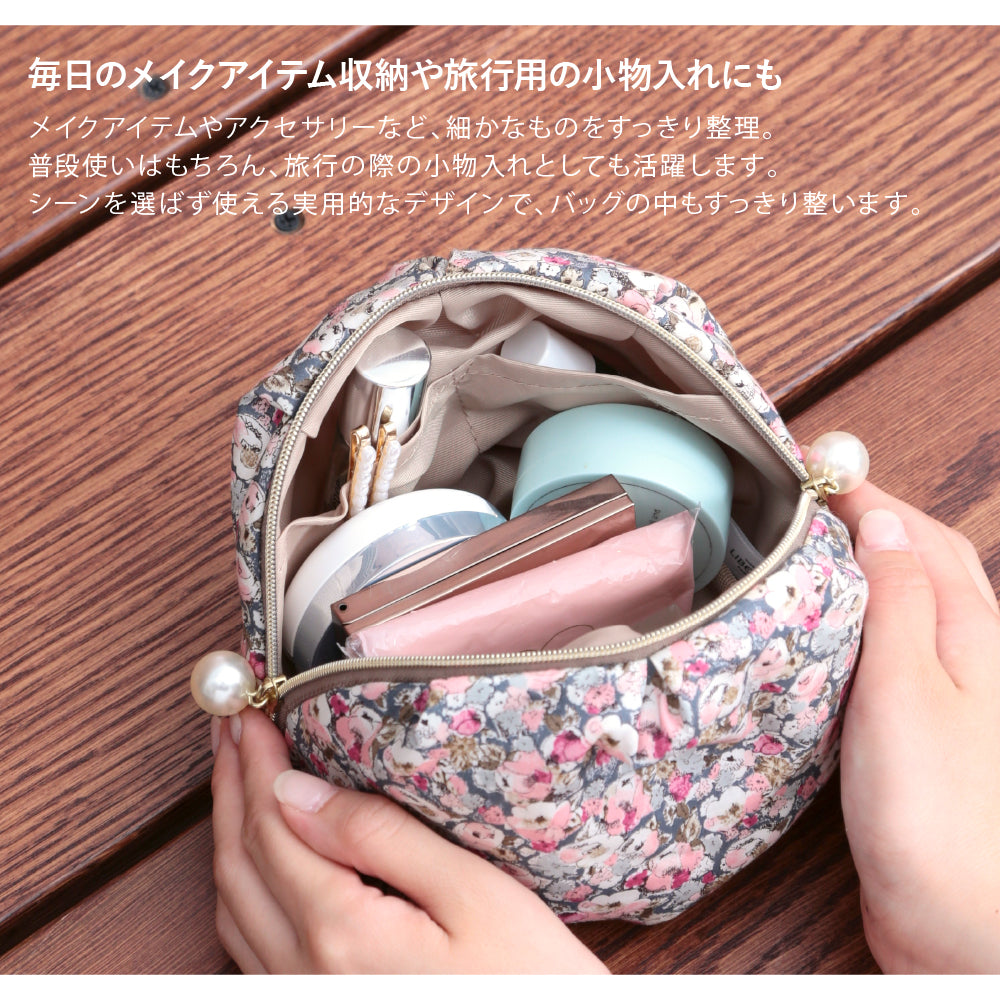 リバティプリントのタナローン生地を使用した、ファスナーのパールが大ぶりでかわいいデザインのポーチ。見た目以上の容量と、大きく使いやすい形状がポイントです。4つのオープンポケットを備えており、細かいアイテムの収納に便利です。