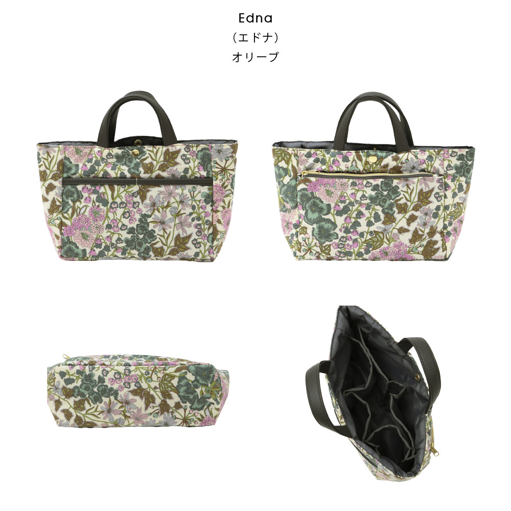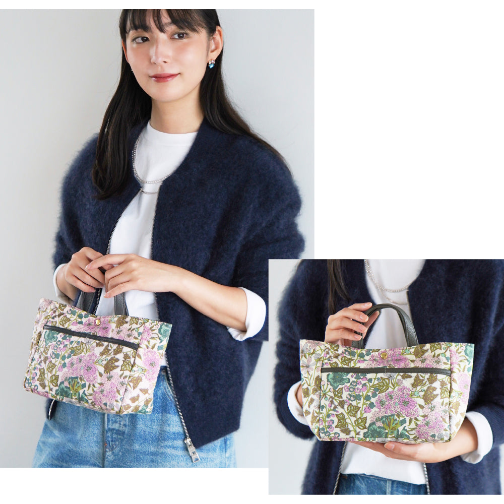 リバティプリントのタナローン生地を使用した、バッグの中身をすっきり整理できるバッグインバッグです。 大小さまざまなポケットが付いているので、小物を効率的に収納できます。 いつも持ち歩くアイテムをこのバッグインバッグにまとめておけば、コーディネートや気分によってバックを変える時にも、そのまま差し替えるだけで、忘れ物の心配がなく、とても便利です。 外側にはオープンポケットが2つとファスナーポケットが1つ、内側には計5つのオープンポケットを備えており、その中の1つは350mlのペットボトルが入るスクエアポケット、残りの4つも厚みのあるものも入れられるポケットになっています。