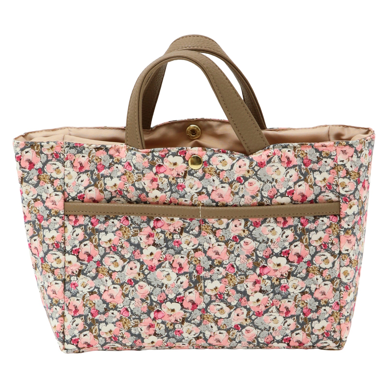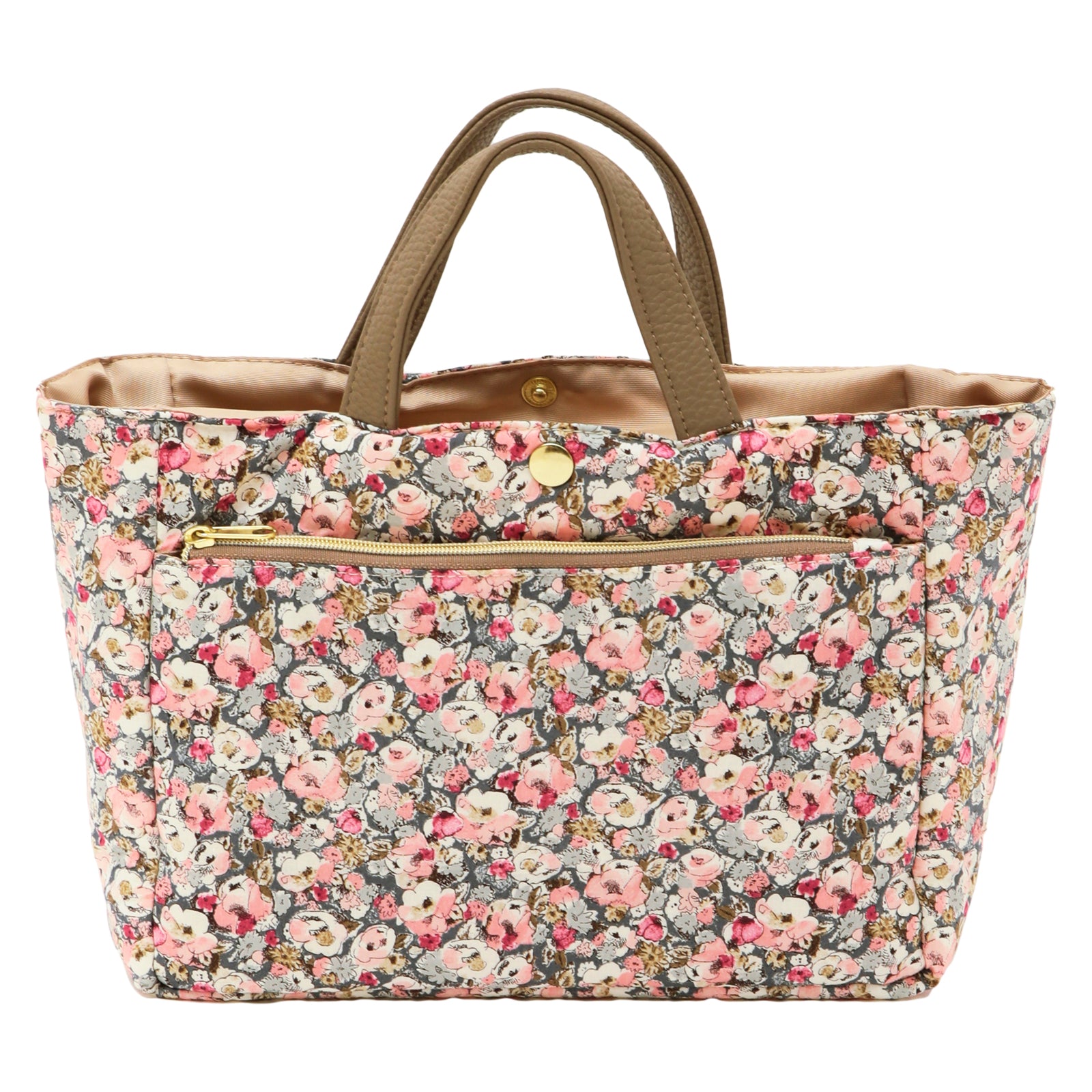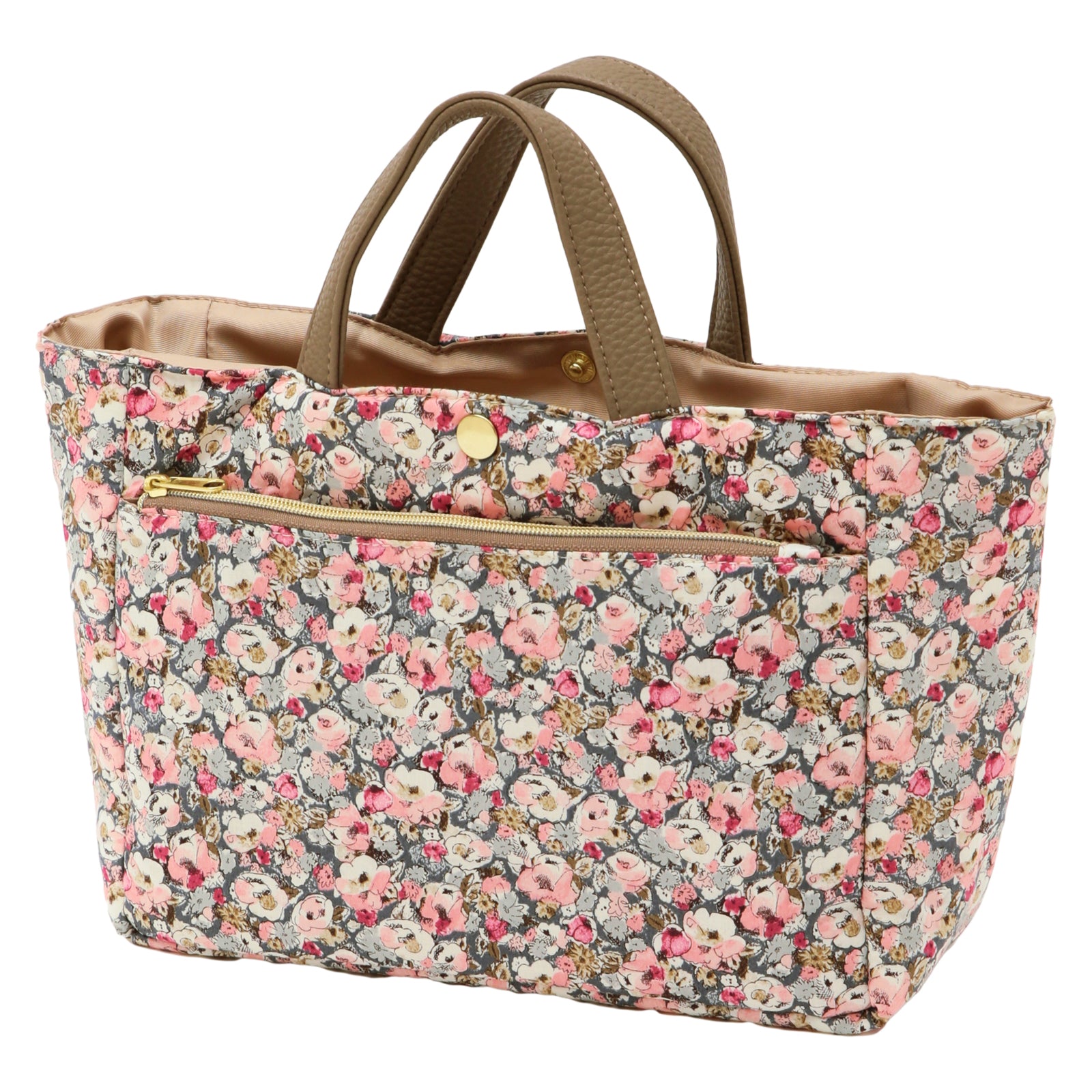 リバティプリントのタナローン生地を使用した、バッグの中身をすっきり整理できるバッグインバッグです。 大小さまざまなポケットが付いているので、小物を効率的に収納できます。 いつも持ち歩くアイテムをこのバッグインバッグにまとめておけば、コーディネートや気分によってバックを変える時にも、そのまま差し替えるだけで、忘れ物の心配がなく、とても便利です。 外側にはオープンポケットが2つとファスナーポケットが1つ、内側には計5つのオープンポケットを備えており、その中の1つは350mlのペットボトルが入るスクエアポケット、残りの4つも厚みのあるものも入れられるポケットになっています。