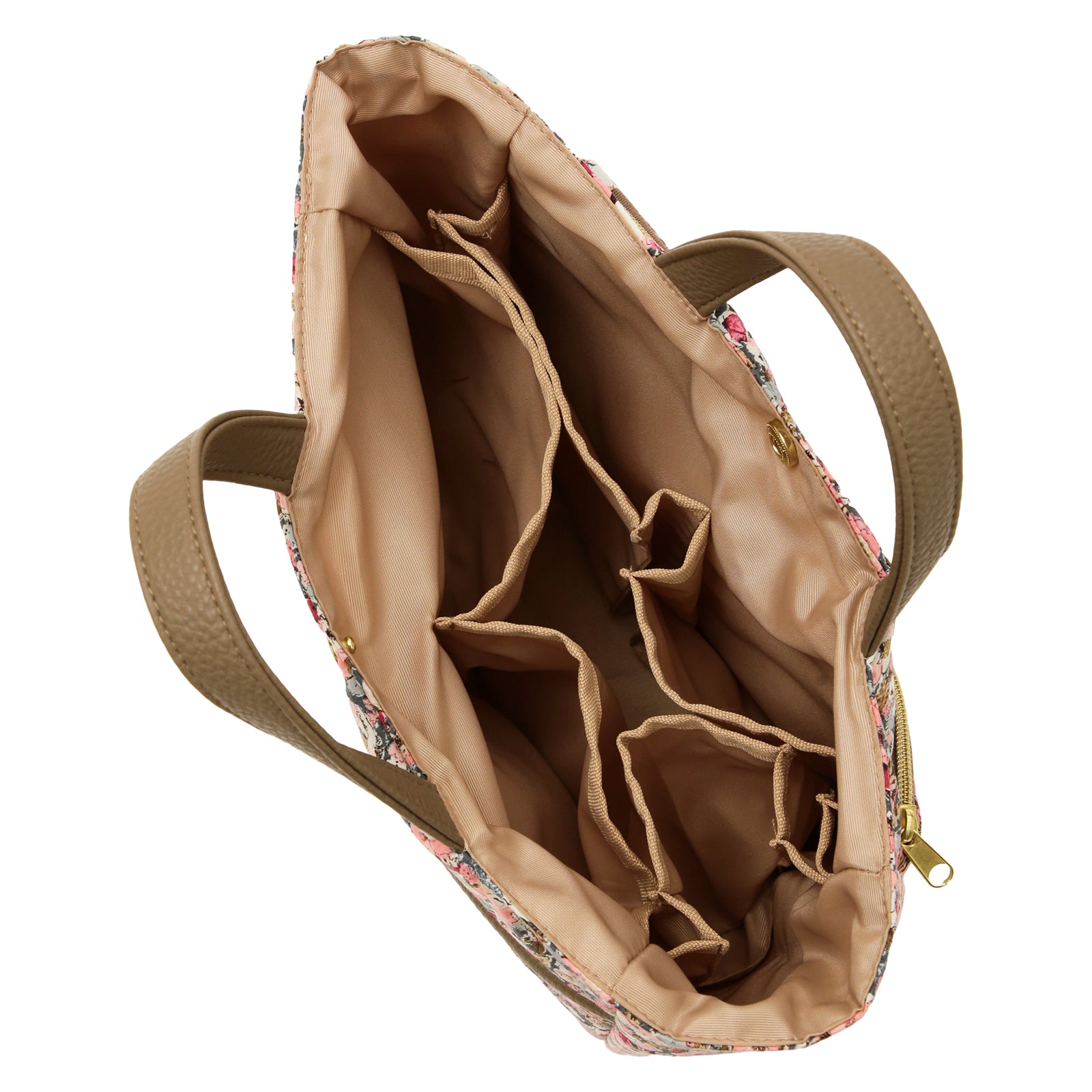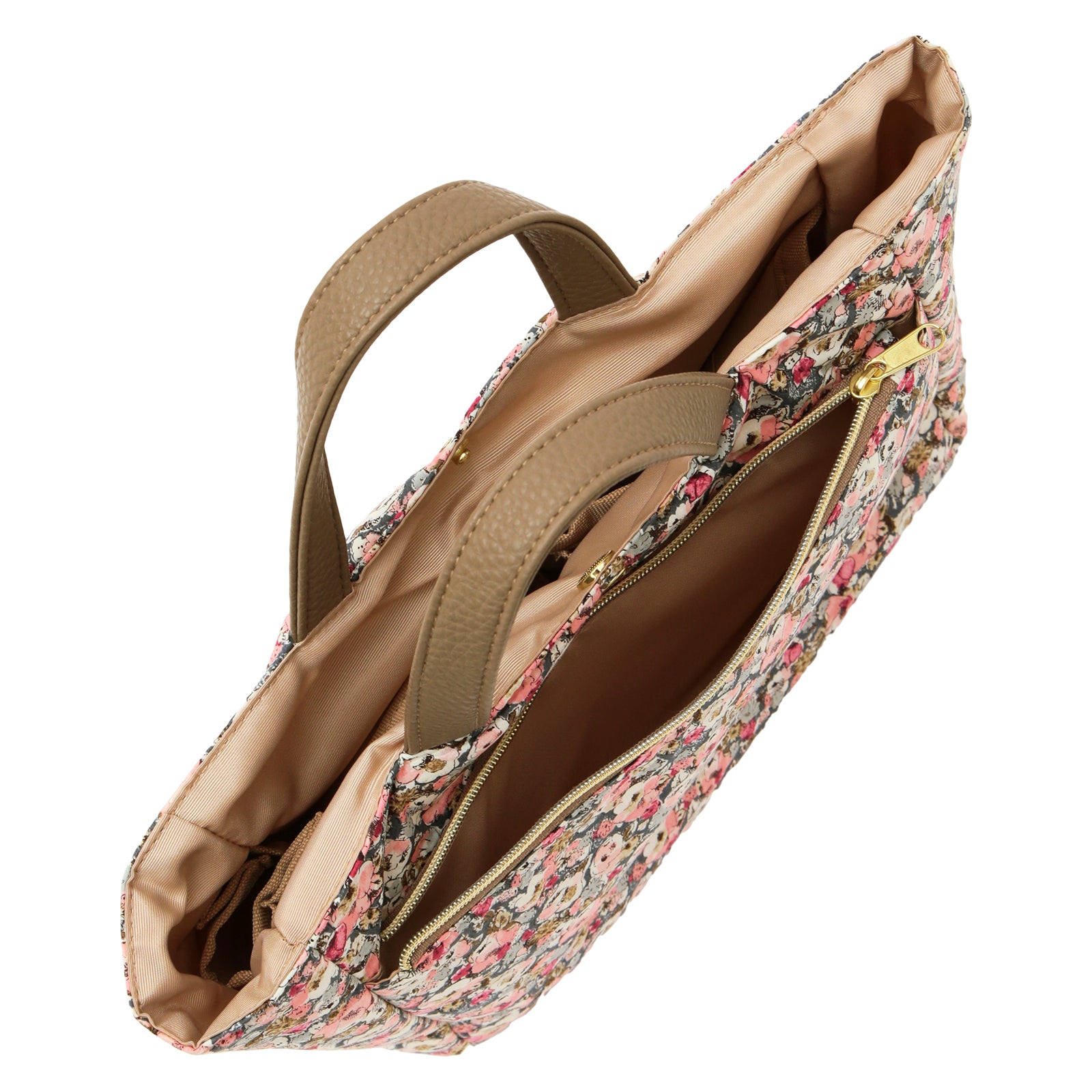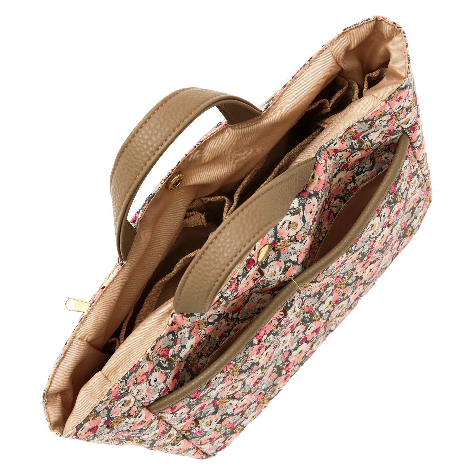 リバティプリントのタナローン生地を使用した、バッグの中身をすっきり整理できるバッグインバッグです。 大小さまざまなポケットが付いているので、小物を効率的に収納できます。 いつも持ち歩くアイテムをこのバッグインバッグにまとめておけば、コーディネートや気分によってバックを変える時にも、そのまま差し替えるだけで、忘れ物の心配がなく、とても便利です。 外側にはオープンポケットが2つとファスナーポケットが1つ、内側には計5つのオープンポケットを備えており、その中の1つは350mlのペットボトルが入るスクエアポケット、残りの4つも厚みのあるものも入れられるポケットになっています。