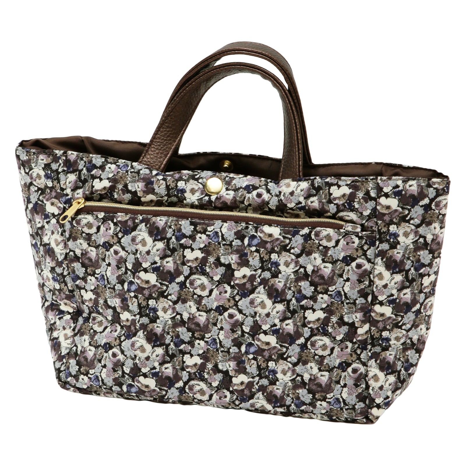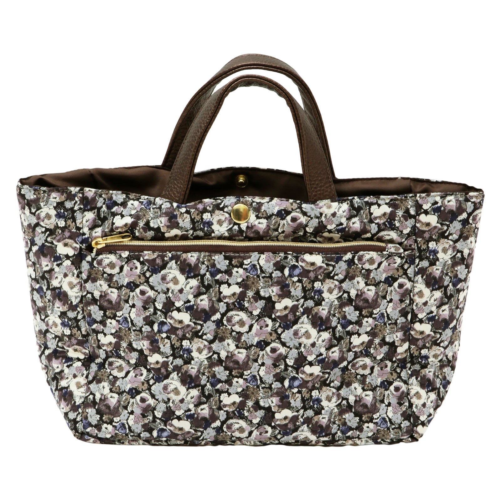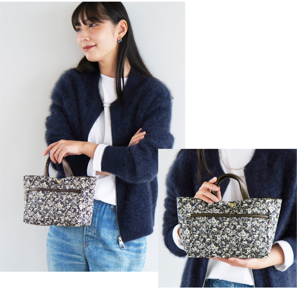 リバティプリントのタナローン生地を使用した、バッグの中身をすっきり整理できるバッグインバッグです。 大小さまざまなポケットが付いているので、小物を効率的に収納できます。 いつも持ち歩くアイテムをこのバッグインバッグにまとめておけば、コーディネートや気分によってバックを変える時にも、そのまま差し替えるだけで、忘れ物の心配がなく、とても便利です。 外側にはオープンポケットが2つとファスナーポケットが1つ、内側には計5つのオープンポケットを備えており、その中の1つは350mlのペットボトルが入るスクエアポケット、残りの4つも厚みのあるものも入れられるポケットになっています。