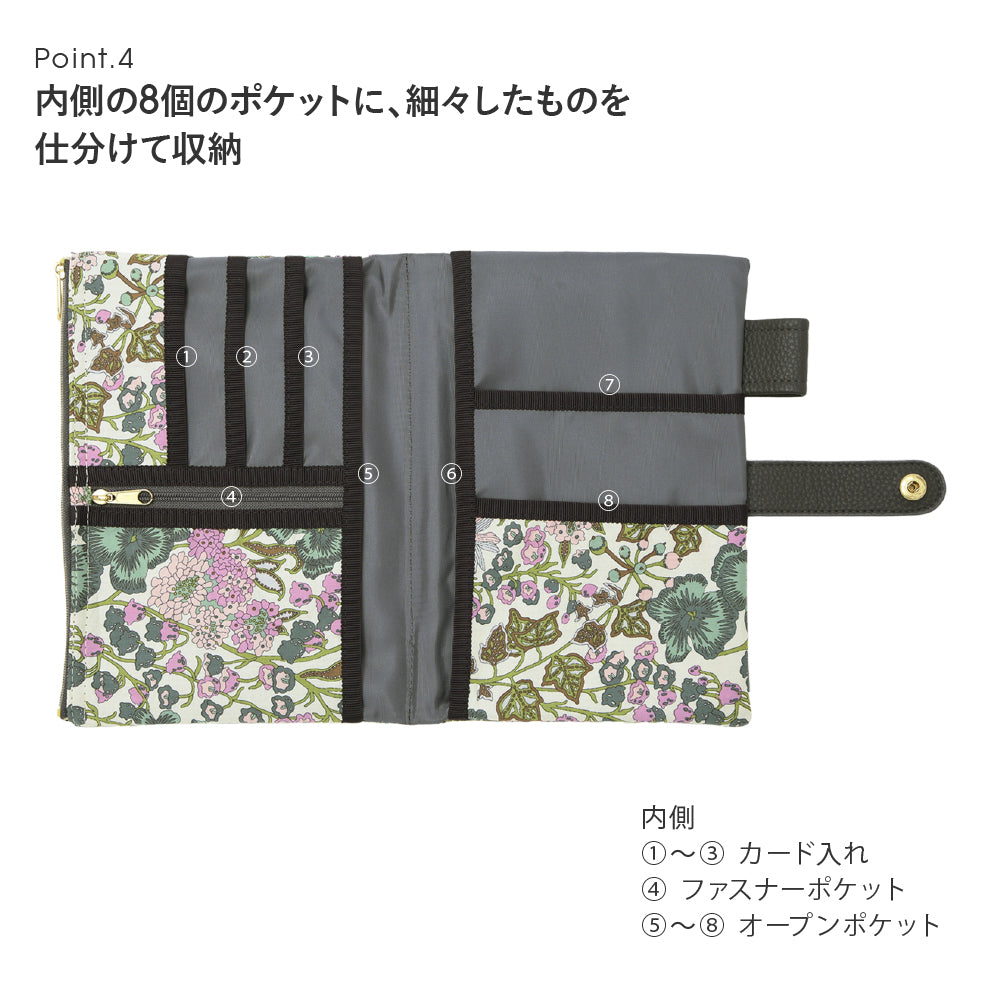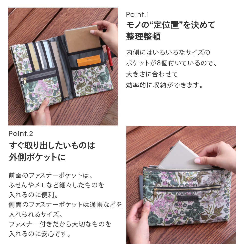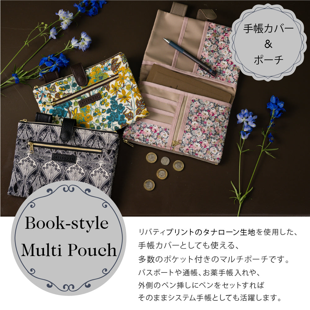 リバティプリントのタナローン生地を使用した、多機能な手帳型マルチポーチです。 外側にはファスナーポケットが2つと便利なペン挿し付き。内側にはカード入れ×3、オープンポケット×2、ファスナーポケット×1を備え、収納力抜群です。 病院用にお薬手帳や診察券、母子手帳、旅行の際にはパスポートやカードの貴重品入れなど、様々な用途でお使いいただけます。 さらに内側の左右全面のオープンポケットには、厚みのあるB6サイズ手帳の表紙を差し込めるため、手帳カバーとしてもお使いいただけます。 名刺や付箋など細かいものもきちんと収納でき、外側のペン挿しにペンをセットすれば、そのままシステム手帳としても活躍します。