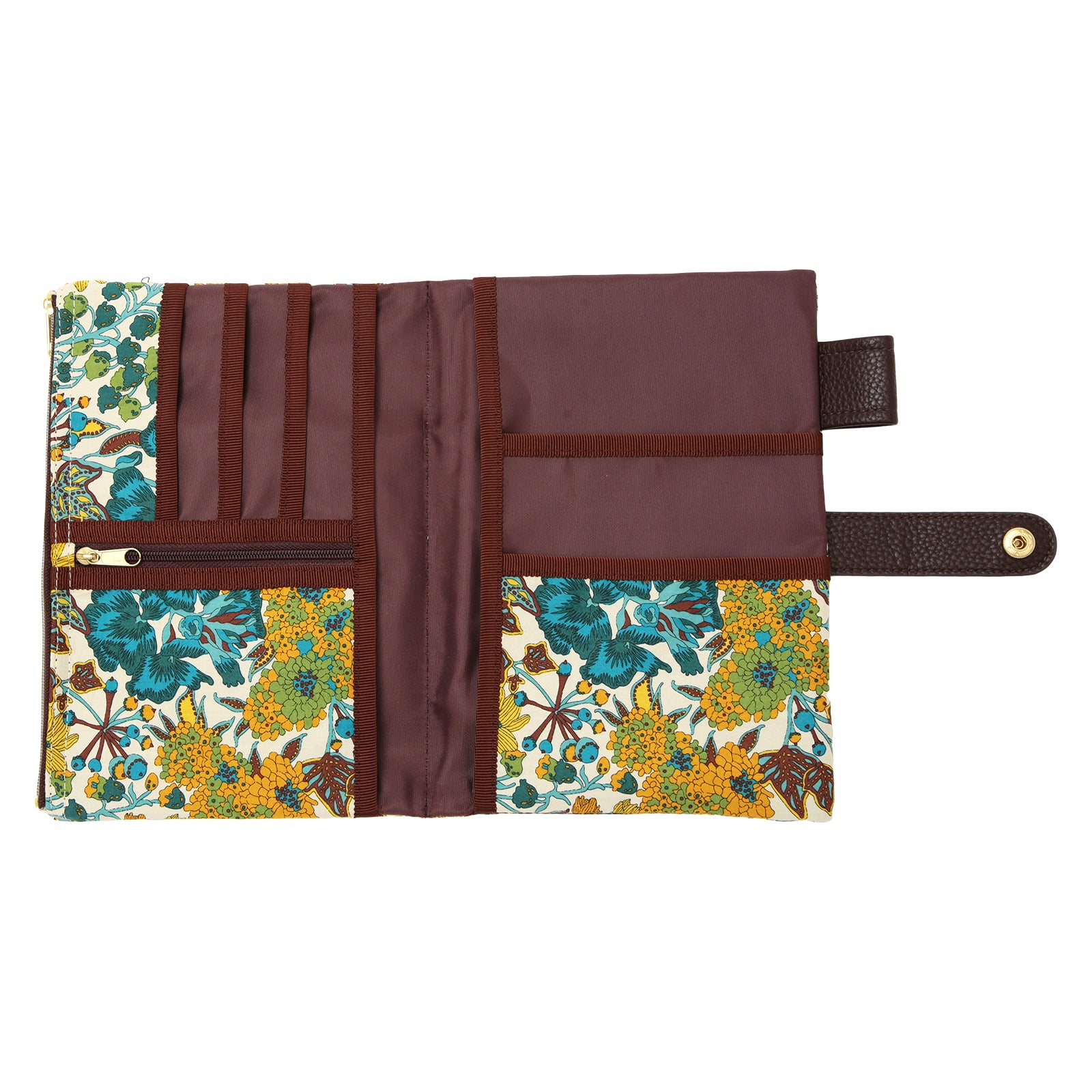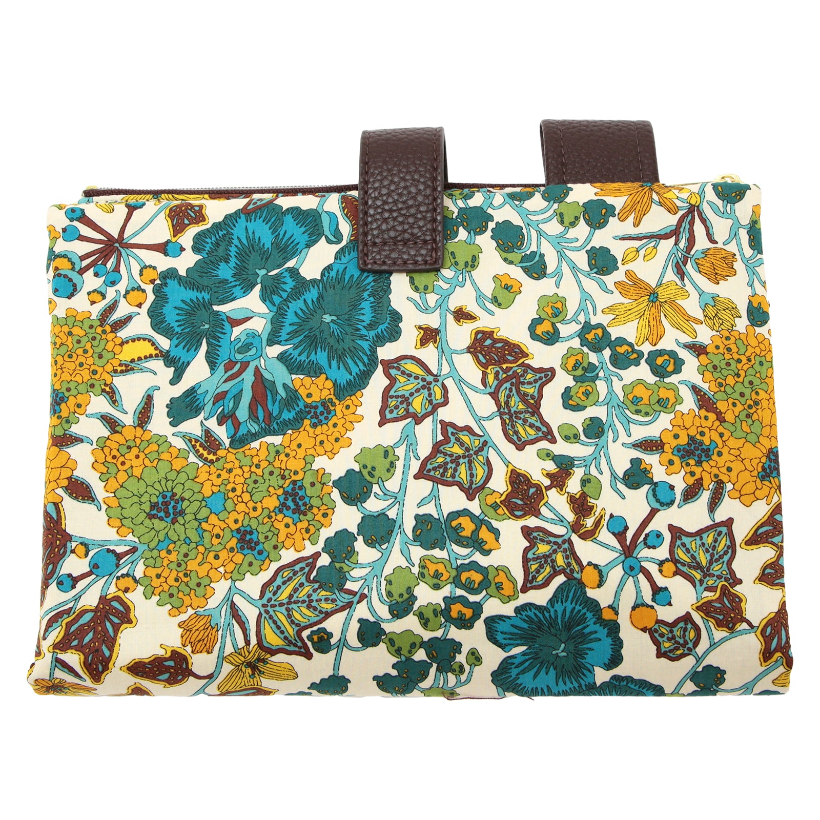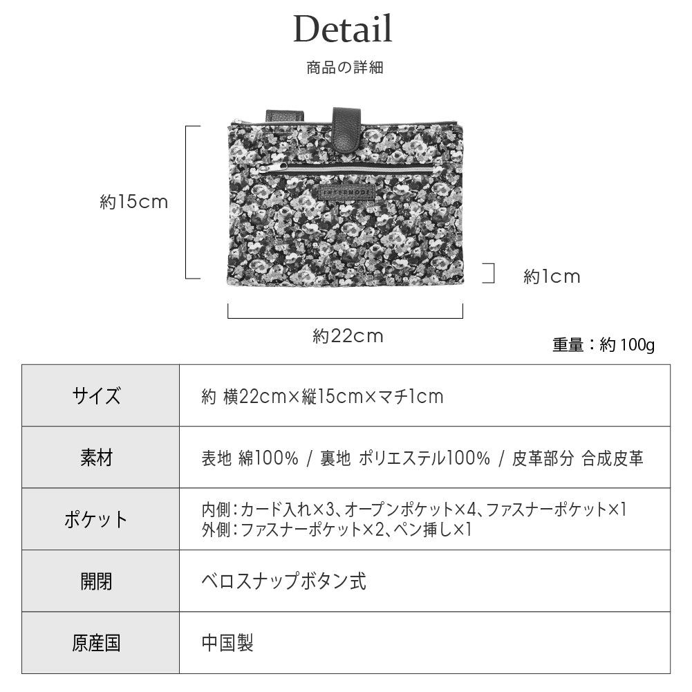 リバティプリントのタナローン生地を使用した、多機能な手帳型マルチポーチです。 外側にはファスナーポケットが2つと便利なペン挿し付き。内側にはカード入れ×3、オープンポケット×2、ファスナーポケット×1を備え、収納力抜群です。 病院用にお薬手帳や診察券、母子手帳、旅行の際にはパスポートやカードの貴重品入れなど、様々な用途でお使いいただけます。 さらに内側の左右全面のオープンポケットには、厚みのあるB6サイズ手帳の表紙を差し込めるため、手帳カバーとしてもお使いいただけます。 名刺や付箋など細かいものもきちんと収納でき、外側のペン挿しにペンをセットすれば、そのままシステム手帳としても活躍します。