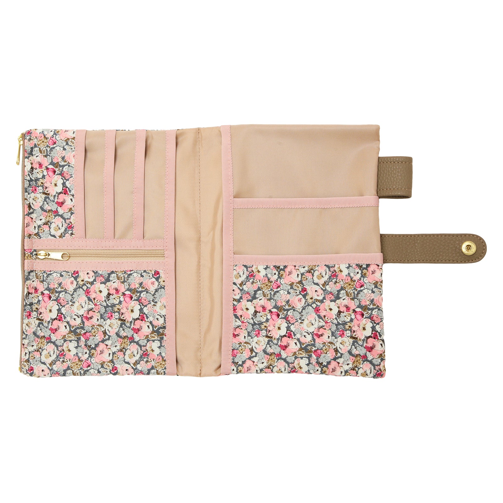 リバティプリントのタナローン生地を使用した、多機能な手帳型マルチポーチです。 外側にはファスナーポケットが2つと便利なペン挿し付き。内側にはカード入れ×3、オープンポケット×2、ファスナーポケット×1を備え、収納力抜群です。 病院用にお薬手帳や診察券、母子手帳、旅行の際にはパスポートやカードの貴重品入れなど、様々な用途でお使いいただけます。 さらに内側の左右全面のオープンポケットには、厚みのあるB6サイズ手帳の表紙を差し込めるため、手帳カバーとしてもお使いいただけます。 名刺や付箋など細かいものもきちんと収納でき、外側のペン挿しにペンをセットすれば、そのままシステム手帳としても活躍します。