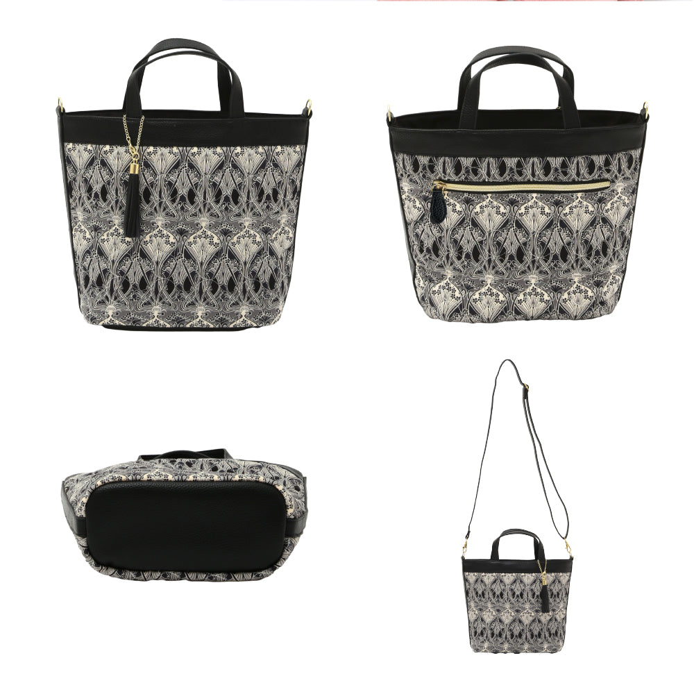リバティプリントのタナローン生地を使用した、開閉がファスナータイプのショルダーバッグです。アクセントとして、バッグ開口部の縁取りとハンドルにシックな合皮を付けました。 底マチは約10cmあり、500mlペットボトルを立てて収納できるほか、お弁当箱など幅のある荷物もすっきり入ります。 外側背面にファスナーポケット、内側にはオープンポケット×1・ファスナーポケット×1を備えており、小物の仕分けにも便利です。 手持ち用ハンドルに加え、取り外し可能なショルダーテープ付きで、肩掛け・斜め掛けの2WAY仕様。 さらに「落としファスナー」が付いているため、荷物をたくさん入れても中身が飛び出さず安心です。ファスナーを使わないときは内側に折り込めるので、スムーズに物の出し入れができます。 通勤やお出かけなど、幅広いシーンで活躍する便利なバッグです。