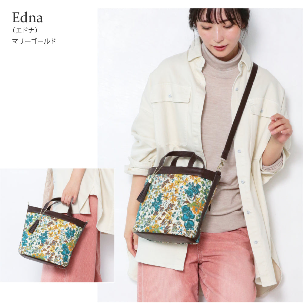 Edna(エドナ):美しさ、謙虚、幸せの復活を象徴するスズランに、愛を象徴するハコベ、永遠の美を表すニオイアラセイトウ、無関心の象徴のキャンディタフト(マガリバナ)と、夫婦の愛、不死、忠誠を表すツタを加えて手描きして色づけをした柄です。