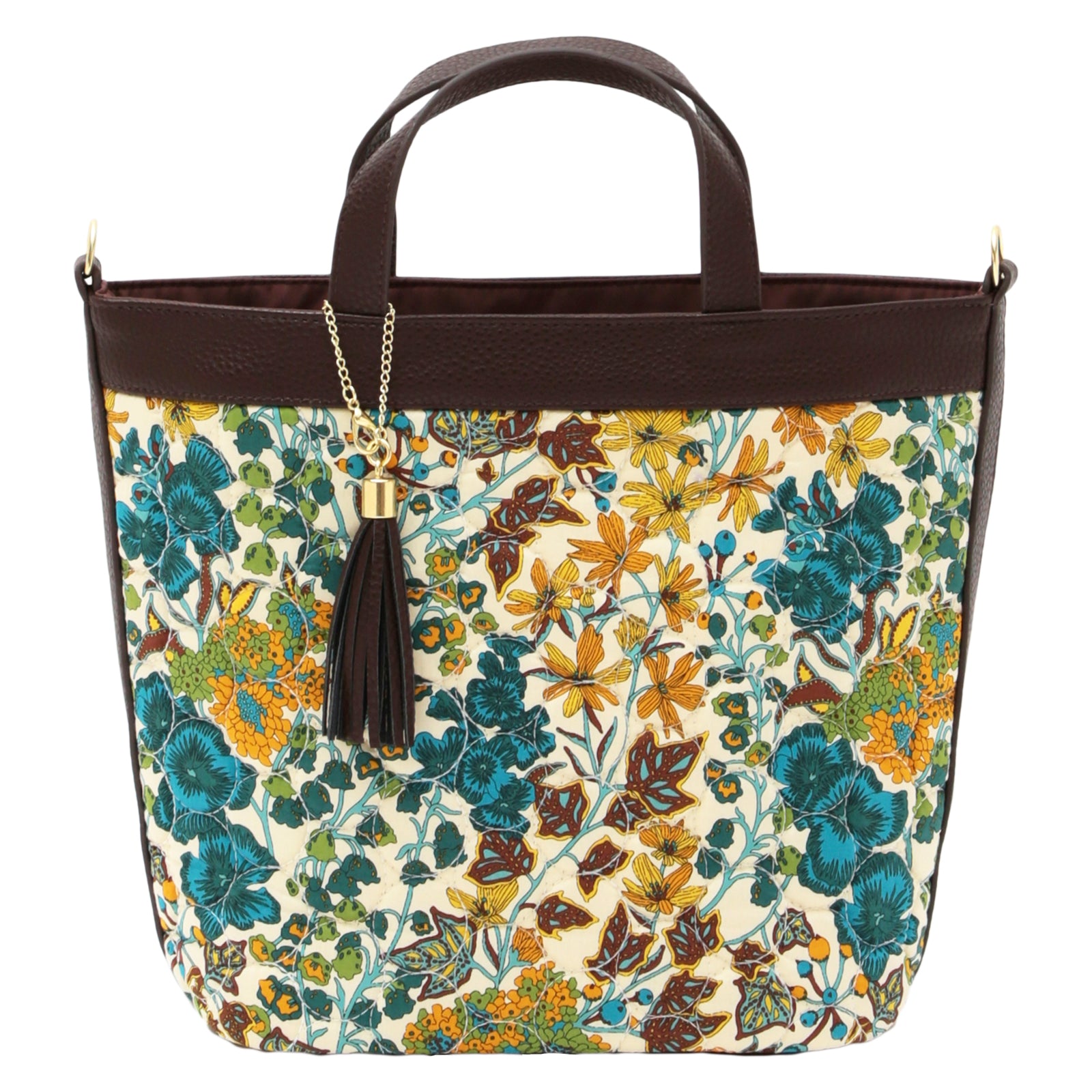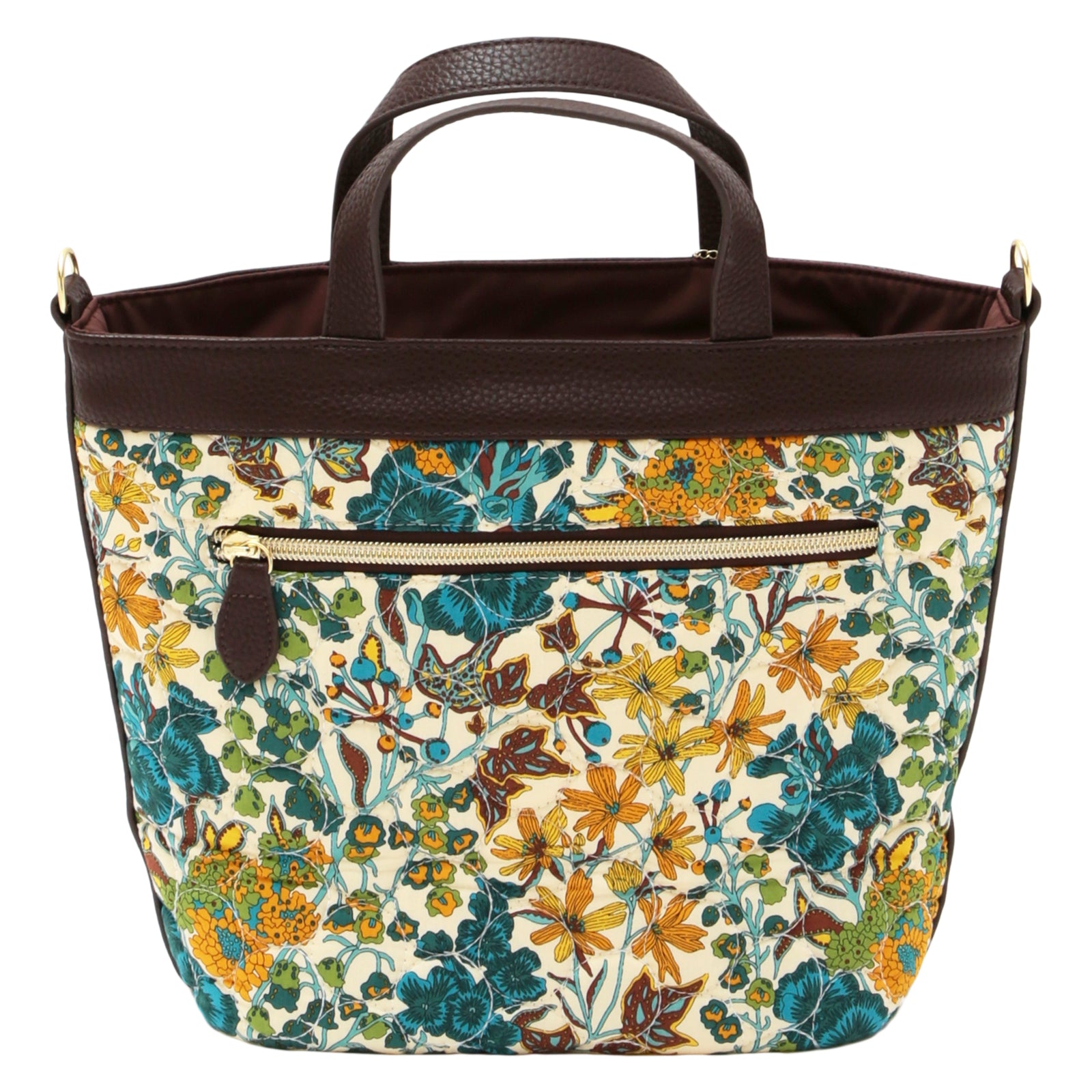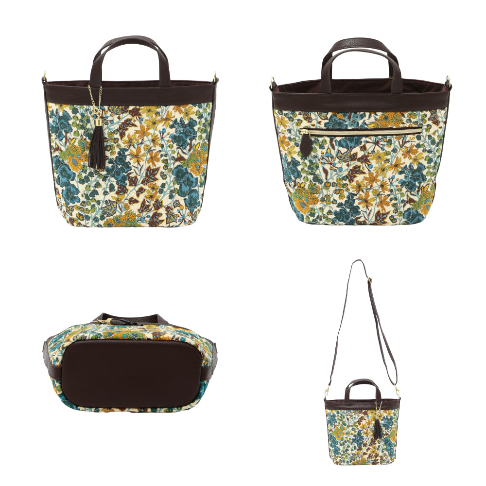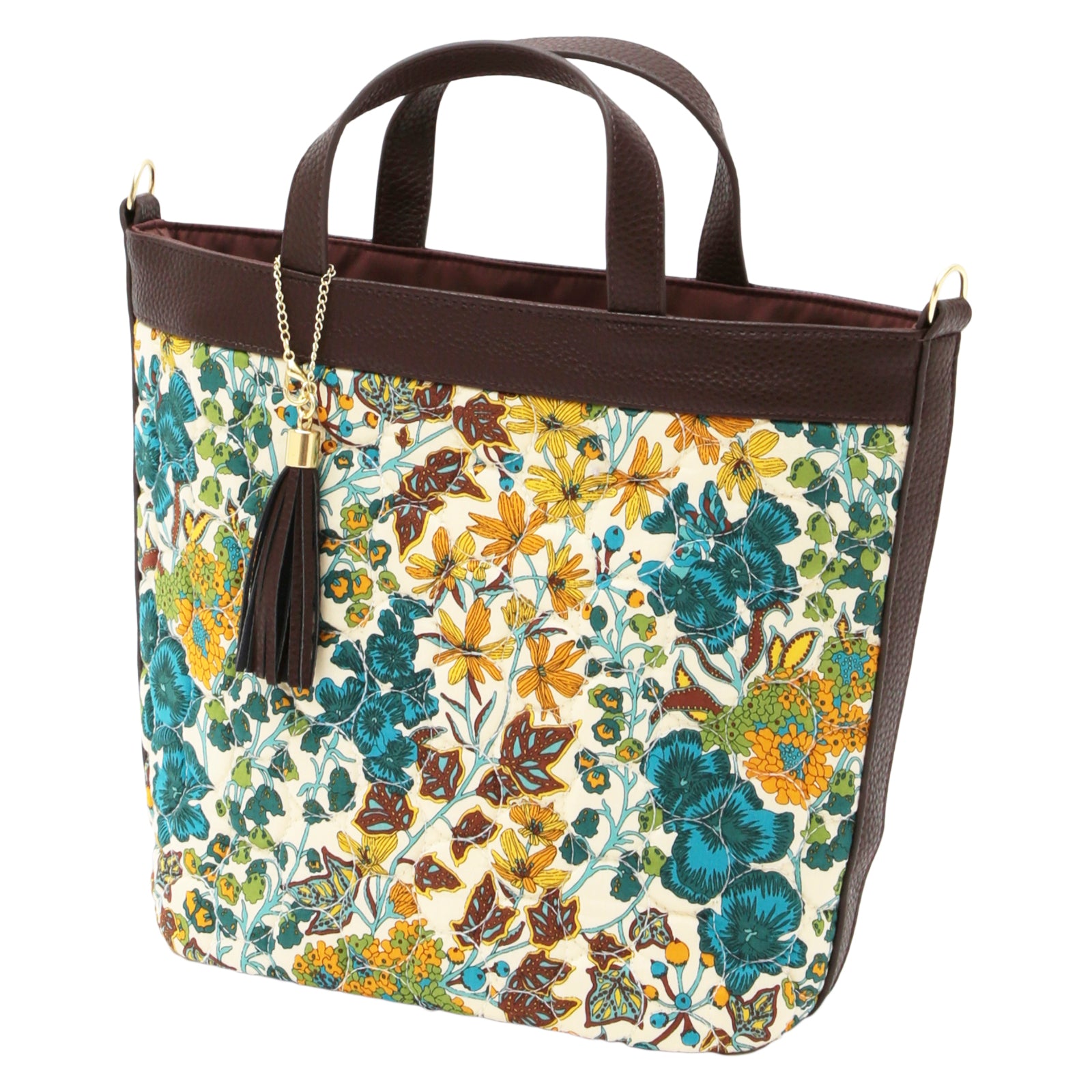 リバティプリントのタナローン生地を使用した、開閉がファスナータイプのショルダーバッグです。アクセントとして、バッグ開口部の縁取りとハンドルにシックな合皮を付けました。 底マチは約10cmあり、500mlペットボトルを立てて収納できるほか、お弁当箱など幅のある荷物もすっきり入ります。 外側背面にファスナーポケット、内側にはオープンポケット×1・ファスナーポケット×1を備えており、小物の仕分けにも便利です。 手持ち用ハンドルに加え、取り外し可能なショルダーテープ付きで、肩掛け・斜め掛けの2WAY仕様。 さらに「落としファスナー」が付いているため、荷物をたくさん入れても中身が飛び出さず安心です。ファスナーを使わないときは内側に折り込めるので、スムーズに物の出し入れができます。 通勤やお出かけなど、幅広いシーンで活躍する便利なバッグです。