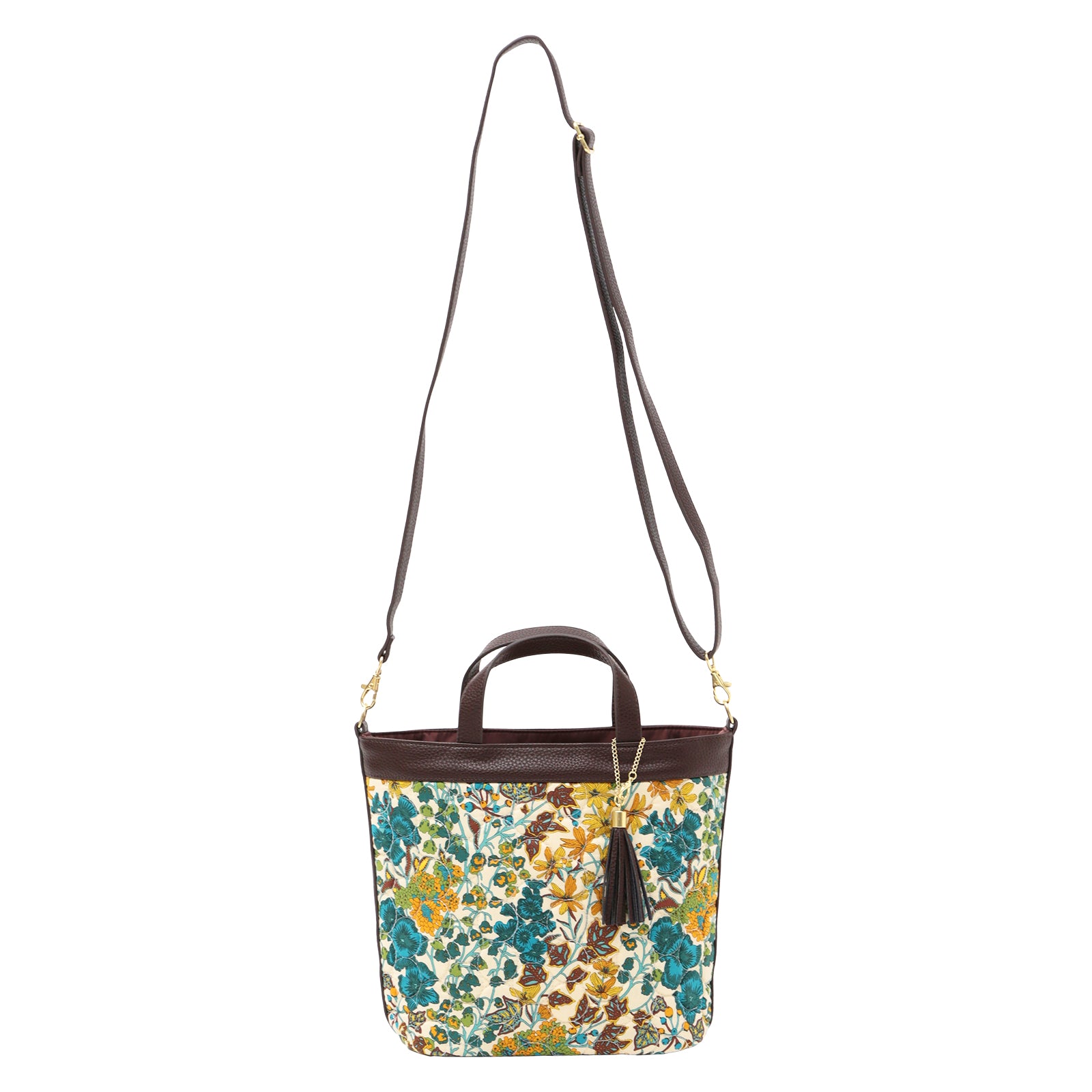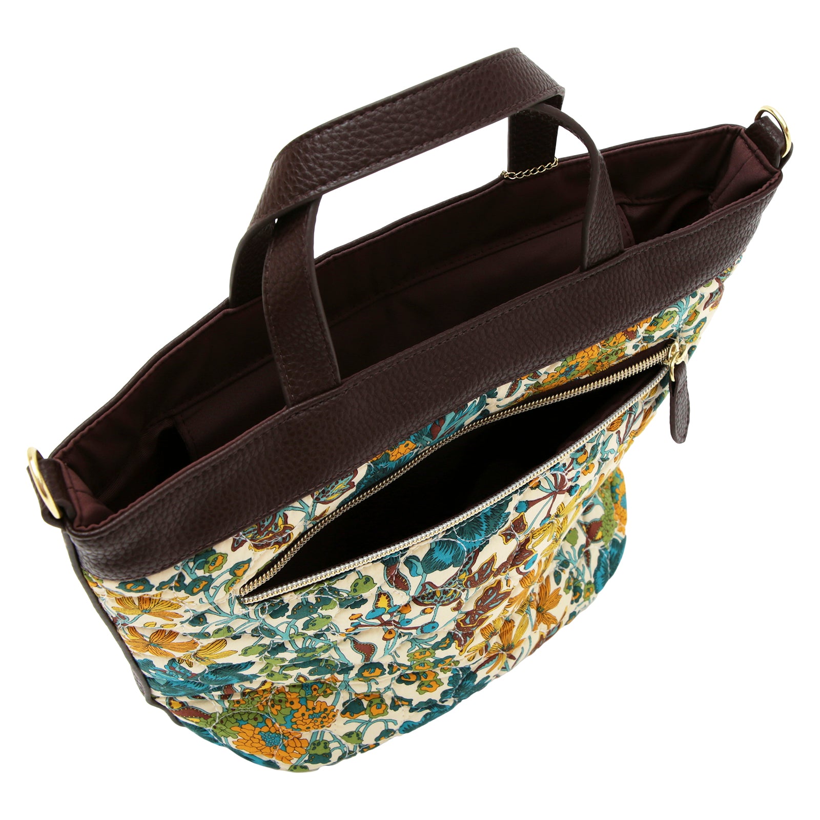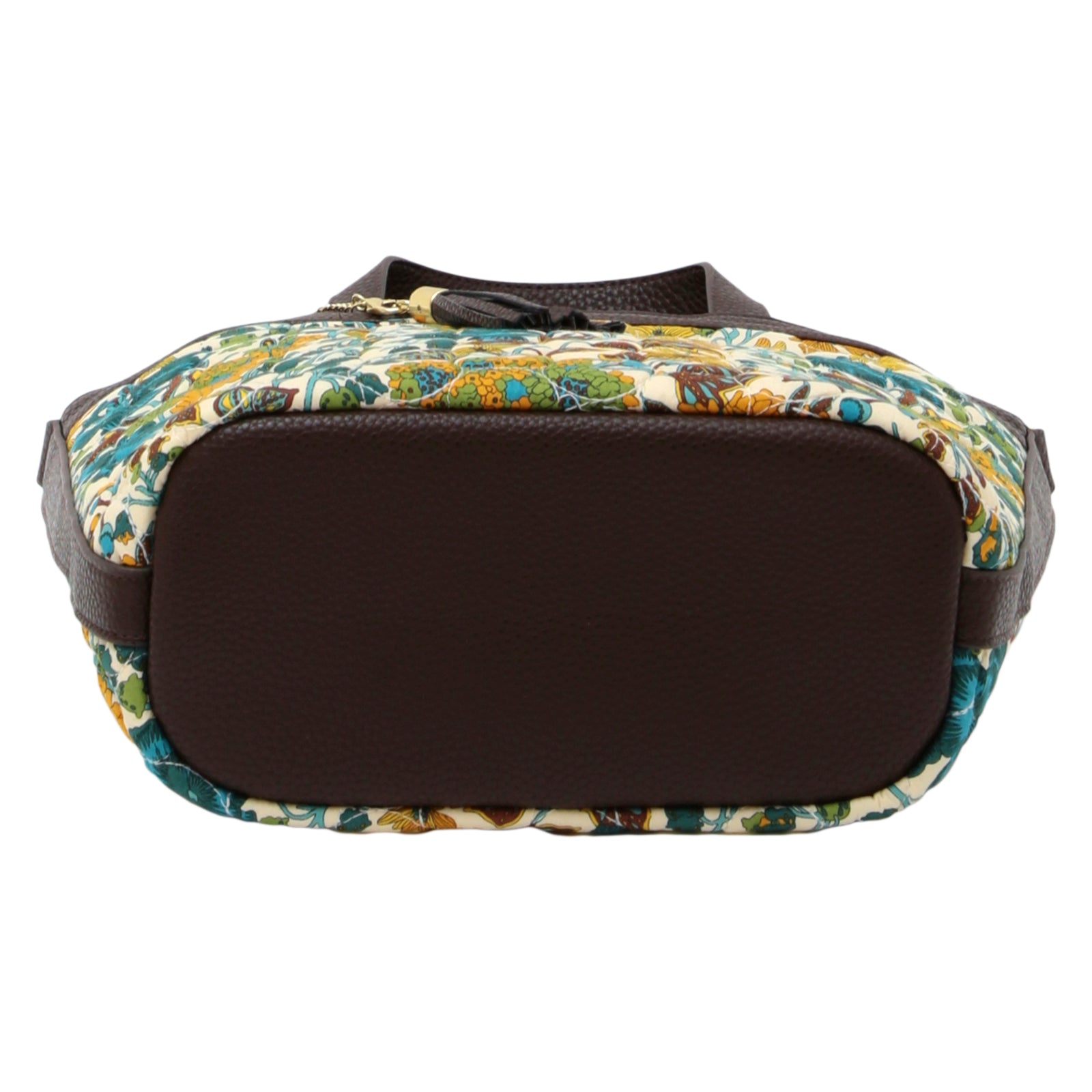 リバティプリントのタナローン生地を使用した、開閉がファスナータイプのショルダーバッグです。アクセントとして、バッグ開口部の縁取りとハンドルにシックな合皮を付けました。 底マチは約10cmあり、500mlペットボトルを立てて収納できるほか、お弁当箱など幅のある荷物もすっきり入ります。 外側背面にファスナーポケット、内側にはオープンポケット×1・ファスナーポケット×1を備えており、小物の仕分けにも便利です。 手持ち用ハンドルに加え、取り外し可能なショルダーテープ付きで、肩掛け・斜め掛けの2WAY仕様。 さらに「落としファスナー」が付いているため、荷物をたくさん入れても中身が飛び出さず安心です。ファスナーを使わないときは内側に折り込めるので、スムーズに物の出し入れができます。 通勤やお出かけなど、幅広いシーンで活躍する便利なバッグです。
