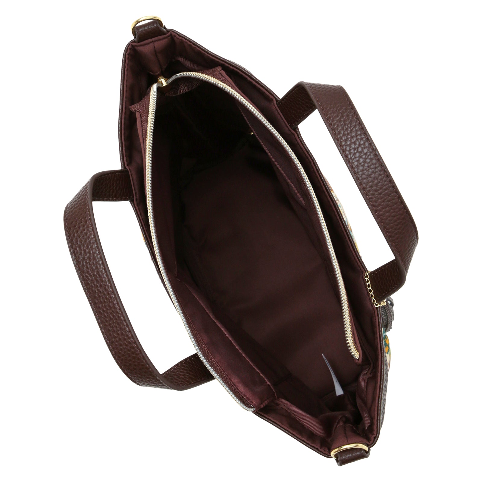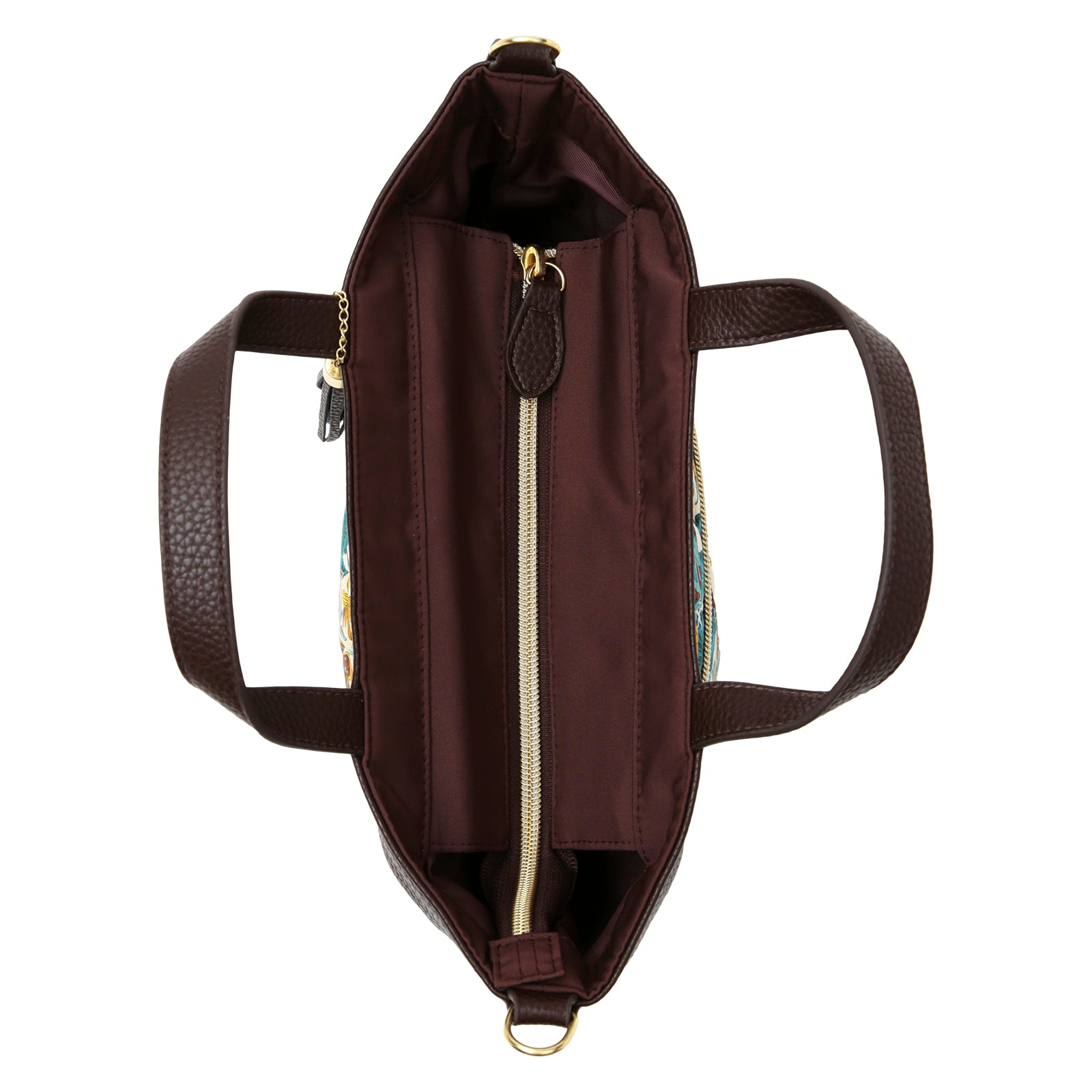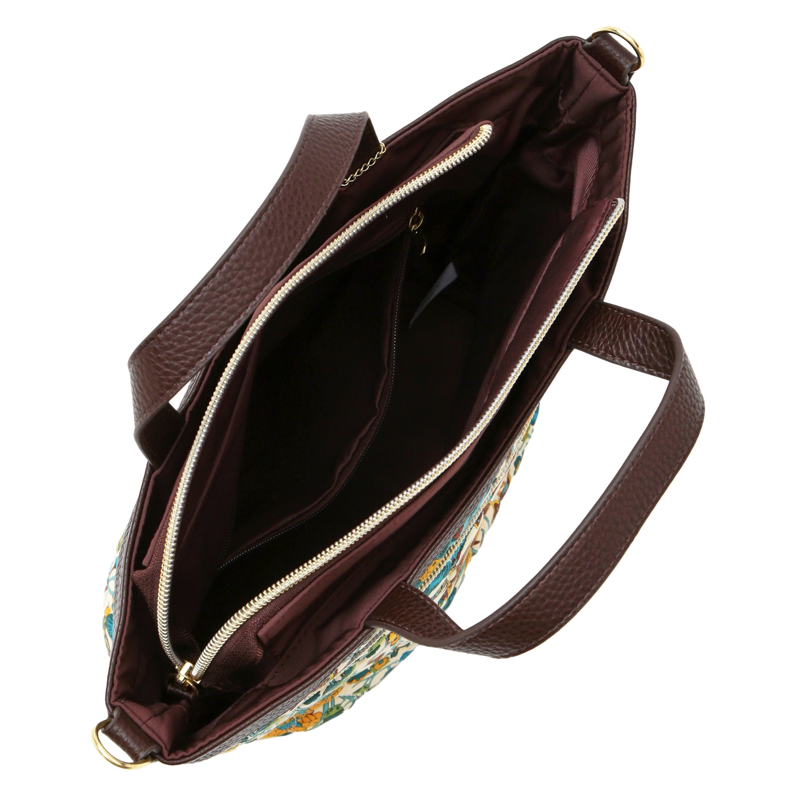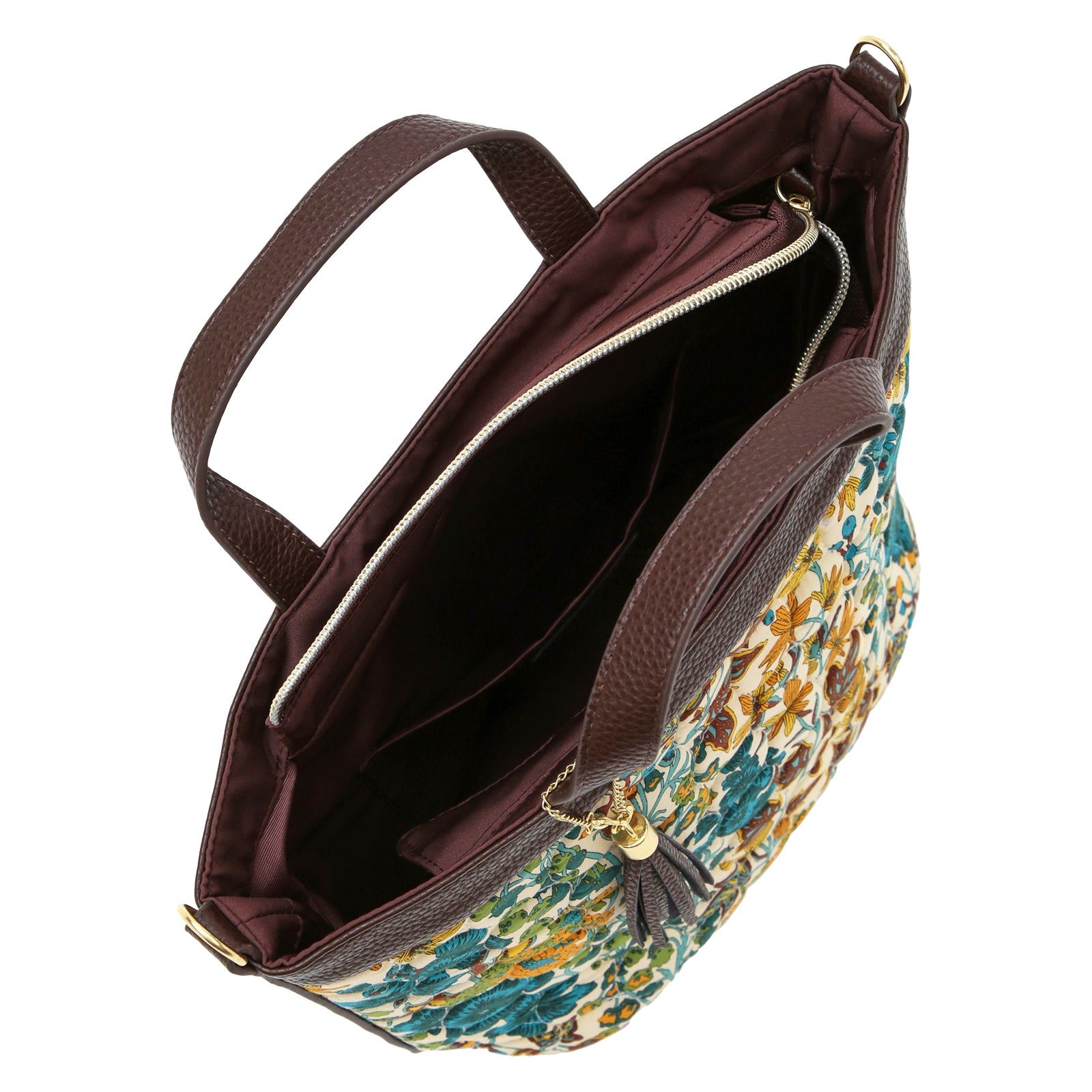 リバティプリントのタナローン生地を使用した、開閉がファスナータイプのショルダーバッグです。アクセントとして、バッグ開口部の縁取りとハンドルにシックな合皮を付けました。 底マチは約10cmあり、500mlペットボトルを立てて収納できるほか、お弁当箱など幅のある荷物もすっきり入ります。 外側背面にファスナーポケット、内側にはオープンポケット×1・ファスナーポケット×1を備えており、小物の仕分けにも便利です。 手持ち用ハンドルに加え、取り外し可能なショルダーテープ付きで、肩掛け・斜め掛けの2WAY仕様。 さらに「落としファスナー」が付いているため、荷物をたくさん入れても中身が飛び出さず安心です。ファスナーを使わないときは内側に折り込めるので、スムーズに物の出し入れができます。 通勤やお出かけなど、幅広いシーンで活躍する便利なバッグです。