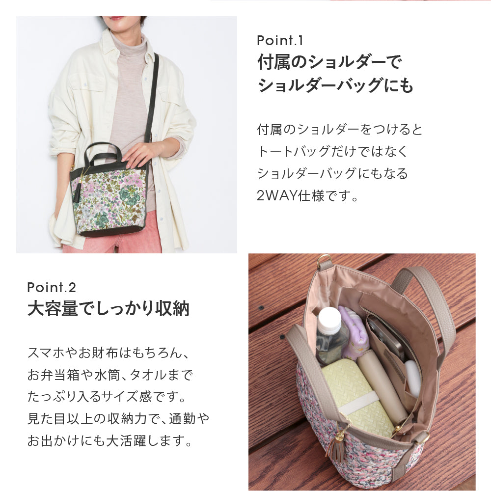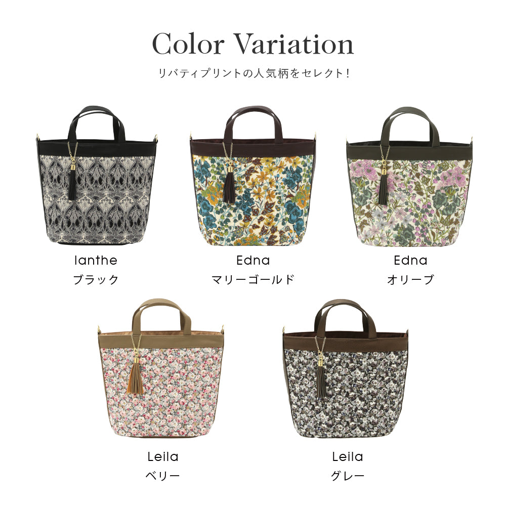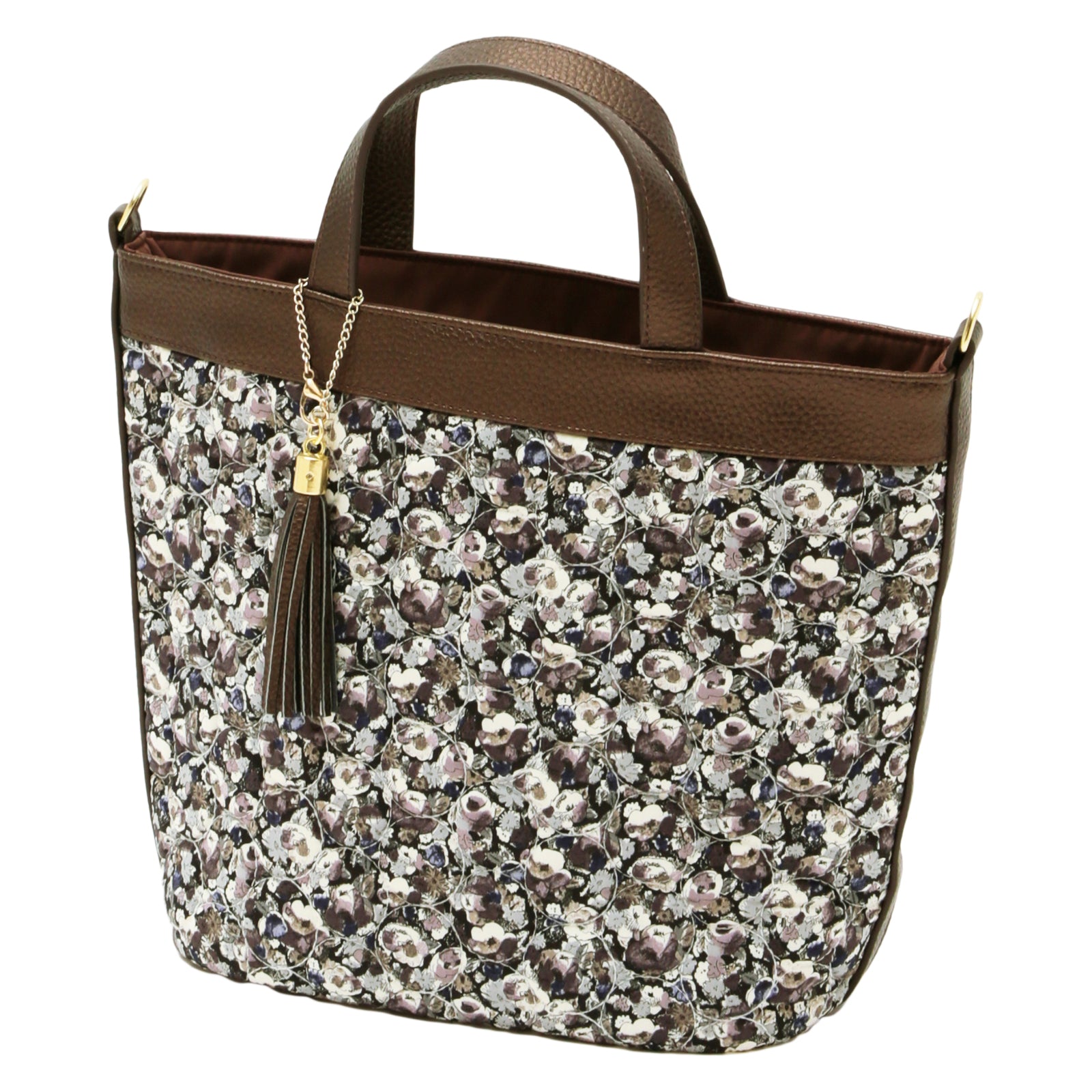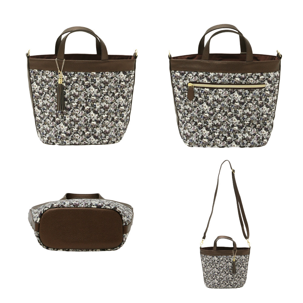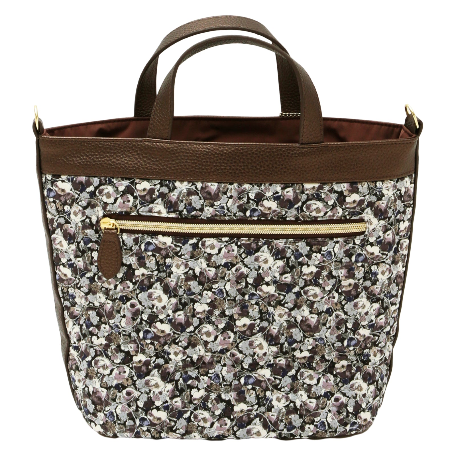 リバティプリントのタナローン生地を使用した、開閉がファスナータイプのショルダーバッグです。アクセントとして、バッグ開口部の縁取りとハンドルにシックな合皮を付けました。 底マチは約10cmあり、500mlペットボトルを立てて収納できるほか、お弁当箱など幅のある荷物もすっきり入ります。 外側背面にファスナーポケット、内側にはオープンポケット×1・ファスナーポケット×1を備えており、小物の仕分けにも便利です。 手持ち用ハンドルに加え、取り外し可能なショルダーテープ付きで、肩掛け・斜め掛けの2WAY仕様。 さらに「落としファスナー」が付いているため、荷物をたくさん入れても中身が飛び出さず安心です。ファスナーを使わないときは内側に折り込めるので、スムーズに物の出し入れができます。 通勤やお出かけなど、幅広いシーンで活躍する便利なバッグです。