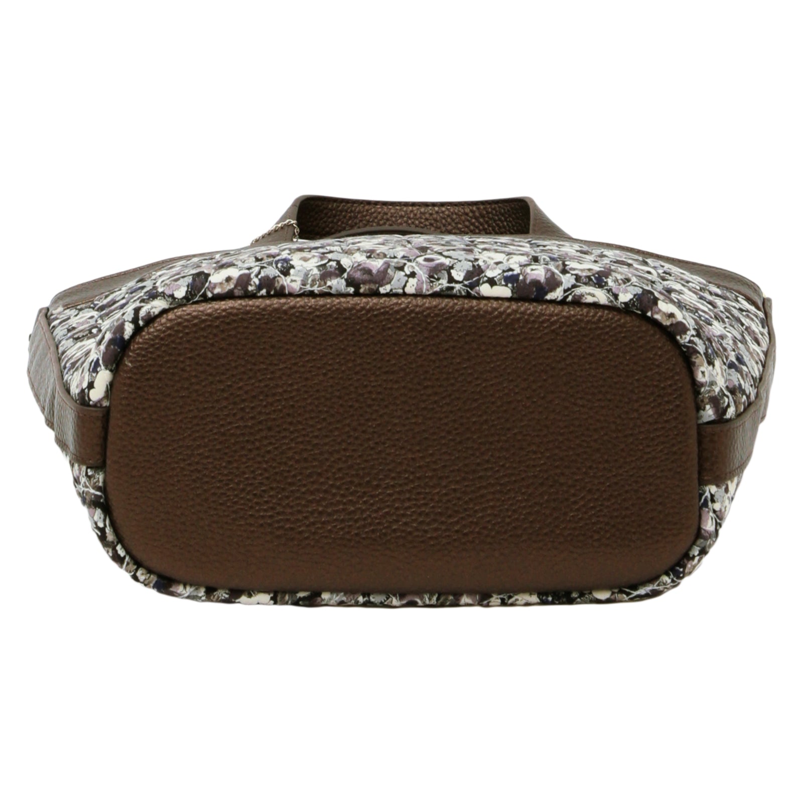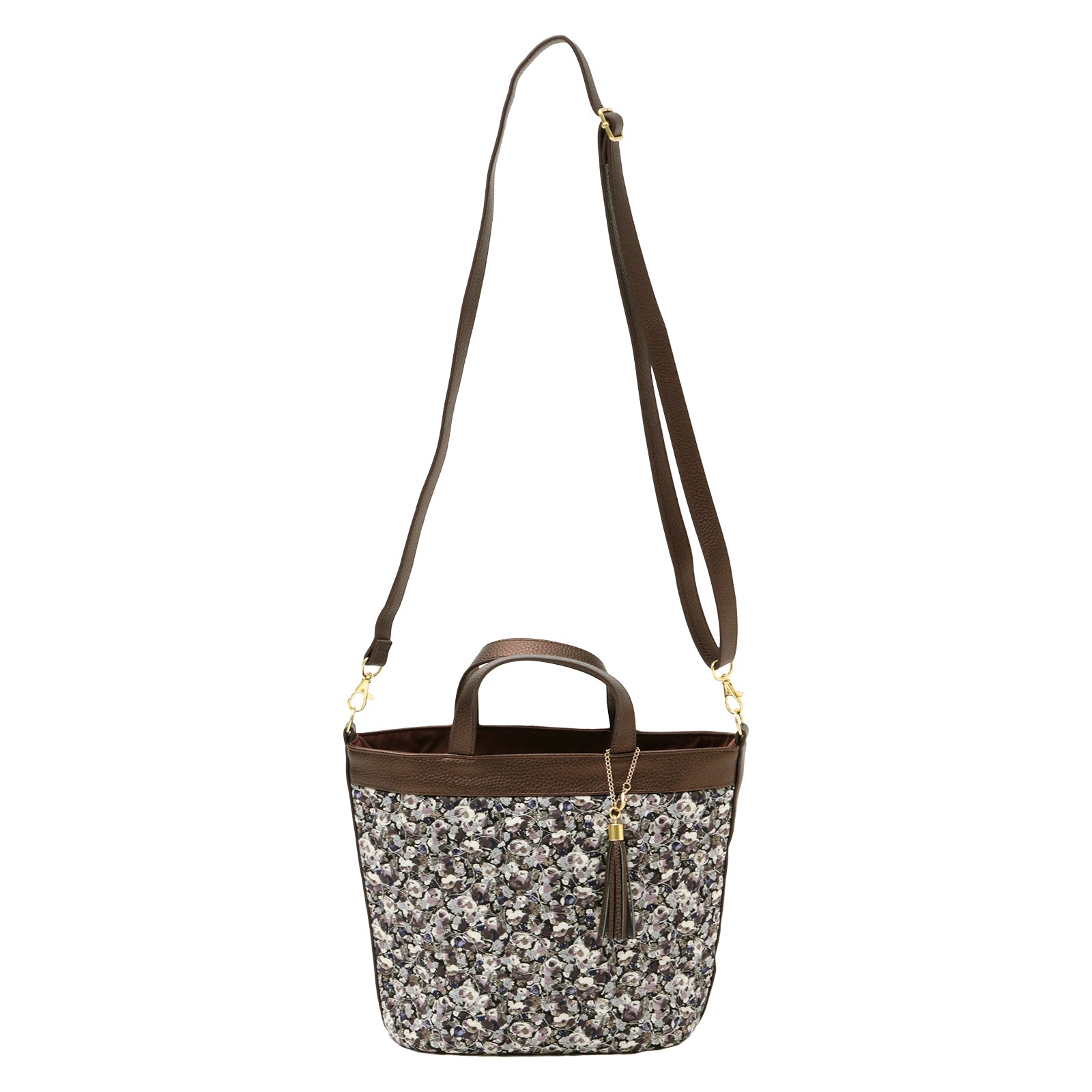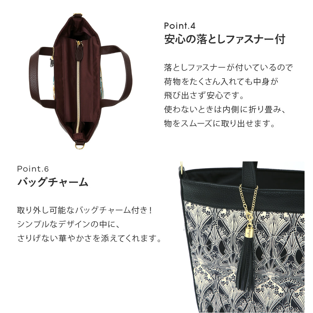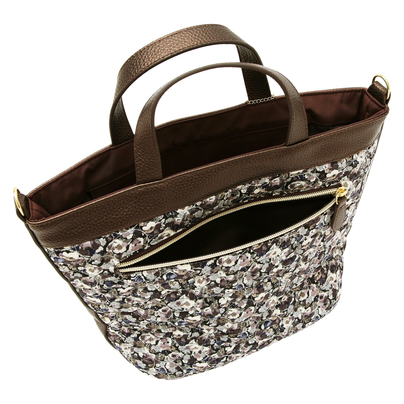 リバティプリントのタナローン生地を使用した、開閉がファスナータイプのショルダーバッグです。アクセントとして、バッグ開口部の縁取りとハンドルにシックな合皮を付けました。 底マチは約10cmあり、500mlペットボトルを立てて収納できるほか、お弁当箱など幅のある荷物もすっきり入ります。 外側背面にファスナーポケット、内側にはオープンポケット×1・ファスナーポケット×1を備えており、小物の仕分けにも便利です。 手持ち用ハンドルに加え、取り外し可能なショルダーテープ付きで、肩掛け・斜め掛けの2WAY仕様。 さらに「落としファスナー」が付いているため、荷物をたくさん入れても中身が飛び出さず安心です。ファスナーを使わないときは内側に折り込めるので、スムーズに物の出し入れができます。 通勤やお出かけなど、幅広いシーンで活躍する便利なバッグです。