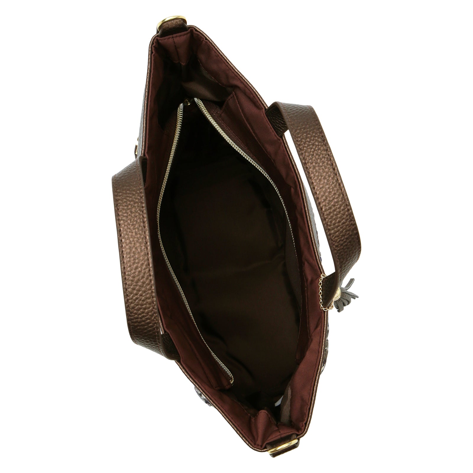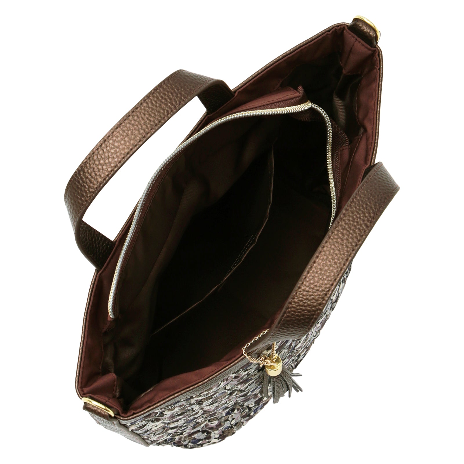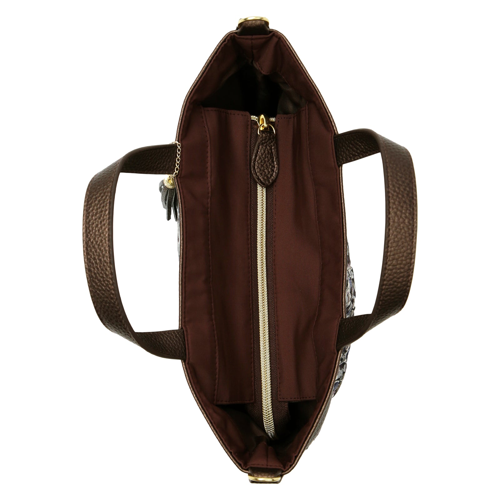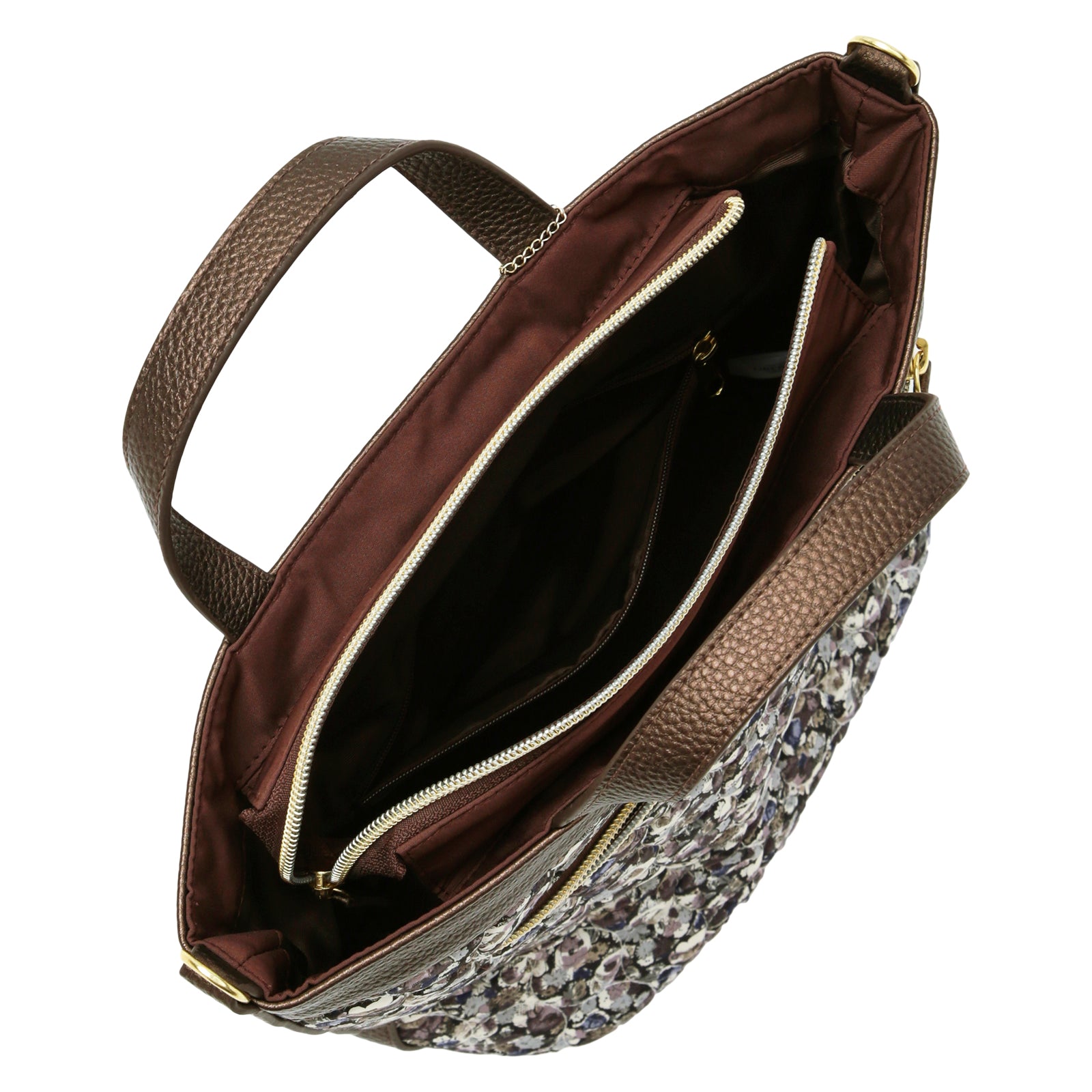 リバティプリントのタナローン生地を使用した、開閉がファスナータイプのショルダーバッグです。アクセントとして、バッグ開口部の縁取りとハンドルにシックな合皮を付けました。 底マチは約10cmあり、500mlペットボトルを立てて収納できるほか、お弁当箱など幅のある荷物もすっきり入ります。 外側背面にファスナーポケット、内側にはオープンポケット×1・ファスナーポケット×1を備えており、小物の仕分けにも便利です。 手持ち用ハンドルに加え、取り外し可能なショルダーテープ付きで、肩掛け・斜め掛けの2WAY仕様。 さらに「落としファスナー」が付いているため、荷物をたくさん入れても中身が飛び出さず安心です。ファスナーを使わないときは内側に折り込めるので、スムーズに物の出し入れができます。 通勤やお出かけなど、幅広いシーンで活躍する便利なバッグです。