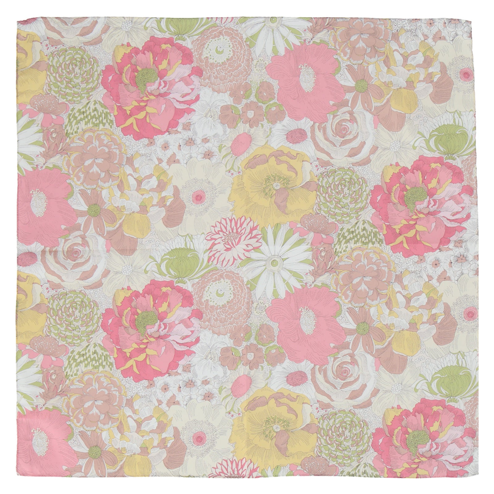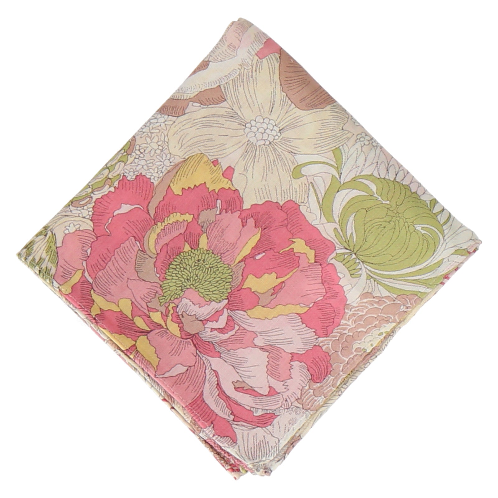 リバティプリントのハンカチ。繊細で肌触りのいい綿100%の生地に、華やかで目を惹く柄が印象的な1枚です。