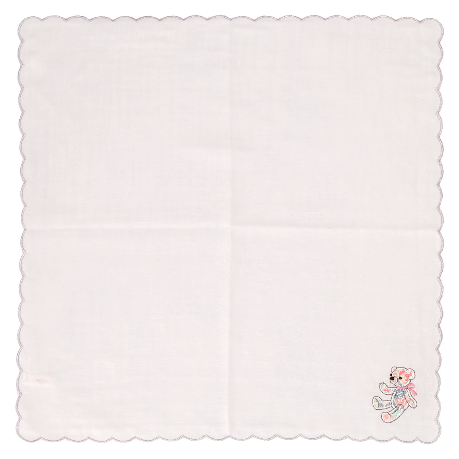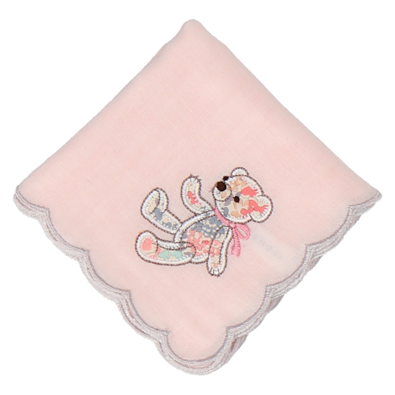 優しい肌触りが人気のガーゼハンカチ。リバティプリントを使用した可愛いベアのアップリケ刺繍とスカラップがポイントです。