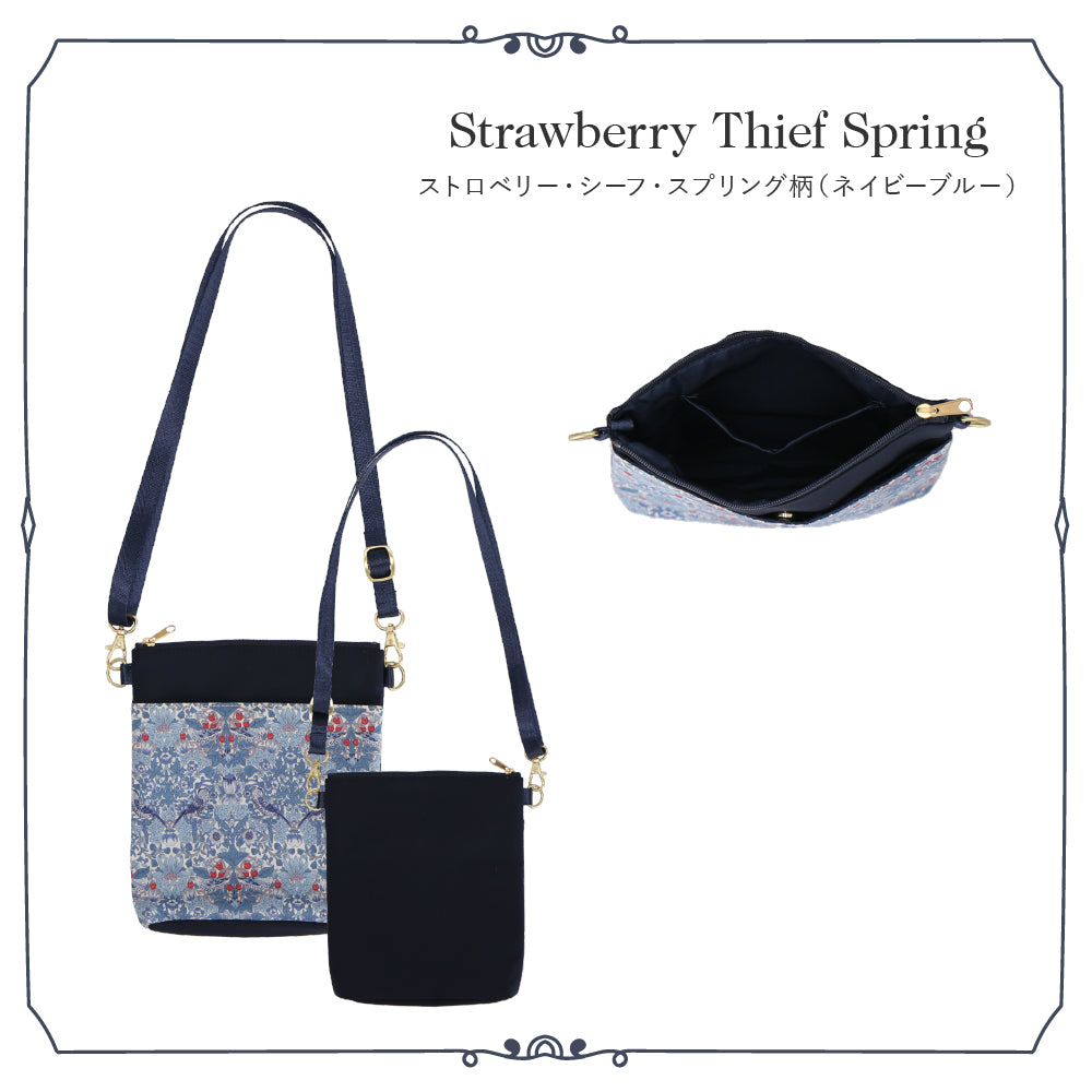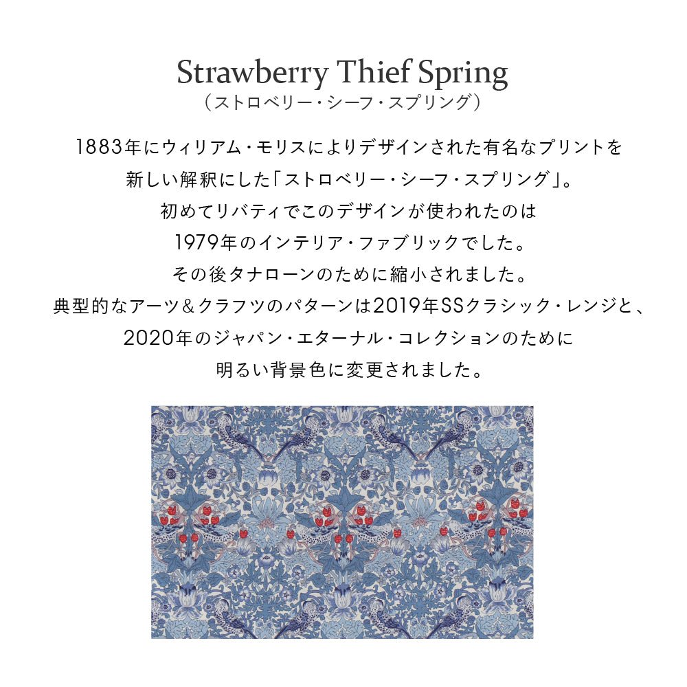 1883年にウィリアム・モリスによりデザインされた有名なプリントを新しい解釈にした「ストロベリー・シーフ・スプリング」。初めてリバティでこのデザインが使われたのは1979年のインテリア・ファブリックでした。その後タナローンのために縮小されました。典型的なアーツ&クラフツのパターンは2019年SSクラシック・レンジと、2020年のジャパン・エターナル・コレクションのために明るい背景色に変更されました。