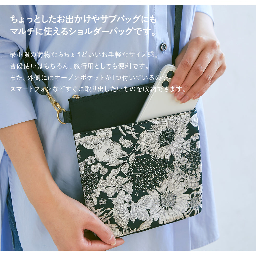 スマホやハンカチ、ポケットティッシュなどコンパクトなサイズ感ながら便利なミニショルダーポーチ。バッグ本体はファスナー付で、外ポケットもついており、使い勝手の良さが魅力。