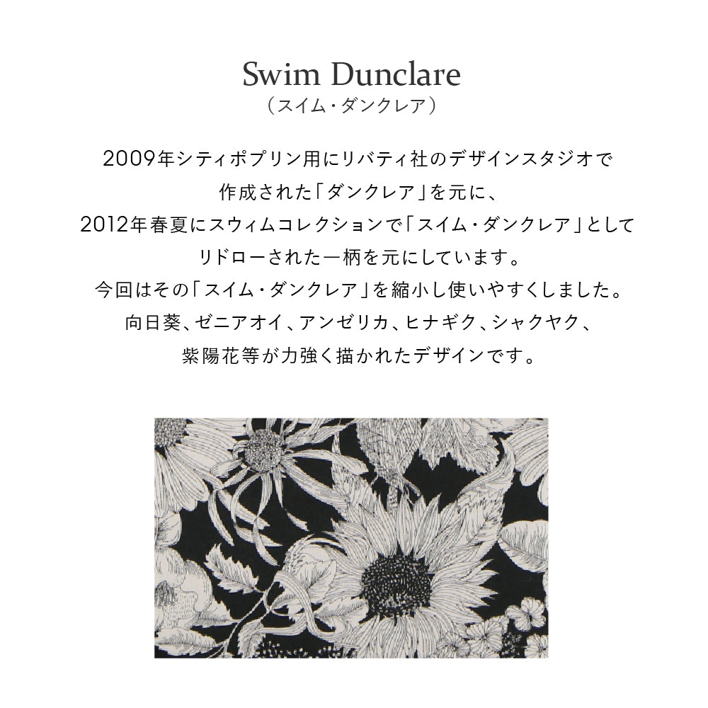 Swim Dunclare(スイム・ダンクレア)2009年シティポプリン用にリバティ社のデザインスタジオで作成された「ダンクレア」を元に、2012年春夏にスウィムコレクションで「スイム・ダンクレア」としてリドローされた一柄を元にしています。今回はその「スイム・ダンクレア」を縮小し使いやすくしました。向日葵、ゼニアオイ、アンゼリカ、ヒナギク、シャクヤク、紫陽花等が力強く描かれたデザインです。