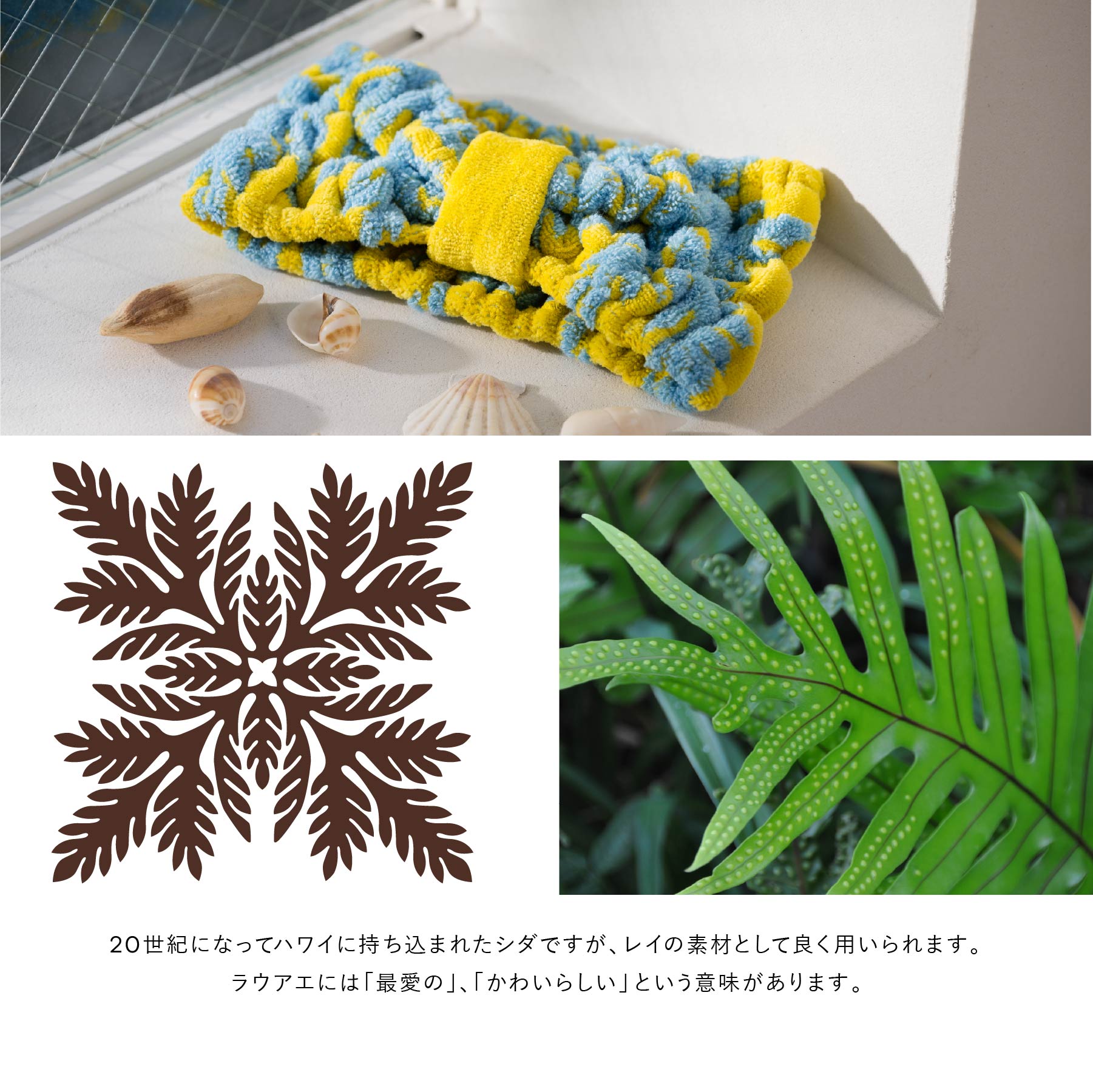 ラウアエ:20世紀になってハワイに持ち込まれたシダだが、レイの素材として良く用いられる。ラウアエには「最愛の」、「かわいらしい」という意味がある。