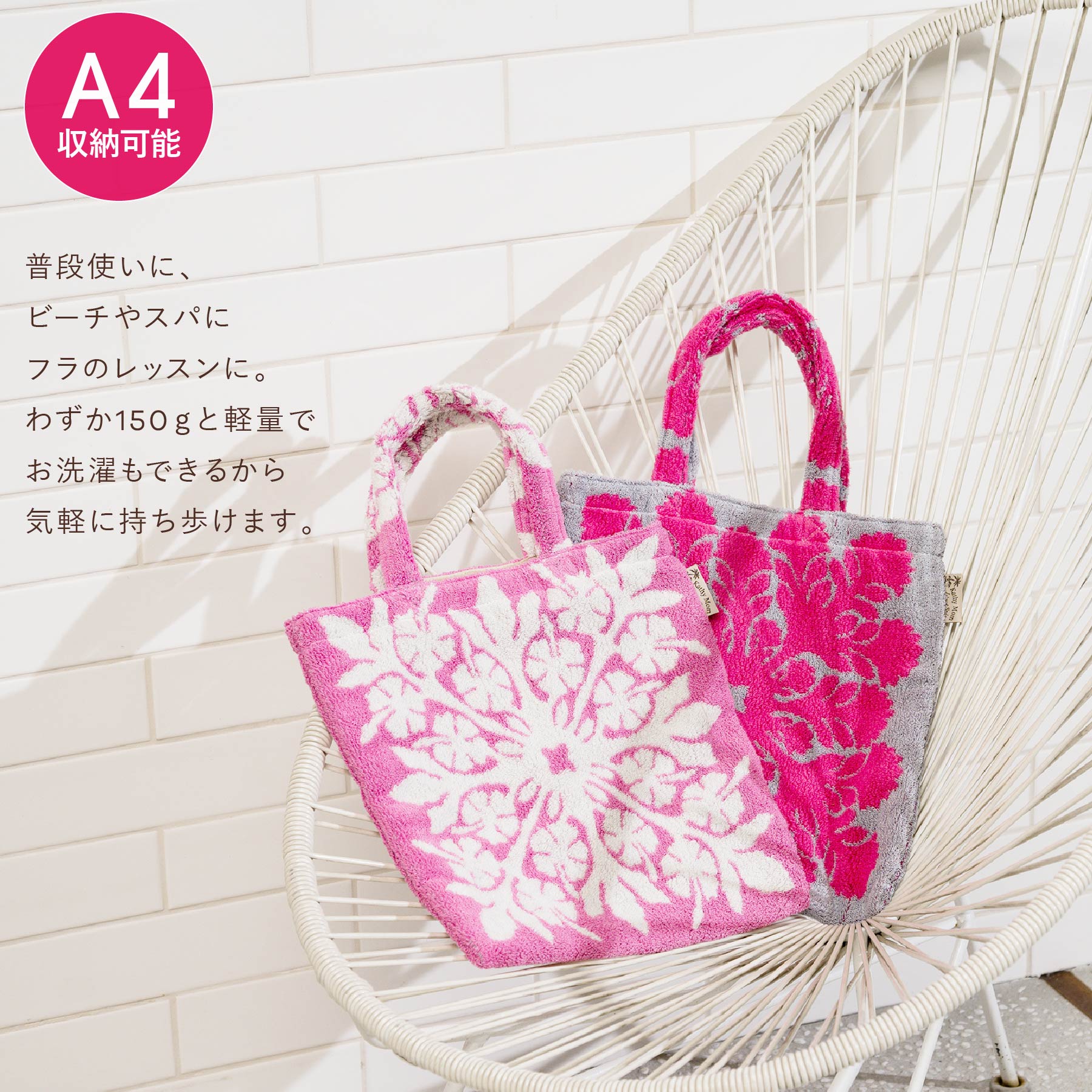 A4サイズ対応なので、レッスンバッグとしてもお使いいただけます。 内側にオープンポケットが付いているので、ロッカーキーなどすぐ取り出したい小物は分けて入れられます。 タオルだから汚れても気軽にお洗濯できるので安心です。(洗濯ネットをご使用ください)