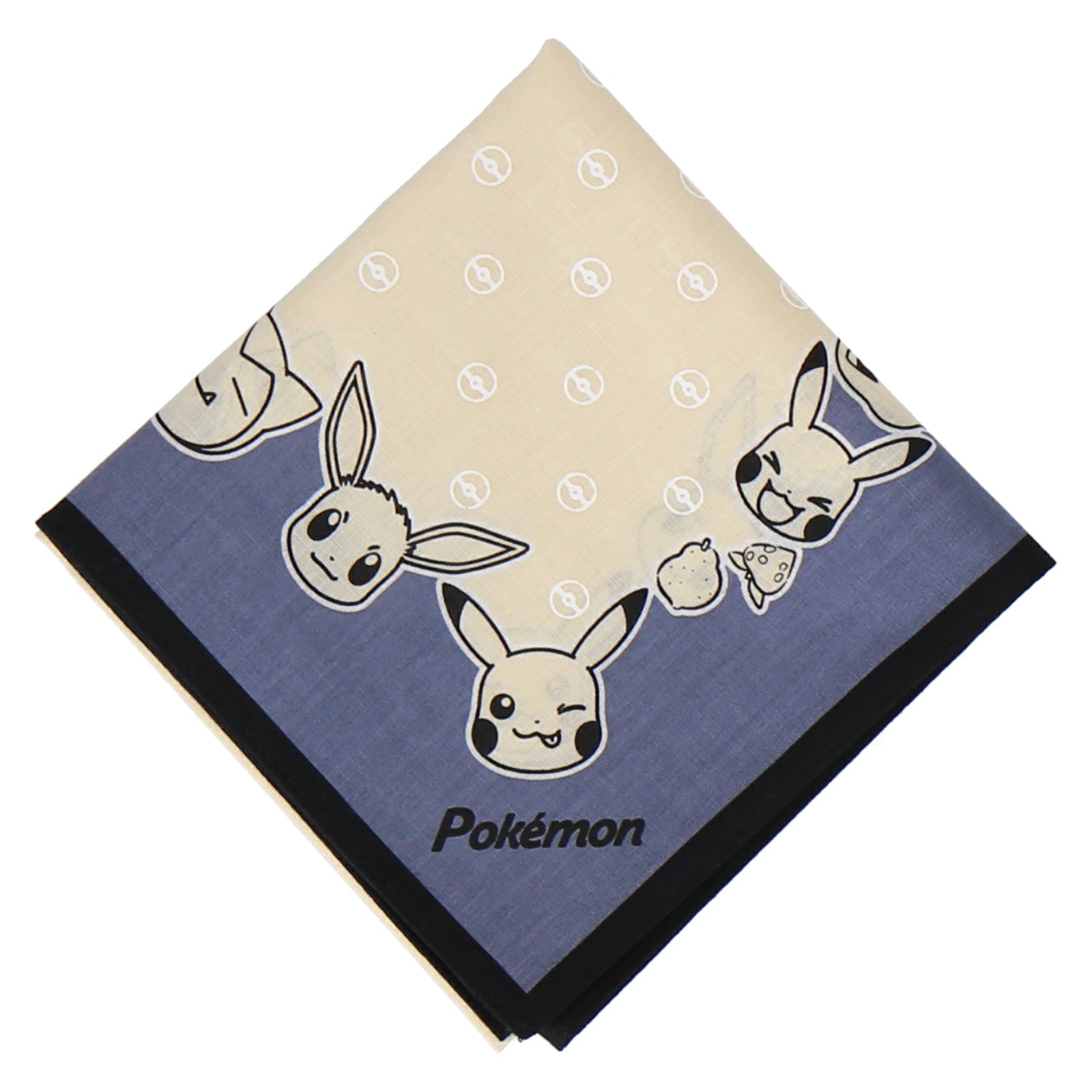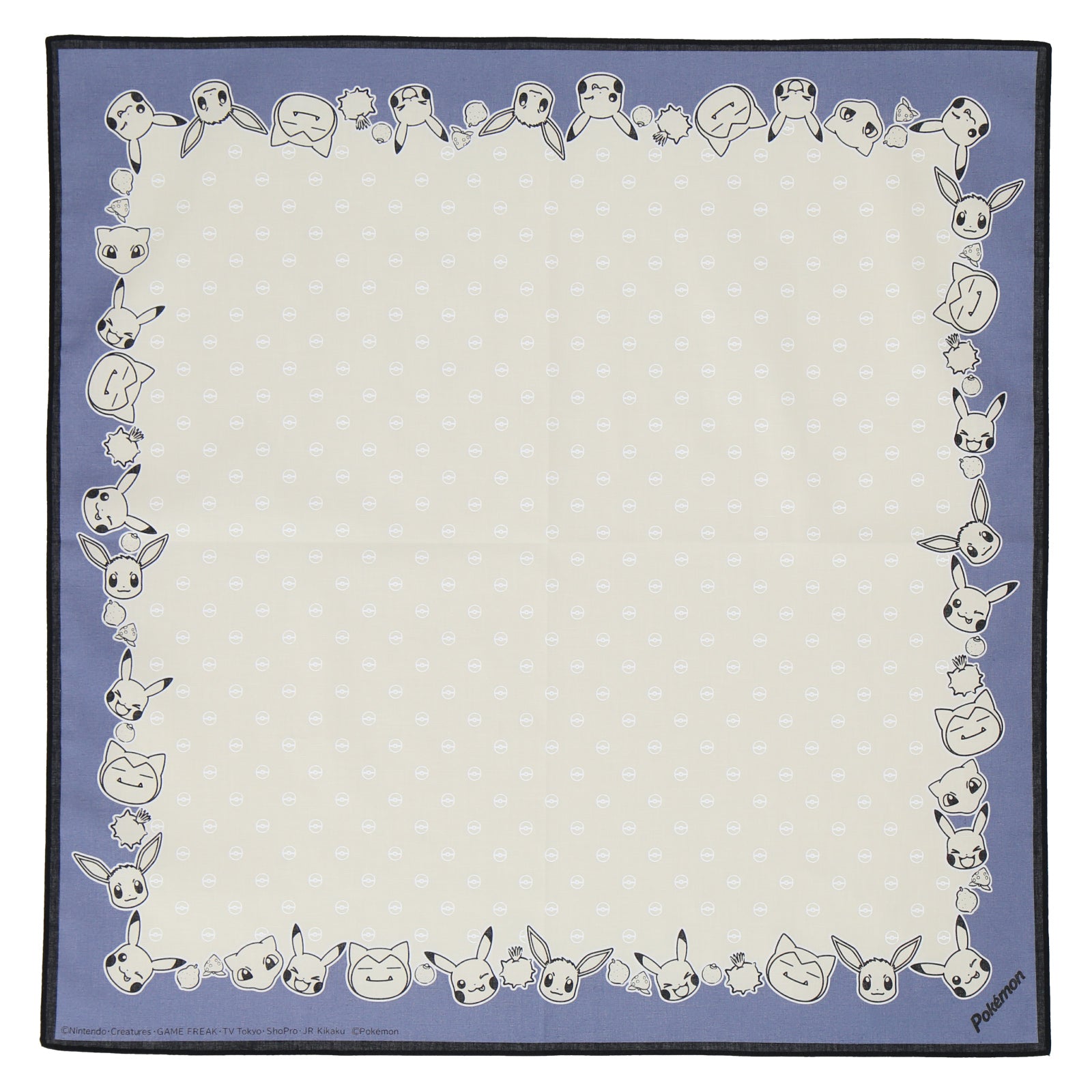 モンスターボールのドット柄に周りを囲んだポケモンたちがかわいいプリントハンカチ。 色んな用途で使える大きめの53㎝サイズ。