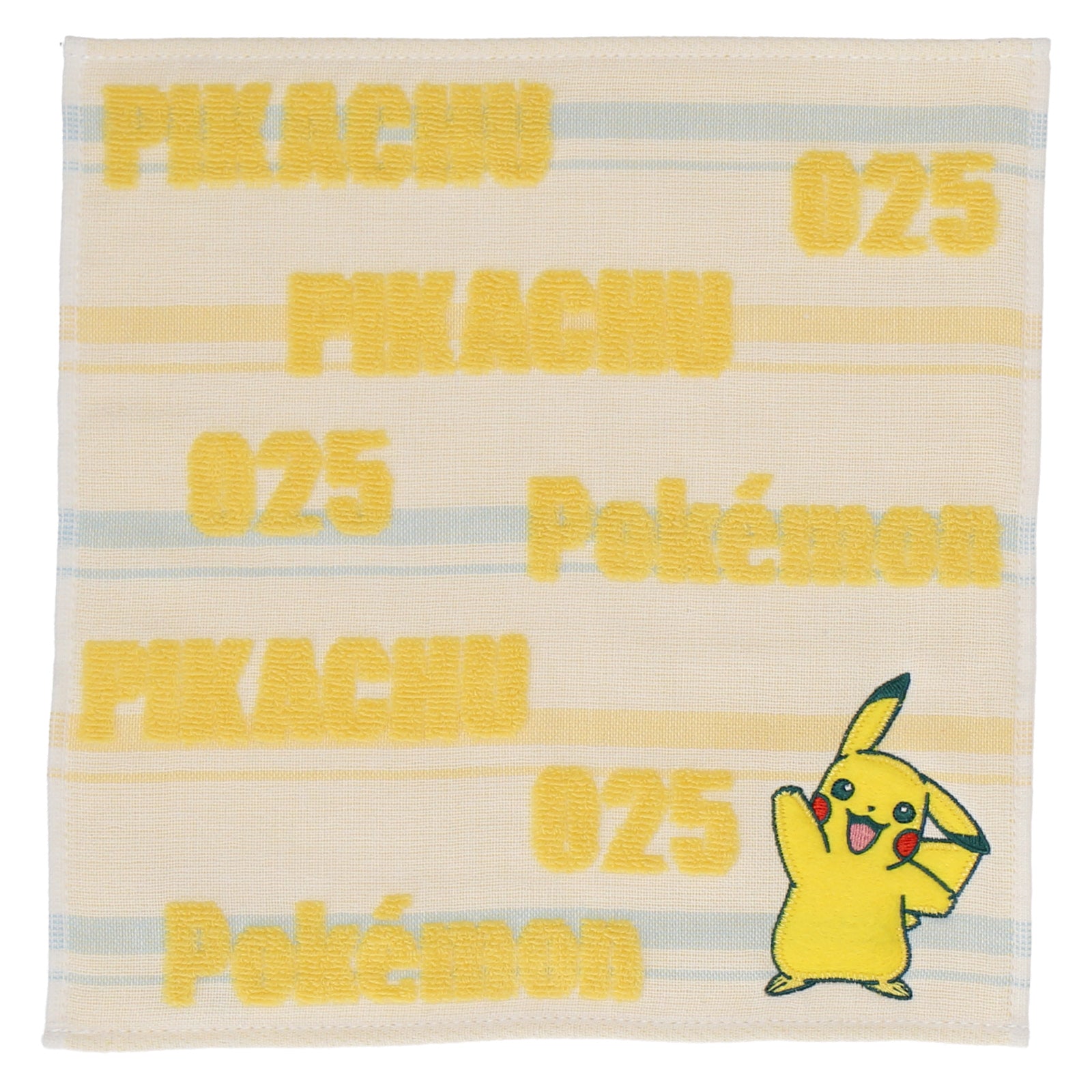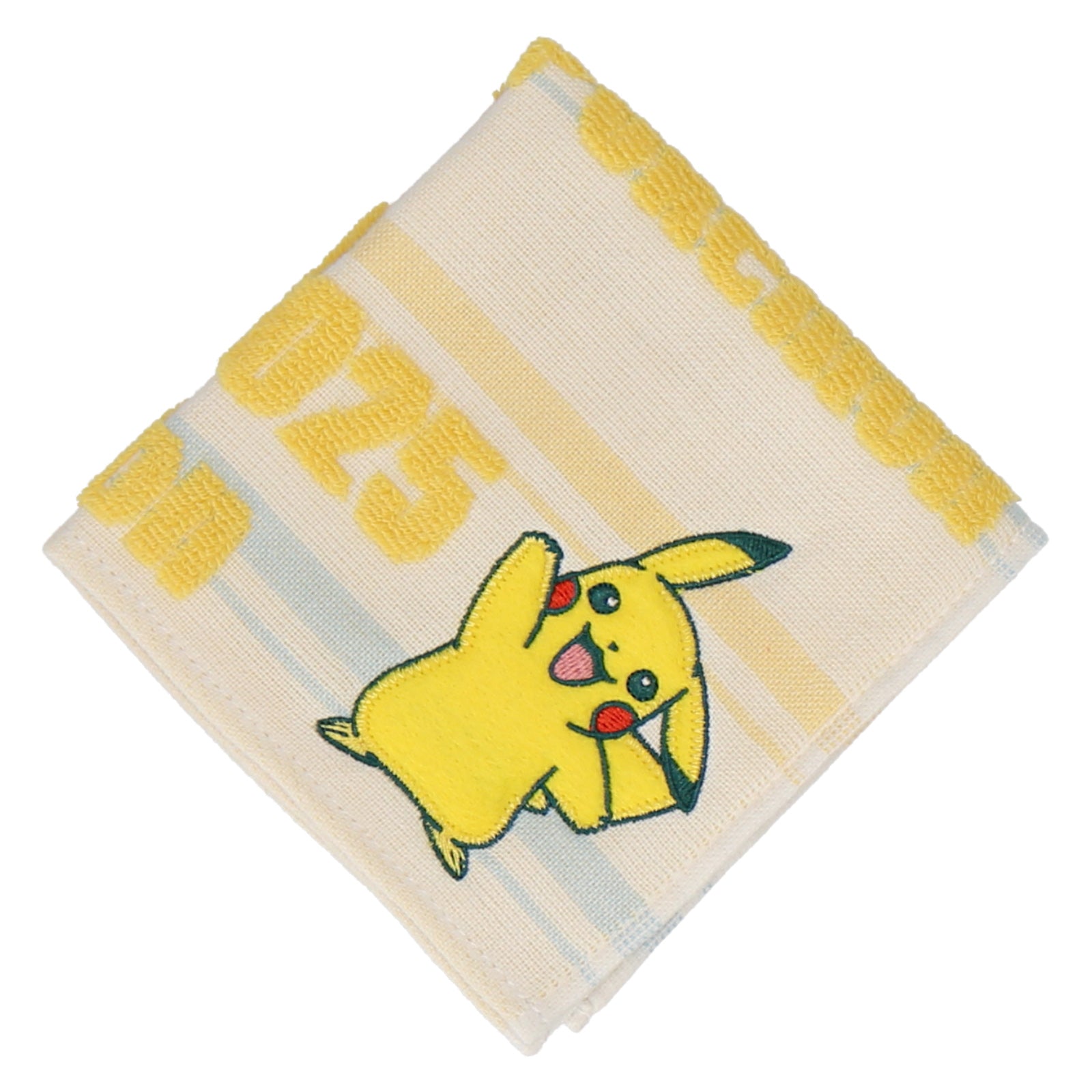 ボーダーにロゴがパイルで浮き出たタオルハンカチ。 ピカチュウ,のアップリケ刺繍がポイント。