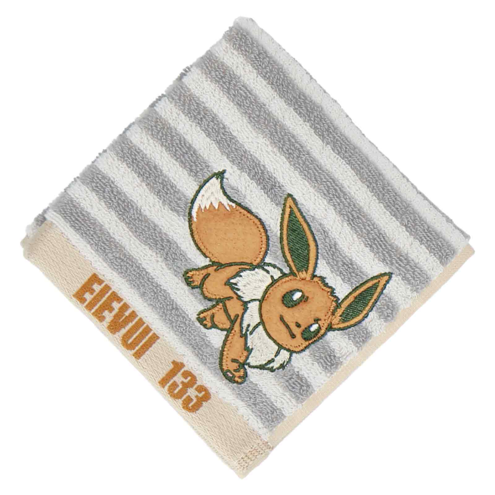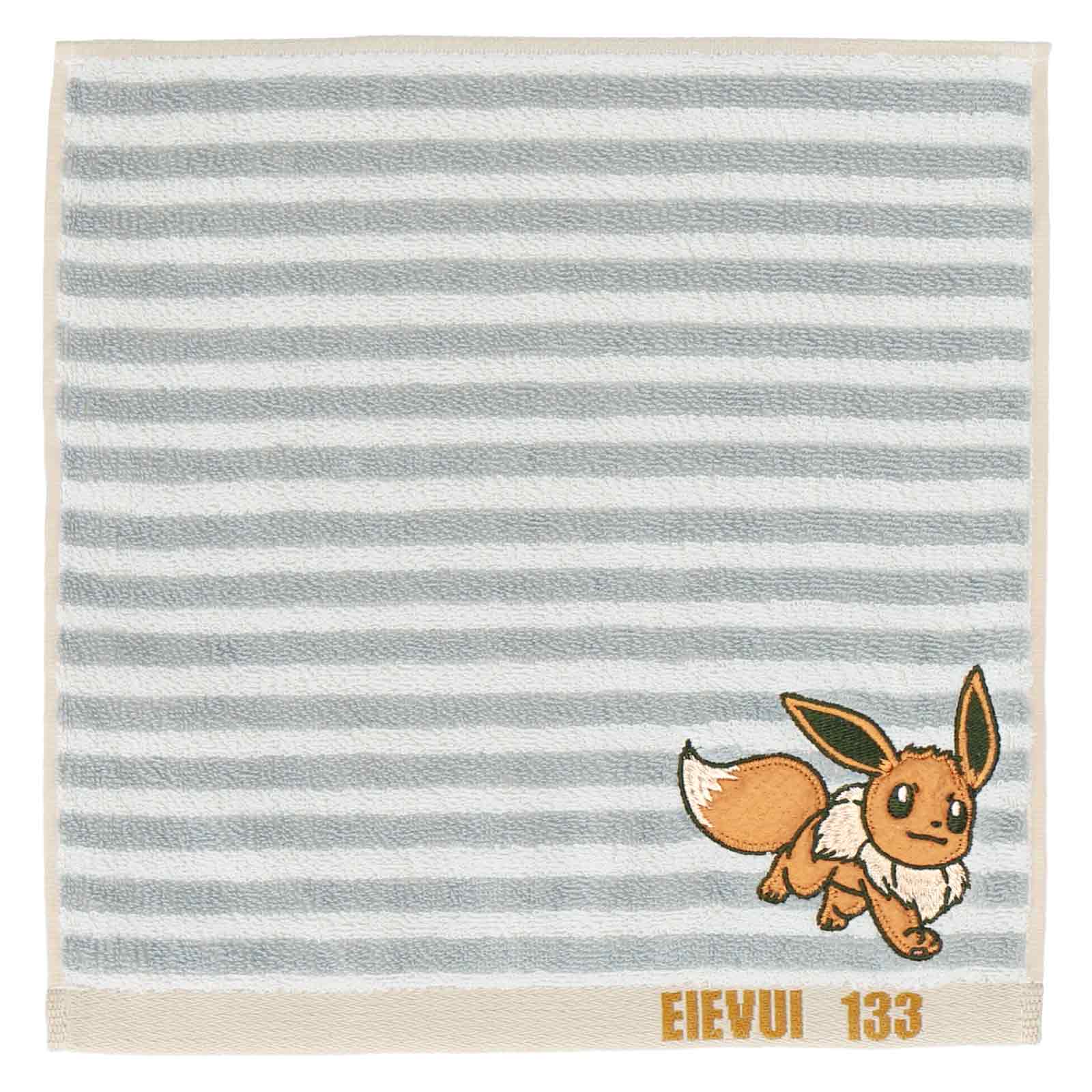 ボーダーにイーブイのアップリケ刺繡が施されたタオルハンカチ。 ロゴ入りの朱子ヘムもポイント。