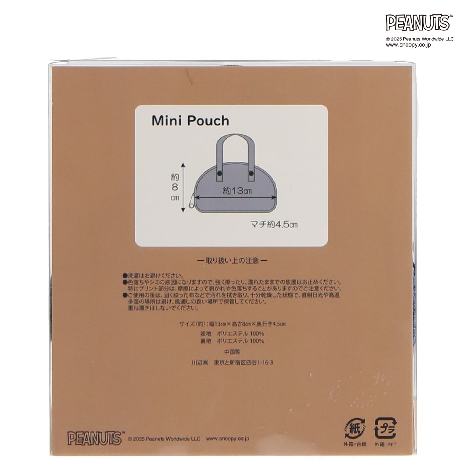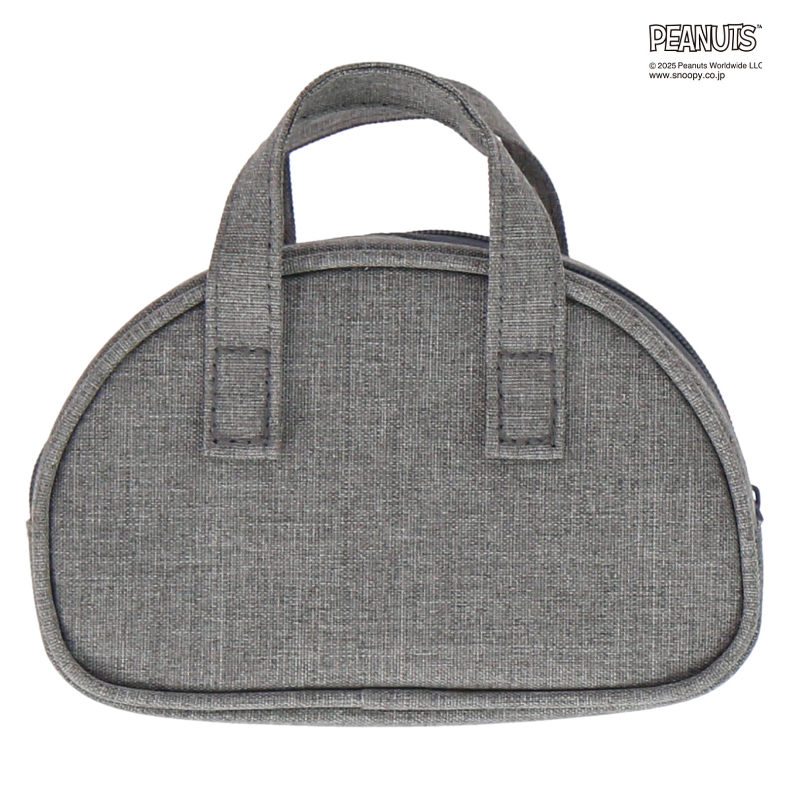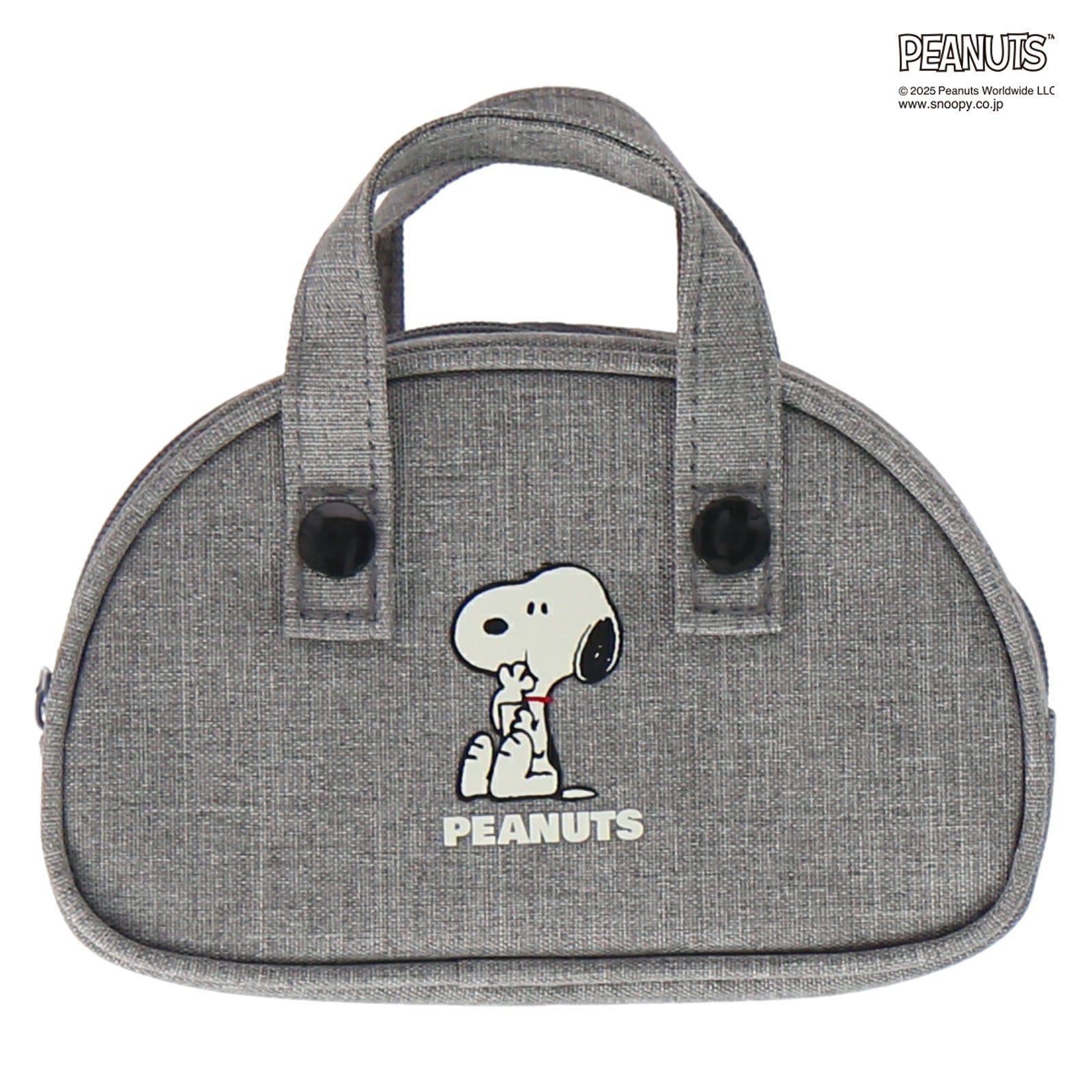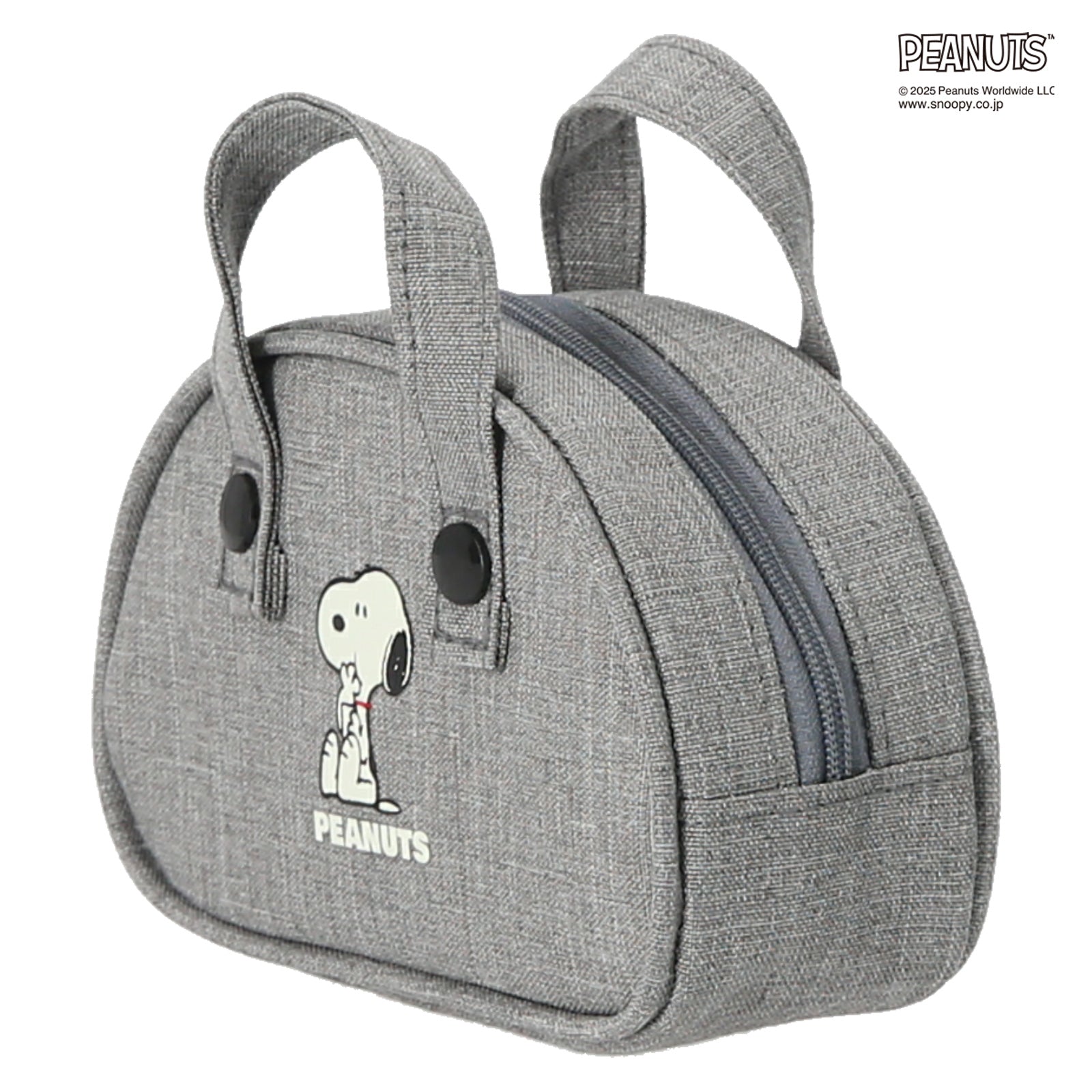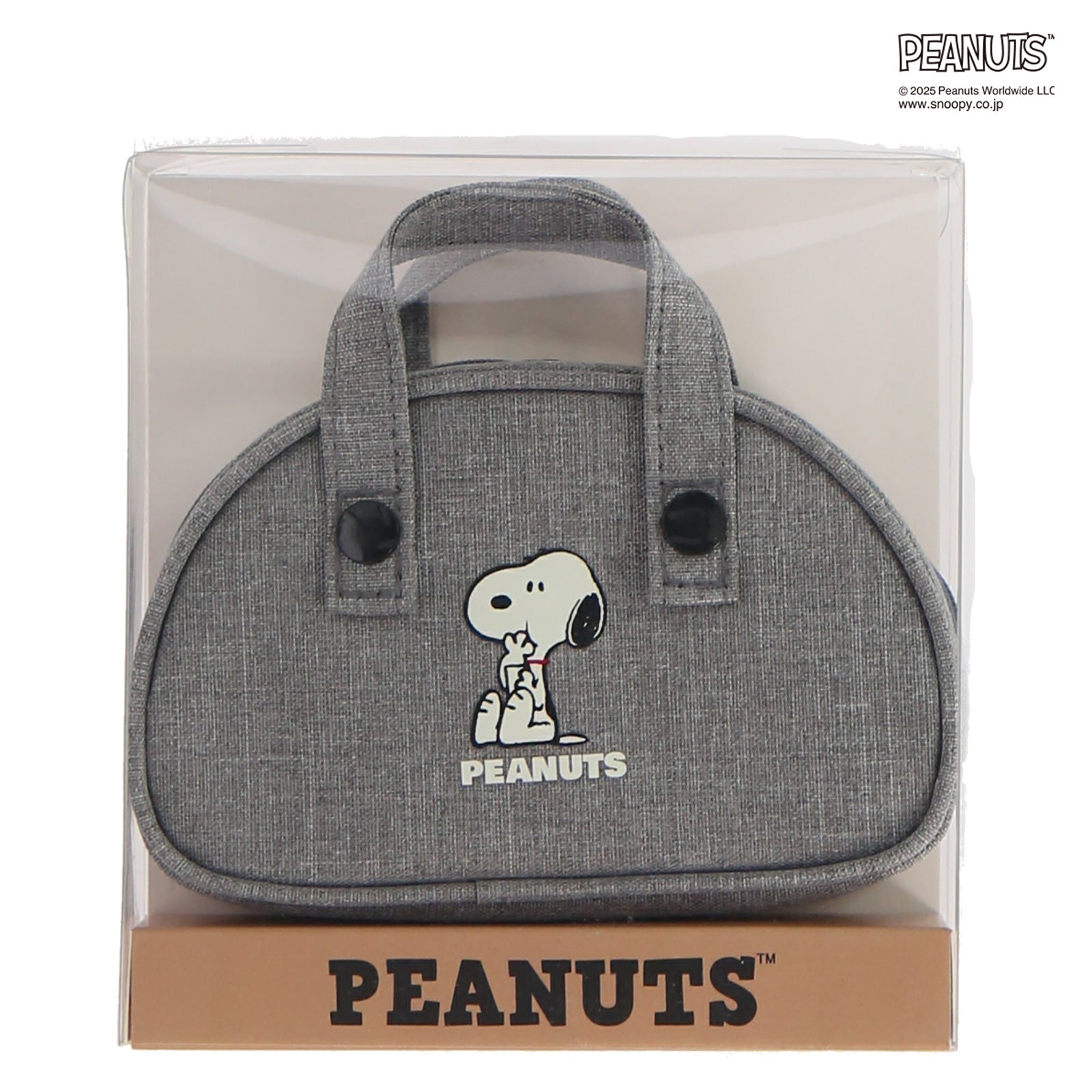 モグモグしたスヌーピーのイラストがプリントされたボストンバッグ型の可愛らしいミニサイズのポーチ。コスメや小物の収納にぴったりです。箱入りでギフトにもおすすめです。