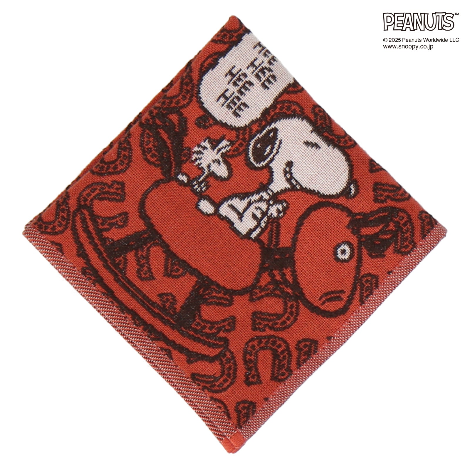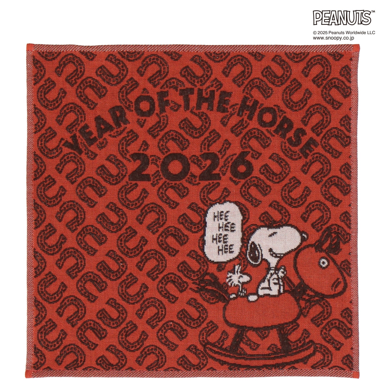 2026年のウマ年にぴったりな、馬にまたがるスヌーピーの遊び心あるデザインのガーゼハンカチです。柔らかな肌触りと、使い易いサイズ感が魅力のひとつです。