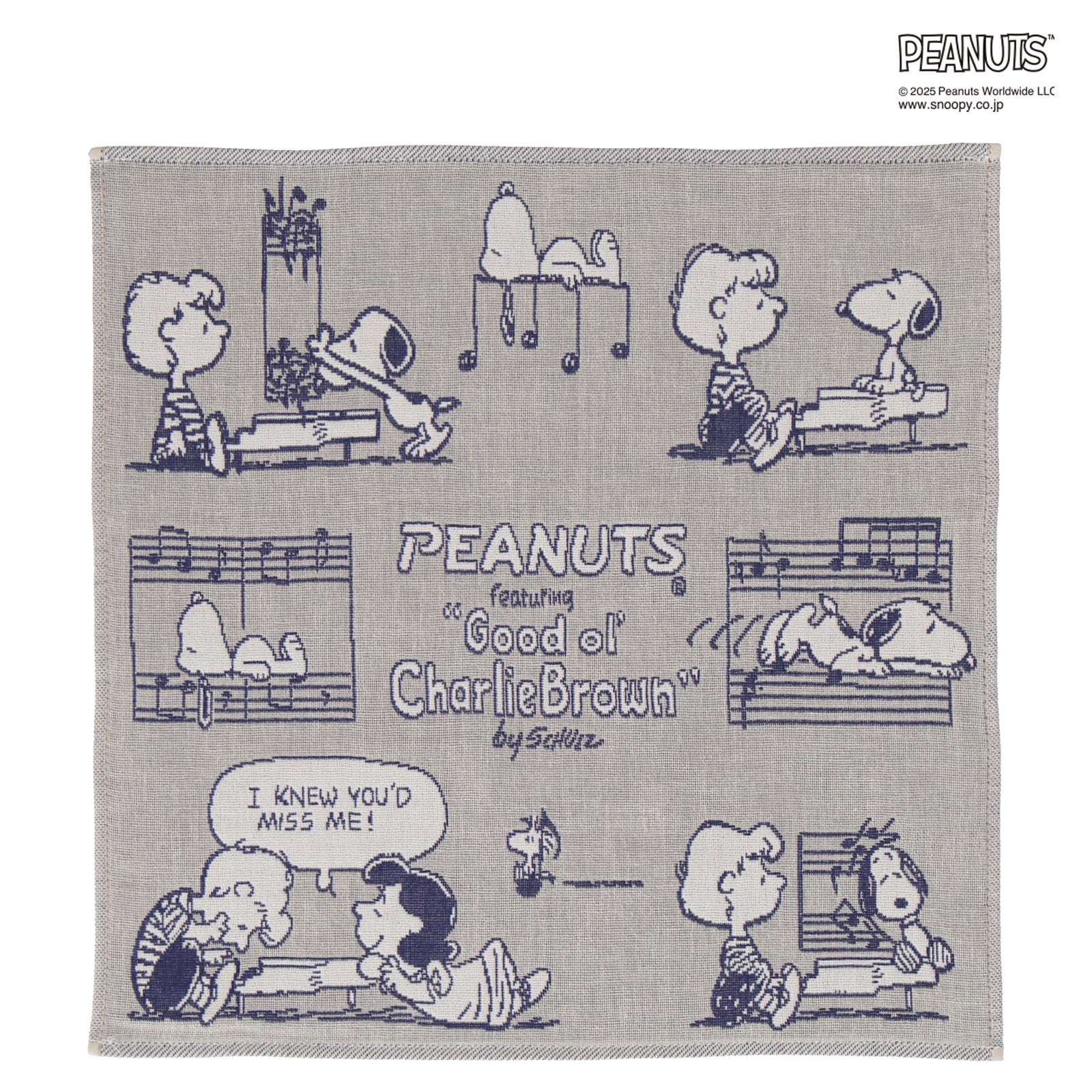 音符で遊んでいるスヌーピーが可愛らしい3重ガーゼハンカチ。プレゼントにもおすすめです。