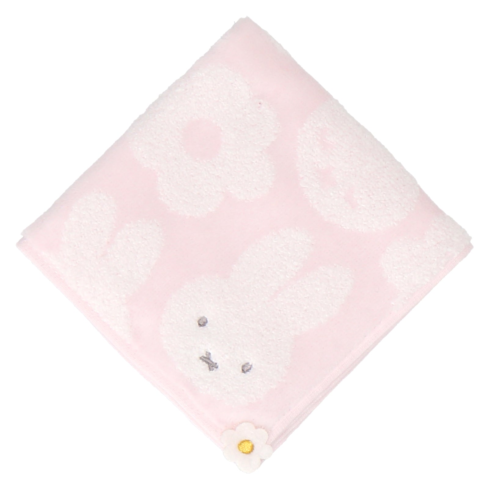 ミッフィーとお花の総柄がかわいいタオルハンカチ。ふんわりした肌触りとやさしい色合いがマッチした一枚です。お花のアップリケ刺繡もポイント。