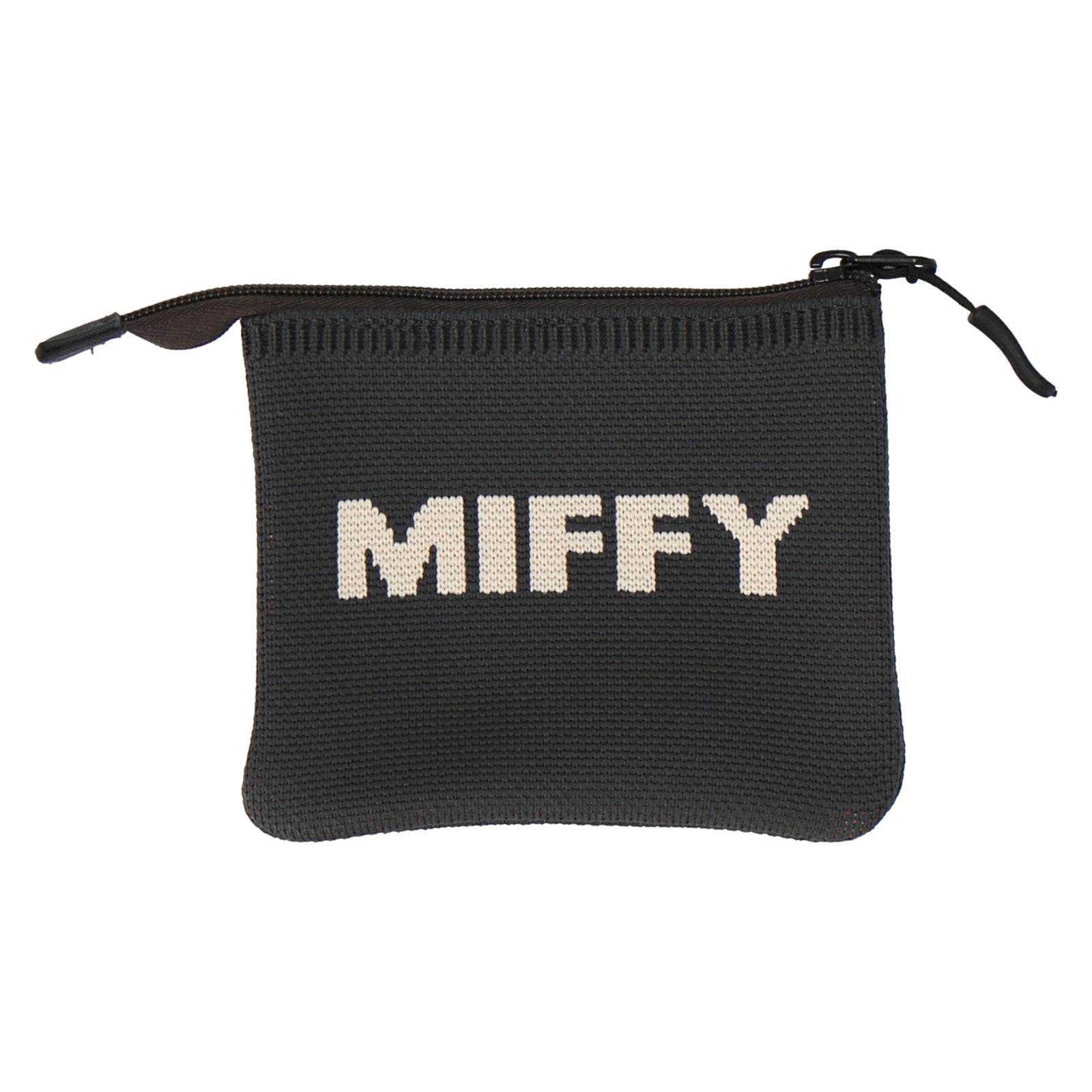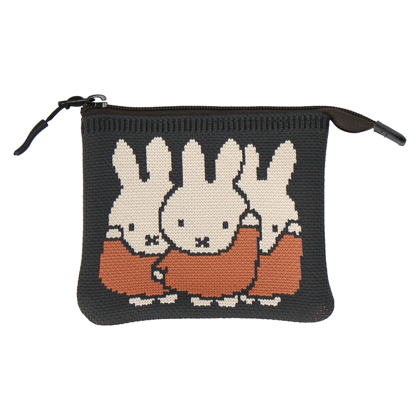 ミッフィーの絵本のワンシーンがデザインされたニットフラットポーチ。背面にはMIFFYのロゴ入り。コスメや小物の収納にぴったりです。箱入りでギフトにもおすすめ。