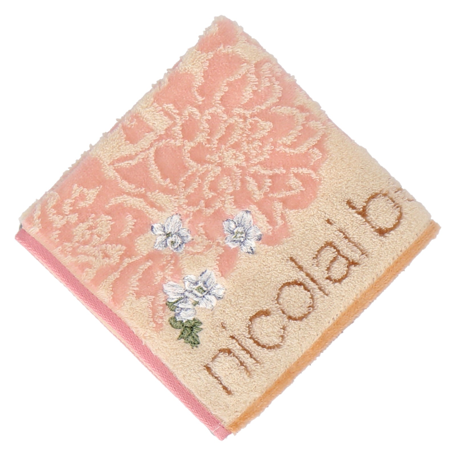 フリルのような花びらが美しいローズ(ラロック)とクリスマスローズを組み合わせリースが立体的で、リズミカルに構成したデザイン。 コーナー部分の刺繍がアクセントになっています。 風合いのいいコットン素材のミニタオルはギフトにもおすすめです。