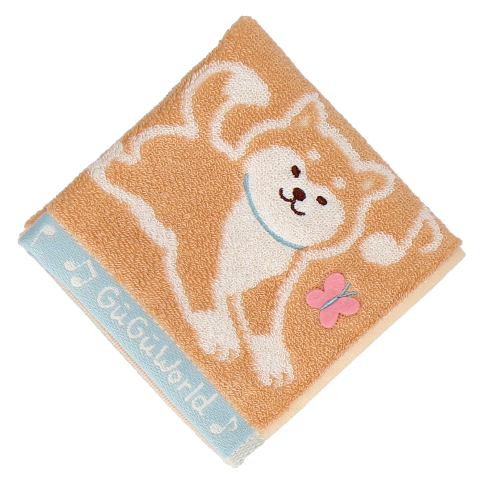 表情豊かな柴犬の姿が愛らしいタオルハンカチ。ちょうちょのアップリケ刺繡がポイントです。プチギフトにもおすすめ。